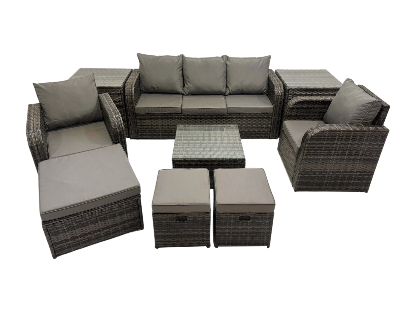 Rattan Gartenmöbel Set im Balkon 8-Sitzer Garten Sofa Set mit Quadratischer Couchtisch 2 Beistelltischen 3 Hockern