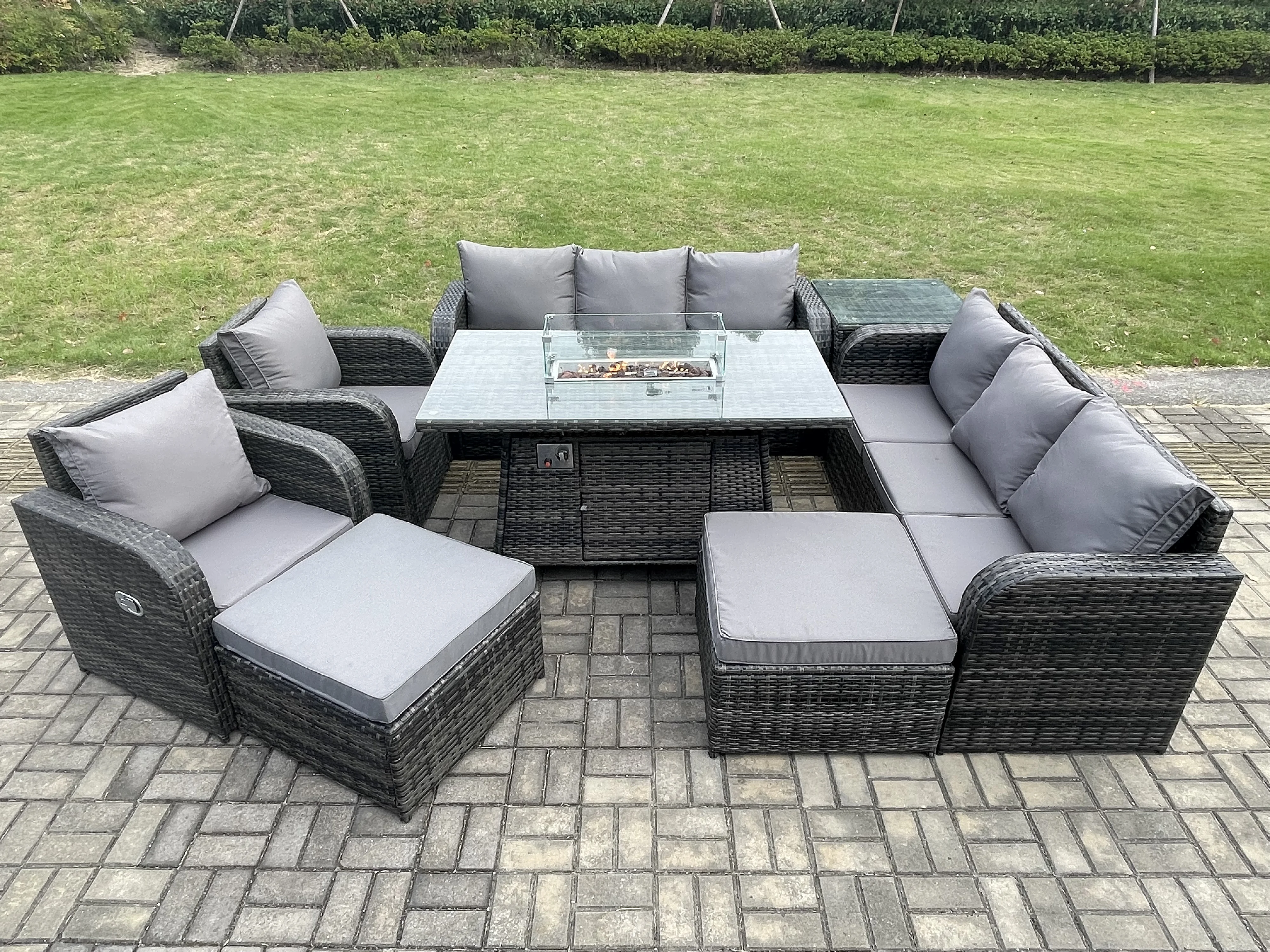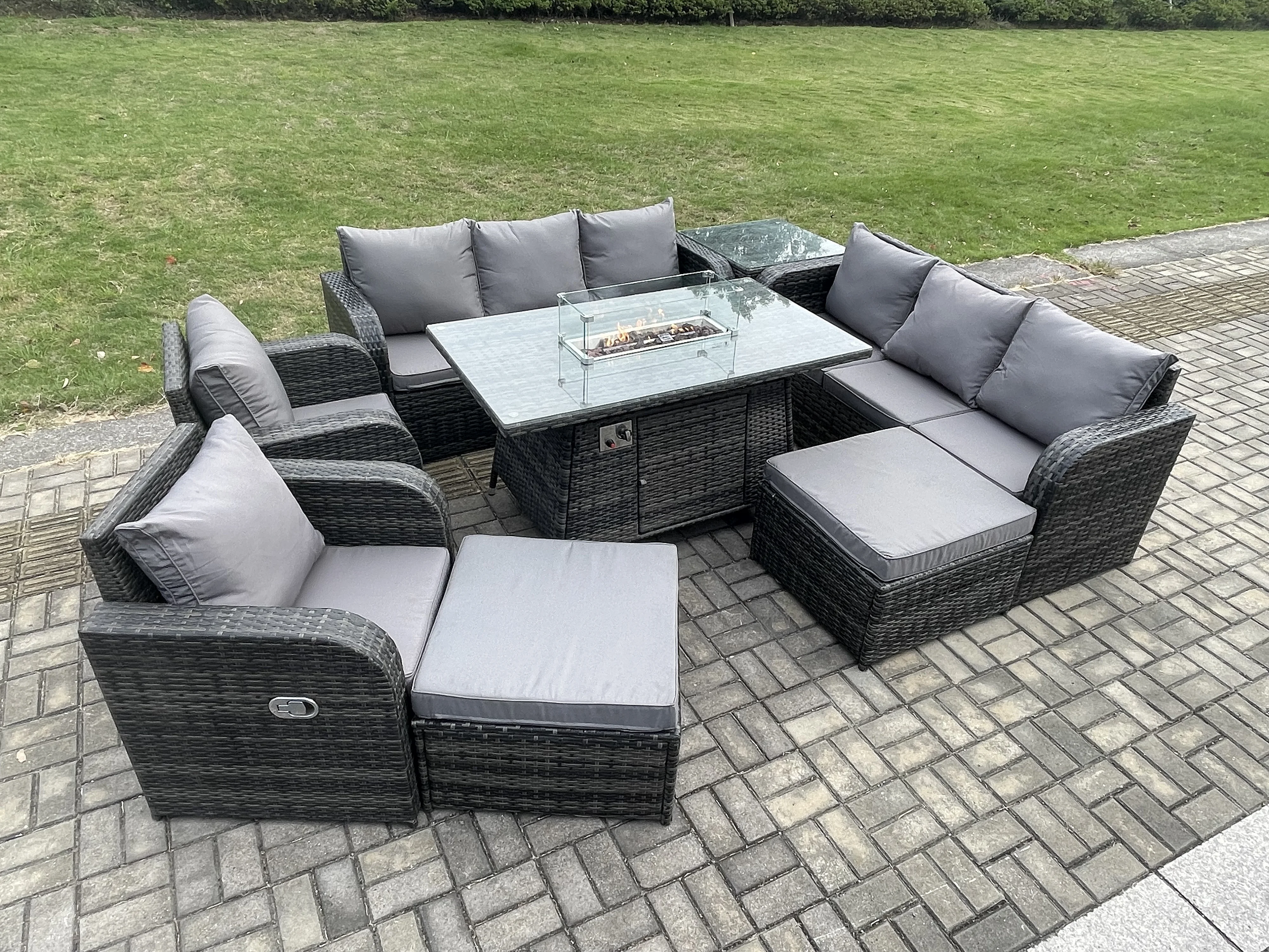 Rattan Gartenmöbel Set im Balkon Gas Feuerstelle Tisch Adjustable Liegestühle 3-Sitzer Sofa Sets 10-Sitzer