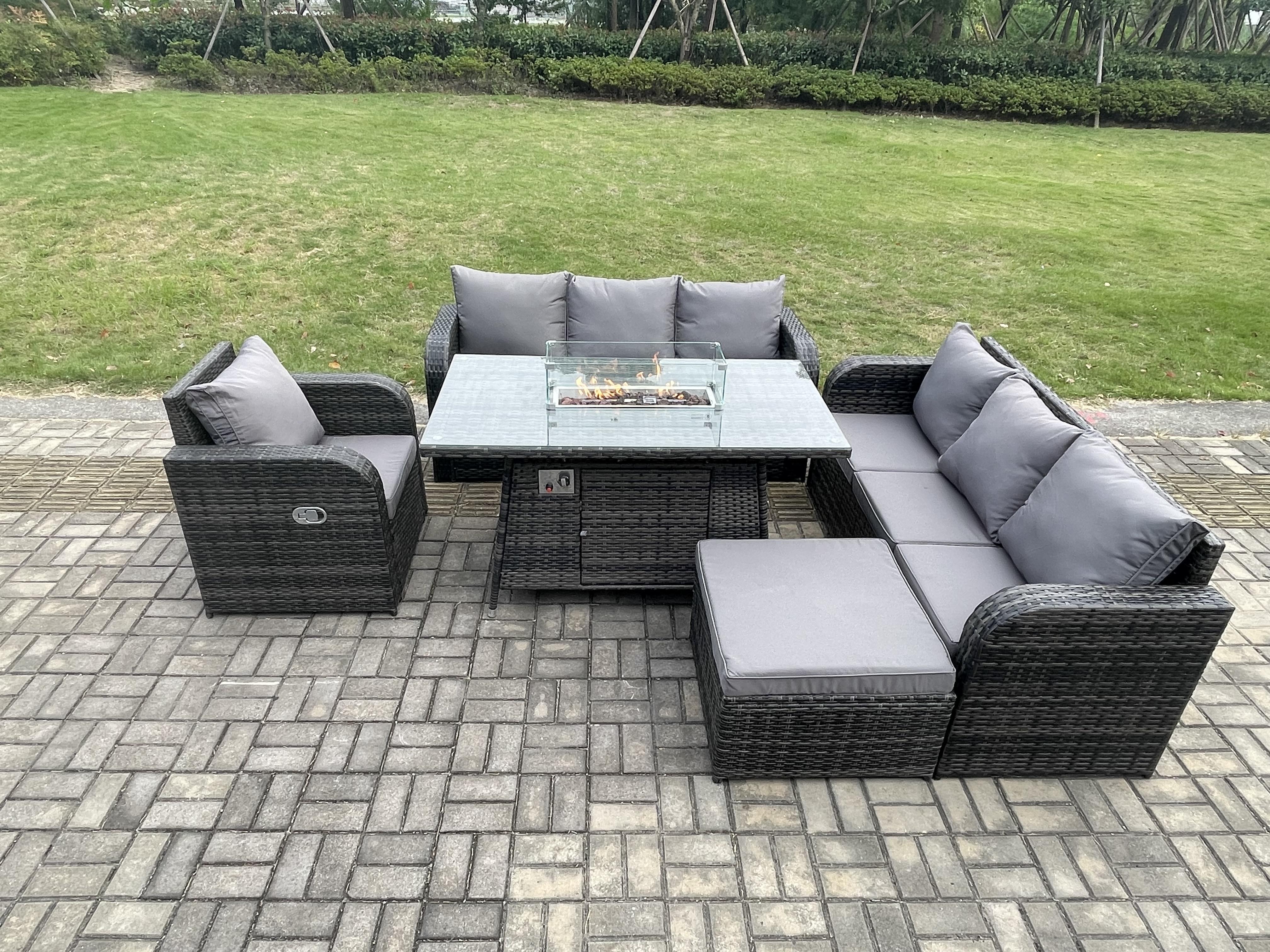 Rattan Gartenmöbel Set im Balkon Gas Feuerstelle Tisch Liegestühle 3-Sitzer Sofa Sets mit 2 Großer Hockern 8-Sitzer