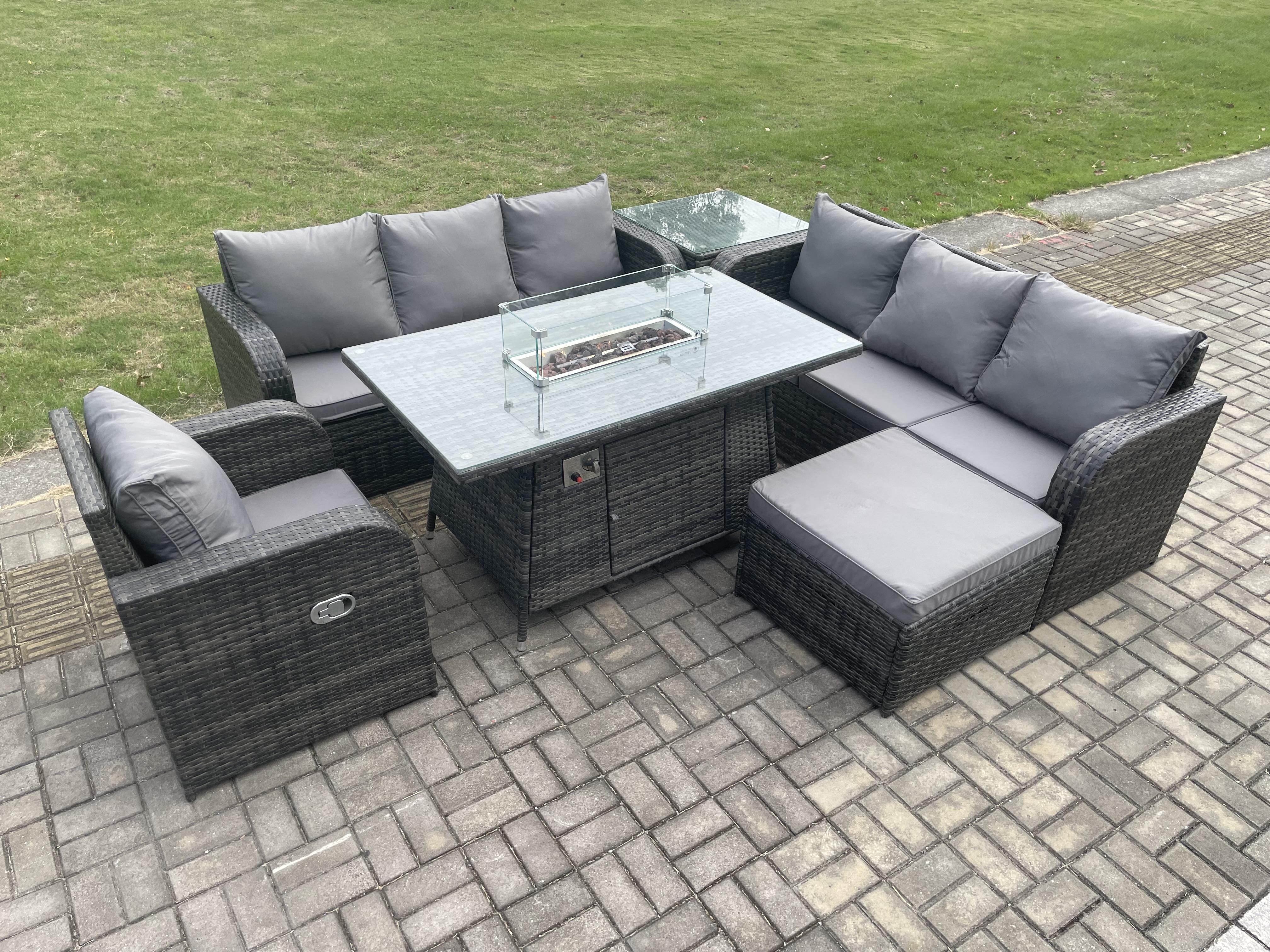 Rattan Gartenmöbel Set im Balkon Gas Feuerstelle Tisch Liegestühle 3-Sitzer Sofa Sets mit 2 Großer Hockern Beistelltisch 8-Sitzer