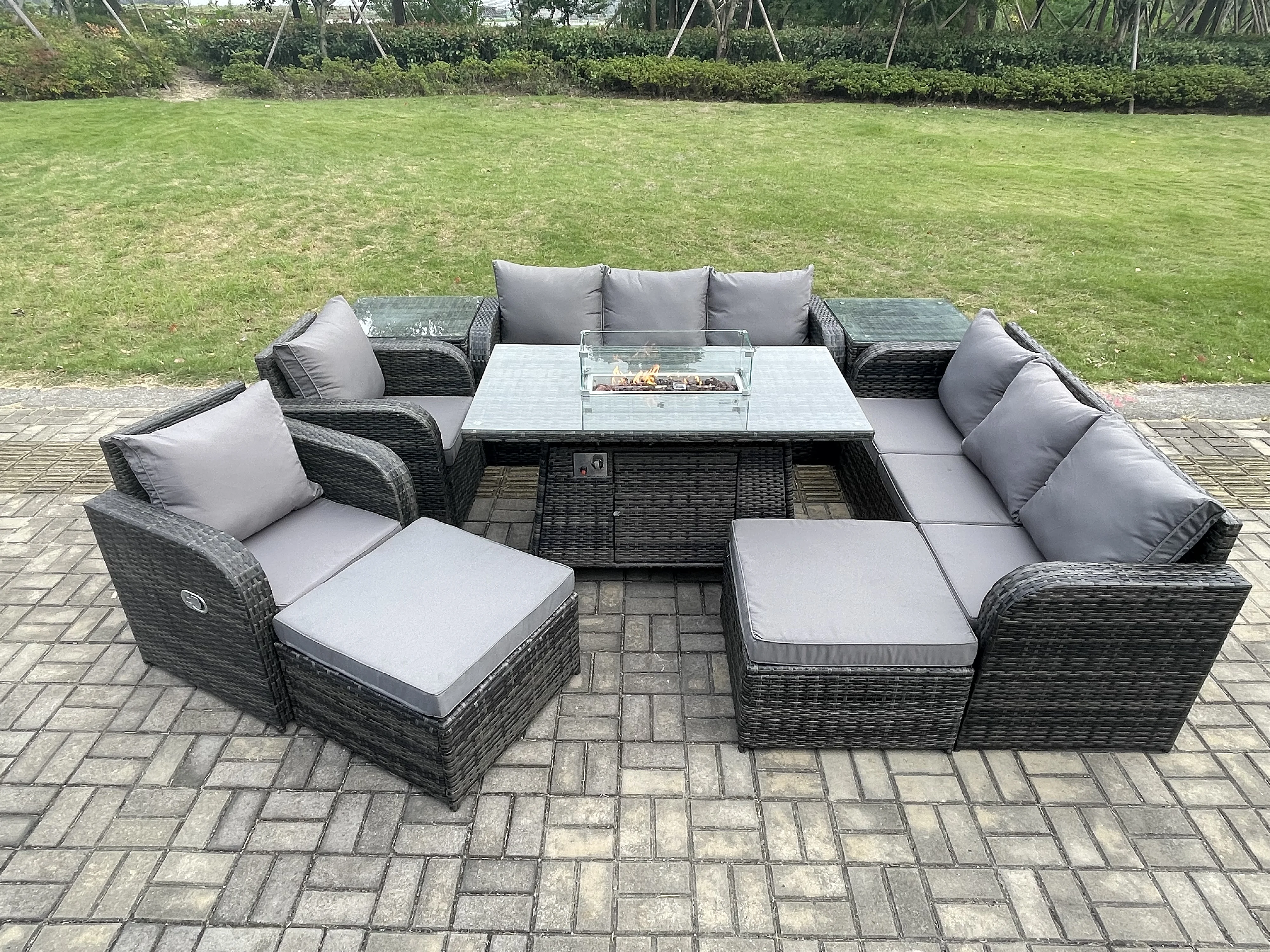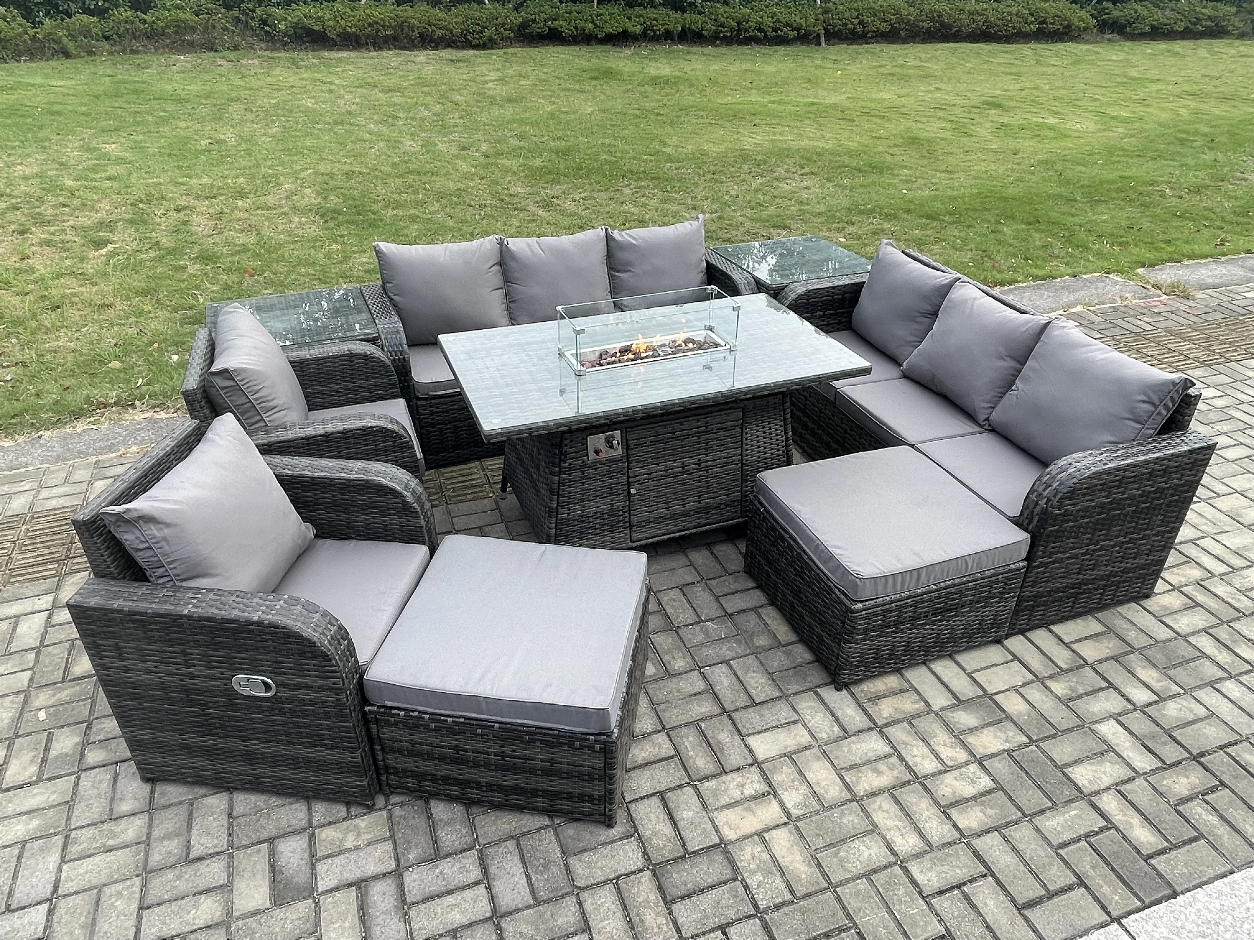 Rattan Gartenmöbel Set im Balkon Gas Feuerstelle Tisch Liegestühle 3-Sitzer Sofa Sets mit Beistelltisch 10-Sitzer