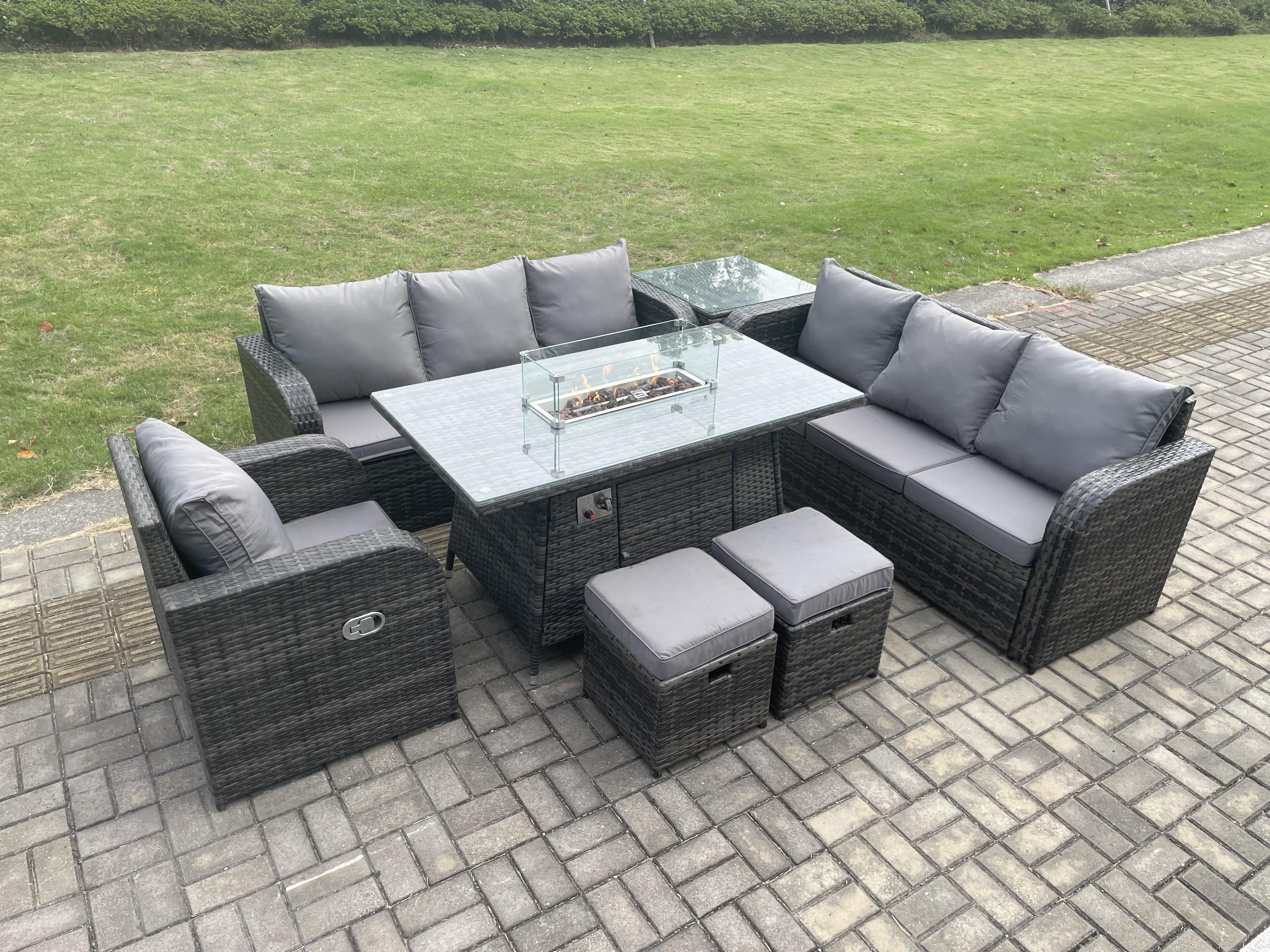 Rattan Gartenmöbel Set im Balkon Gas Feuerstelle Tisch Liegestühle 3-Sitzer Sofa Sets mit Beistelltisch 2 kleine Fußhockern 9-Sitzer
