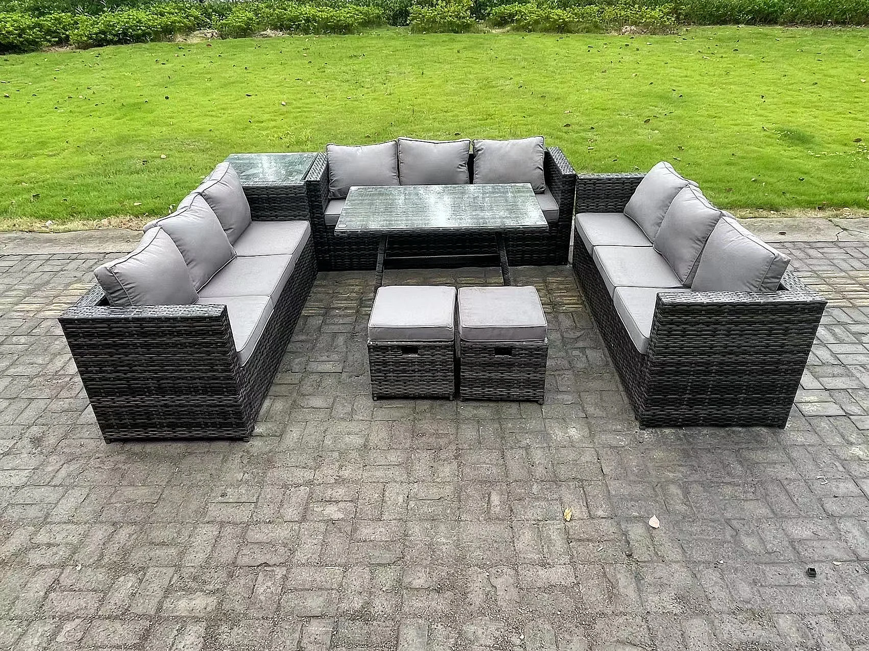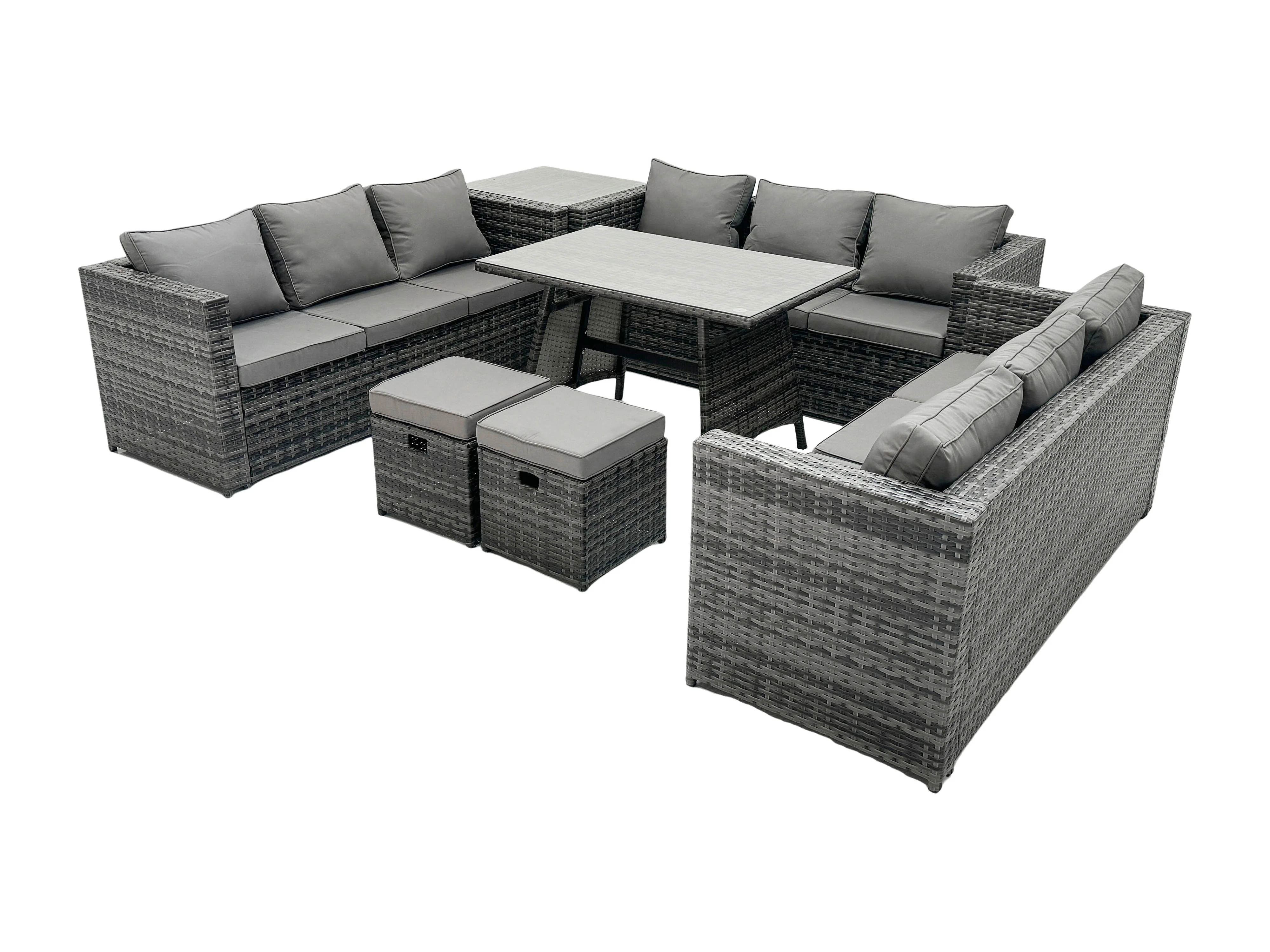 Rattan Gartenmöbel Set im Balkon Lounge Sofa Garten Esstisch Set mit Beistelltisch 2 kleine Fußhockern 11-Sitzer Dunkelgrau Gemischt