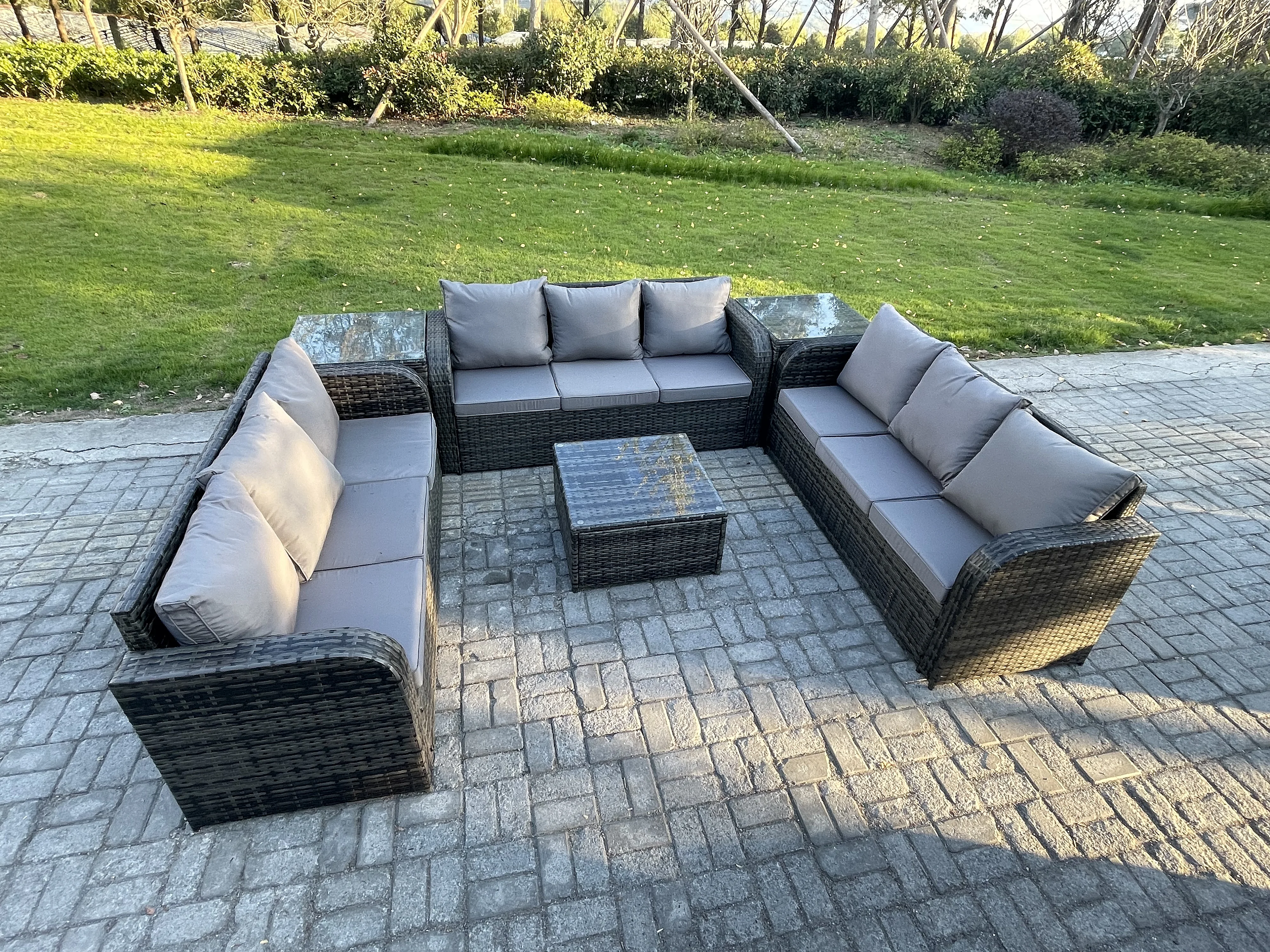 Rattan Gartenmöbel Set im Balkon Set Patio Garten Sofa Set mit 2 Beistelltisch Quadratischer Couchtisch Dunkelgrau Gemischt