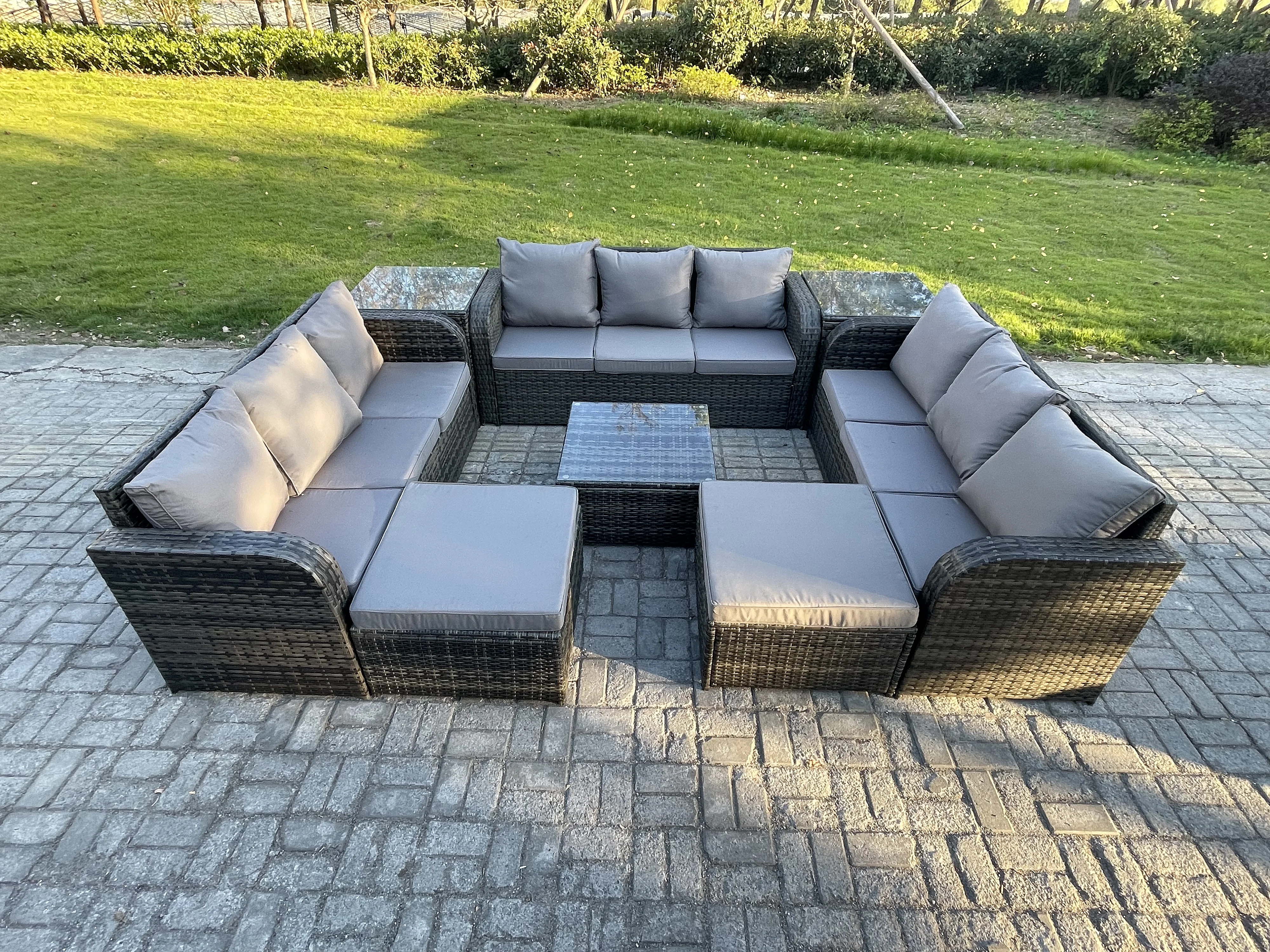 Rattan Gartenmöbel Set im Balkon Set Patio Garten Sofa Set mit Quadratischer Couchtisch 2 hohen Hockern 2 Beistelltischen Dunkelgrau Gemischt