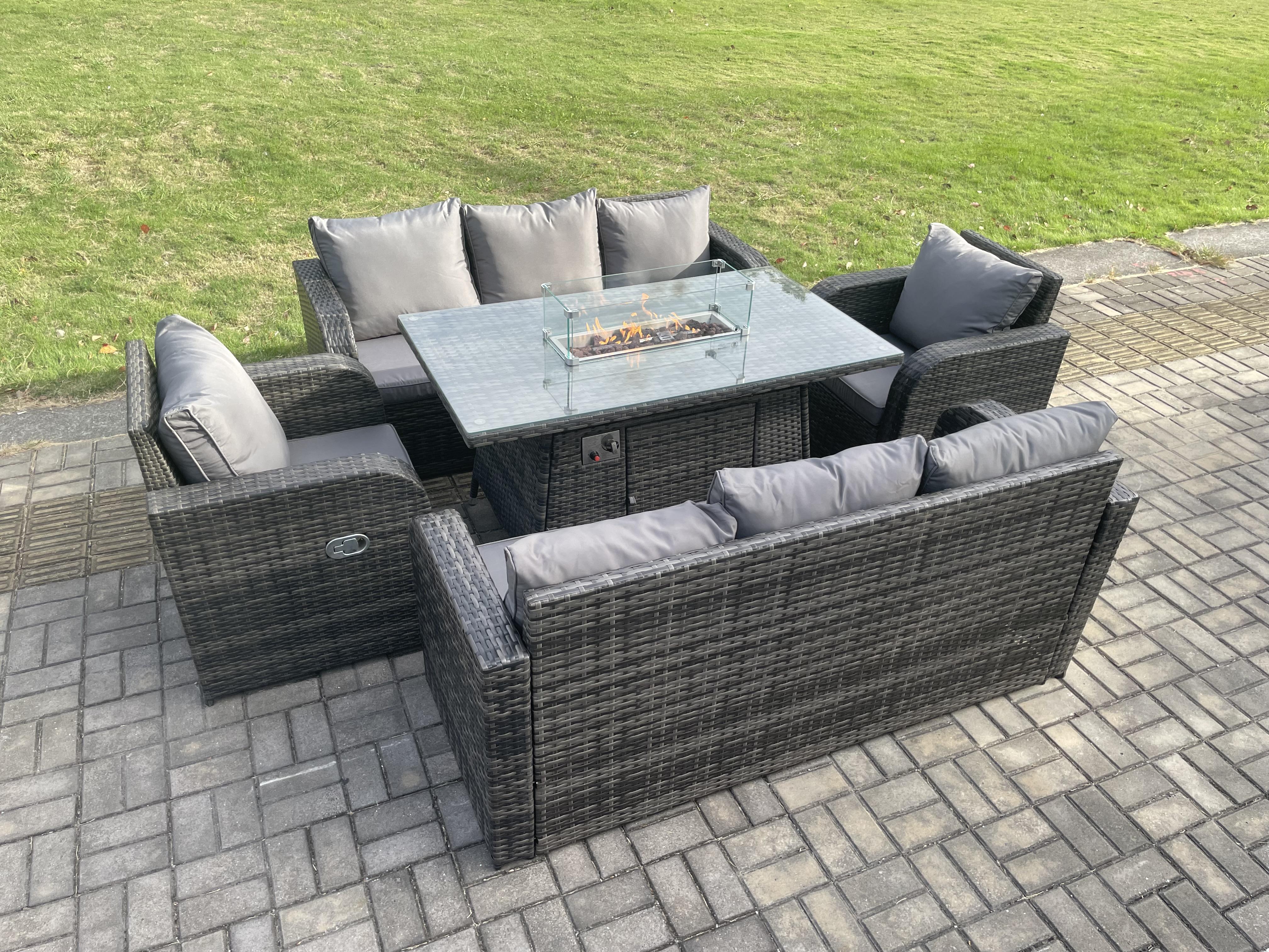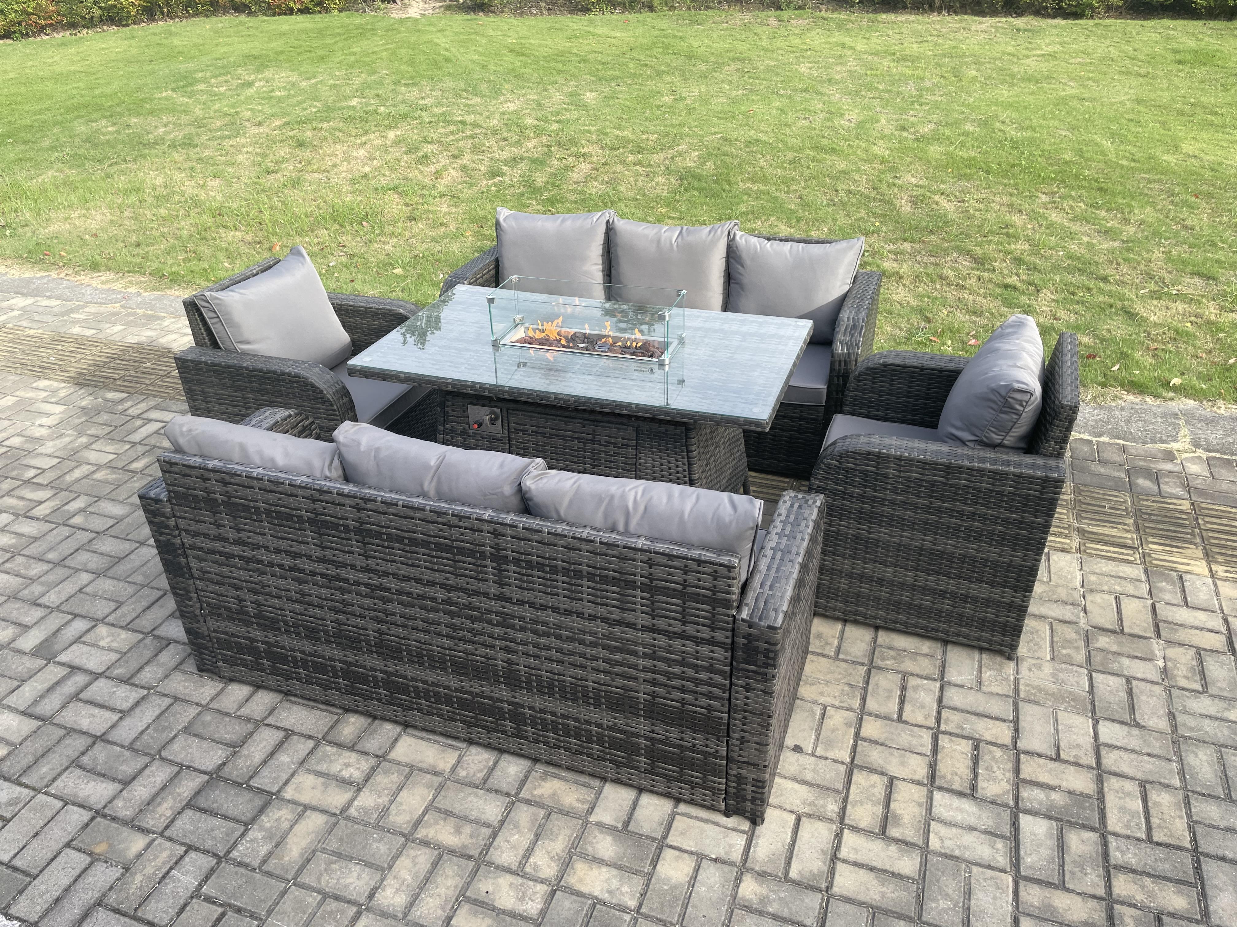 Rattan Gartenmöbel Sofa Set Gas Feuerstelle Esstisch mit 3-Sitzer Sofa Sessel 8-Sitzer Dunkelgrau Gemischt