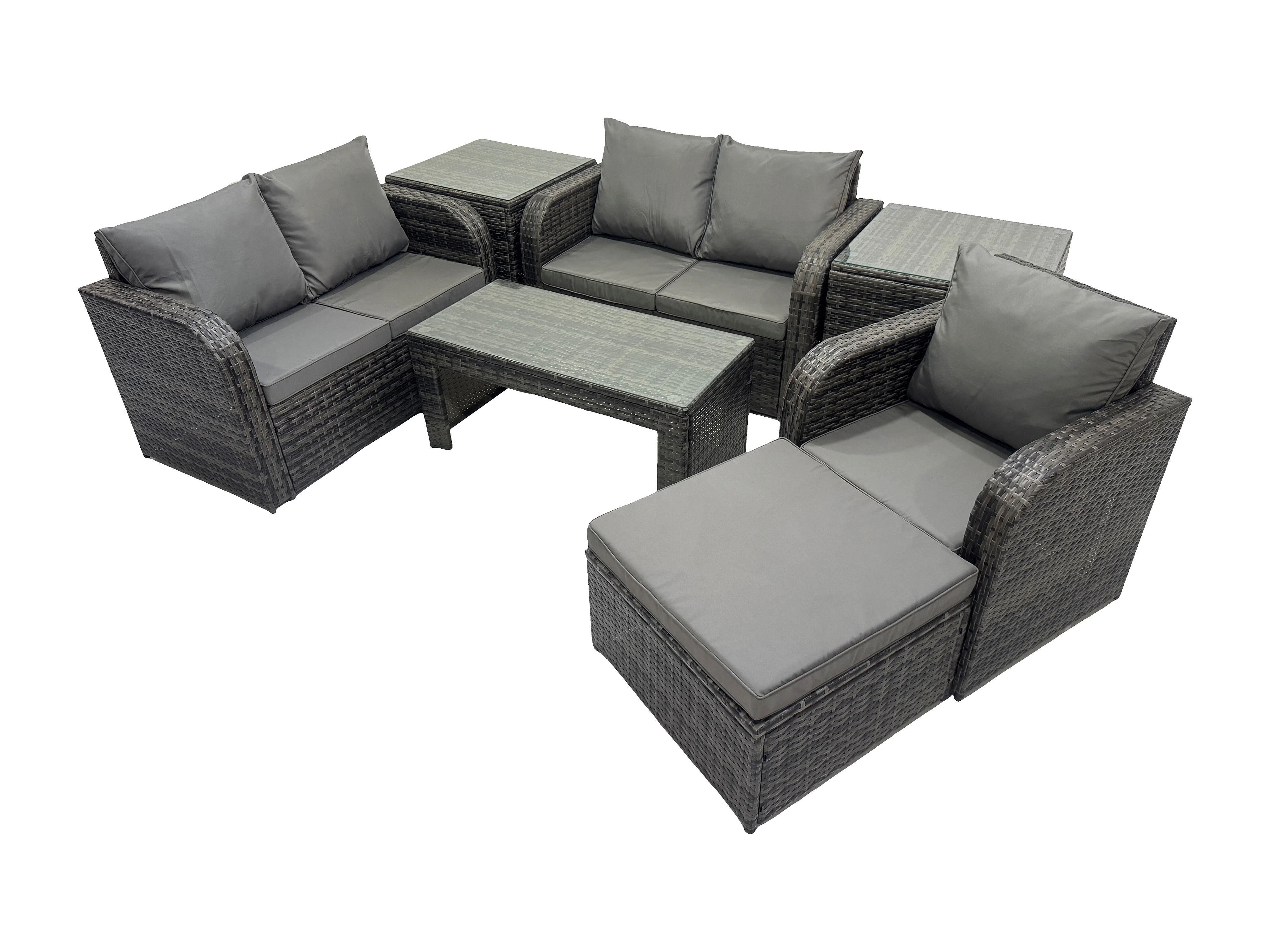 Rattan Gartenmöbel Sofa Set Tisch & Stühle Set mit 2 Großer Hockern 2 Beistelltischen Dunkelgrau Gemischt