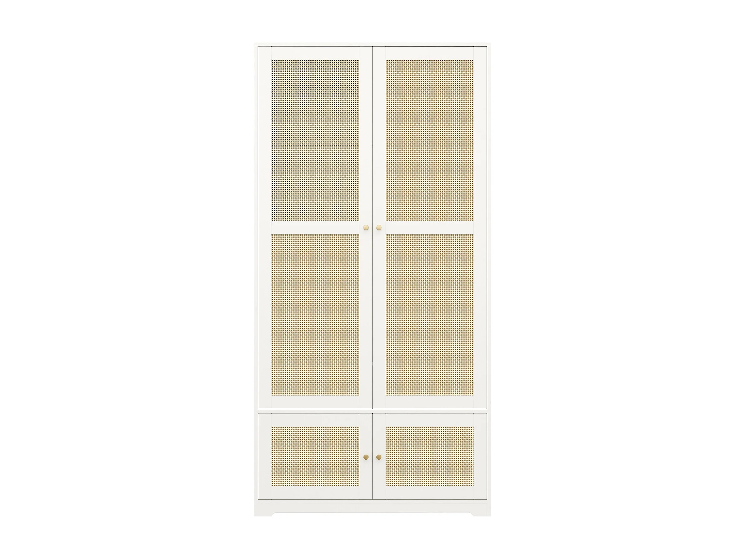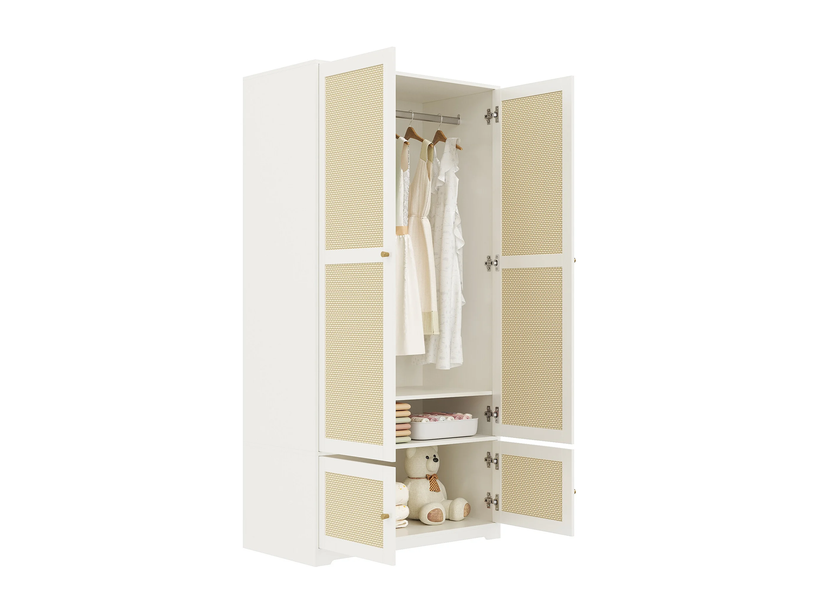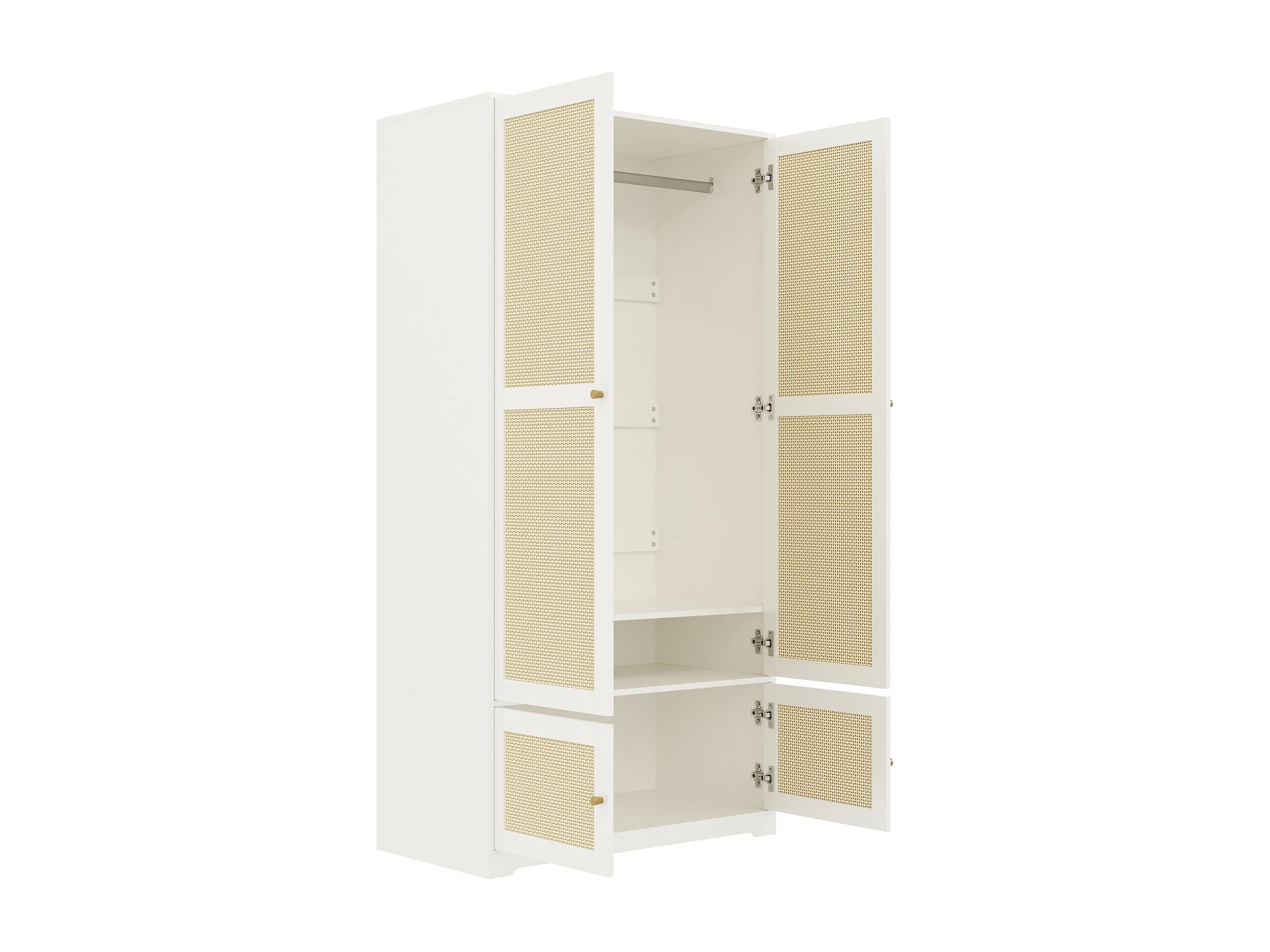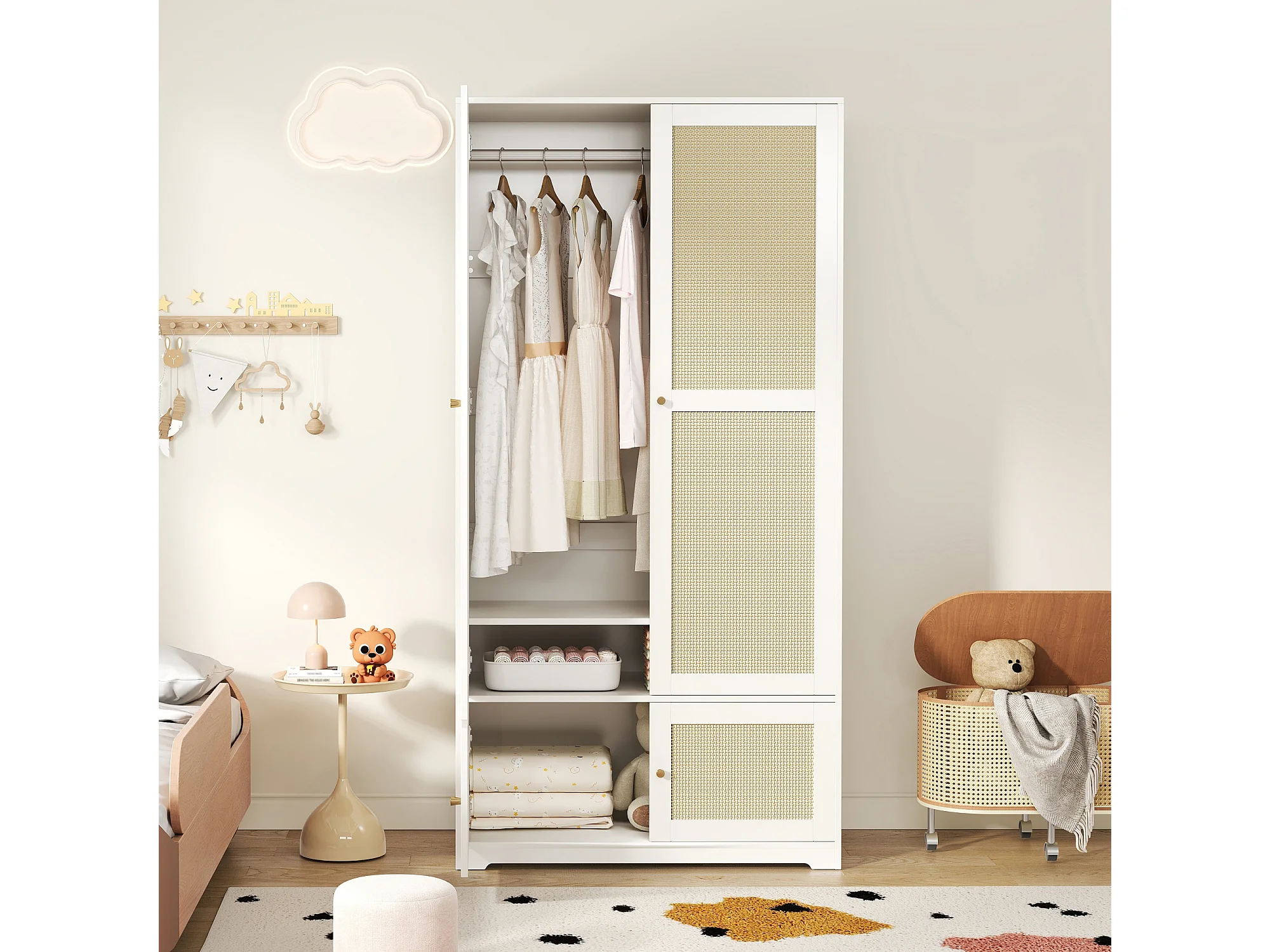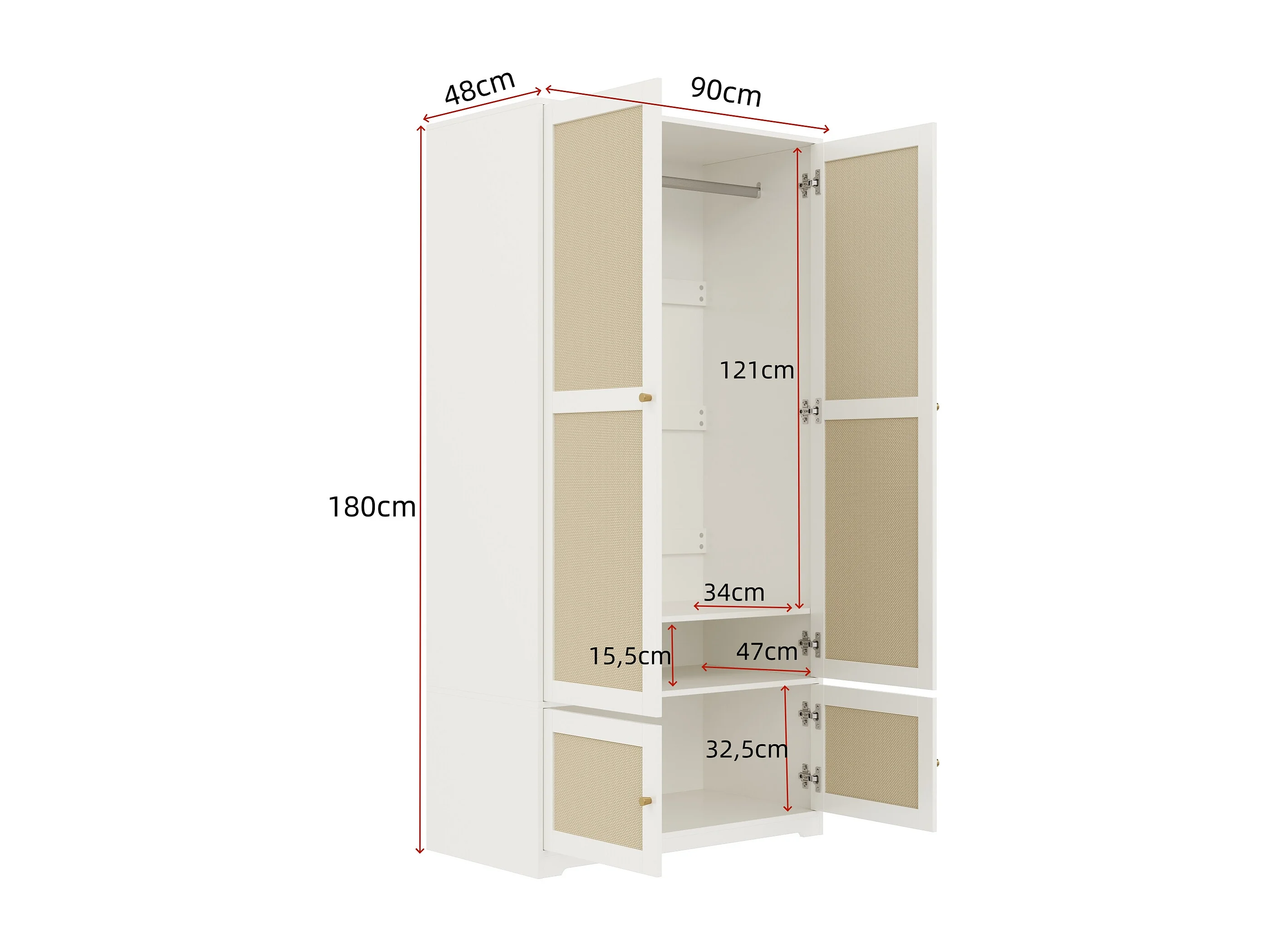 Rattan-Kleiderschrank – 90 x 48 x 180 cm – mit 2 Türen, Kleiderstange und Einlegeböden – aus MDF mit lackierten Fronten – weiß