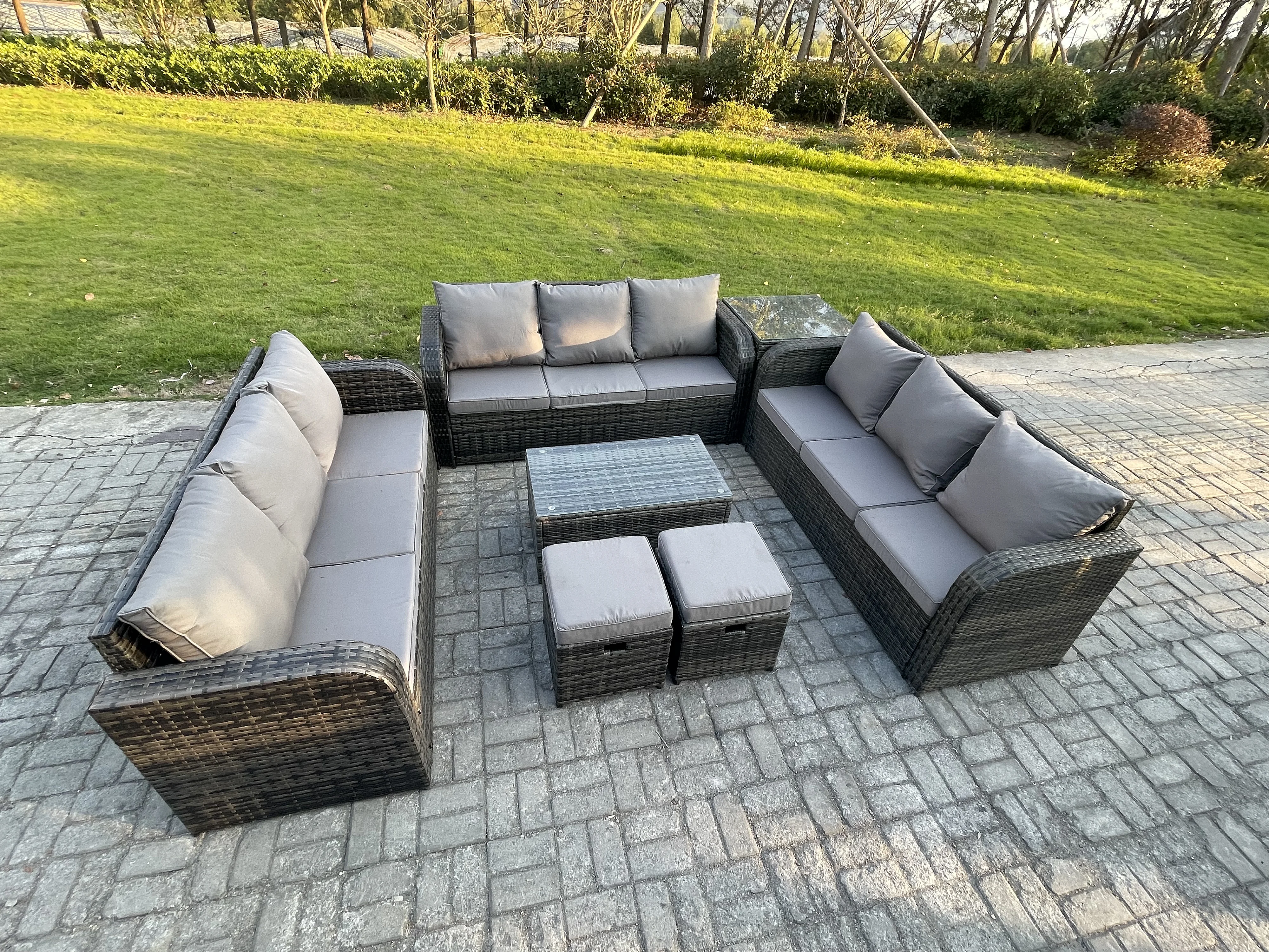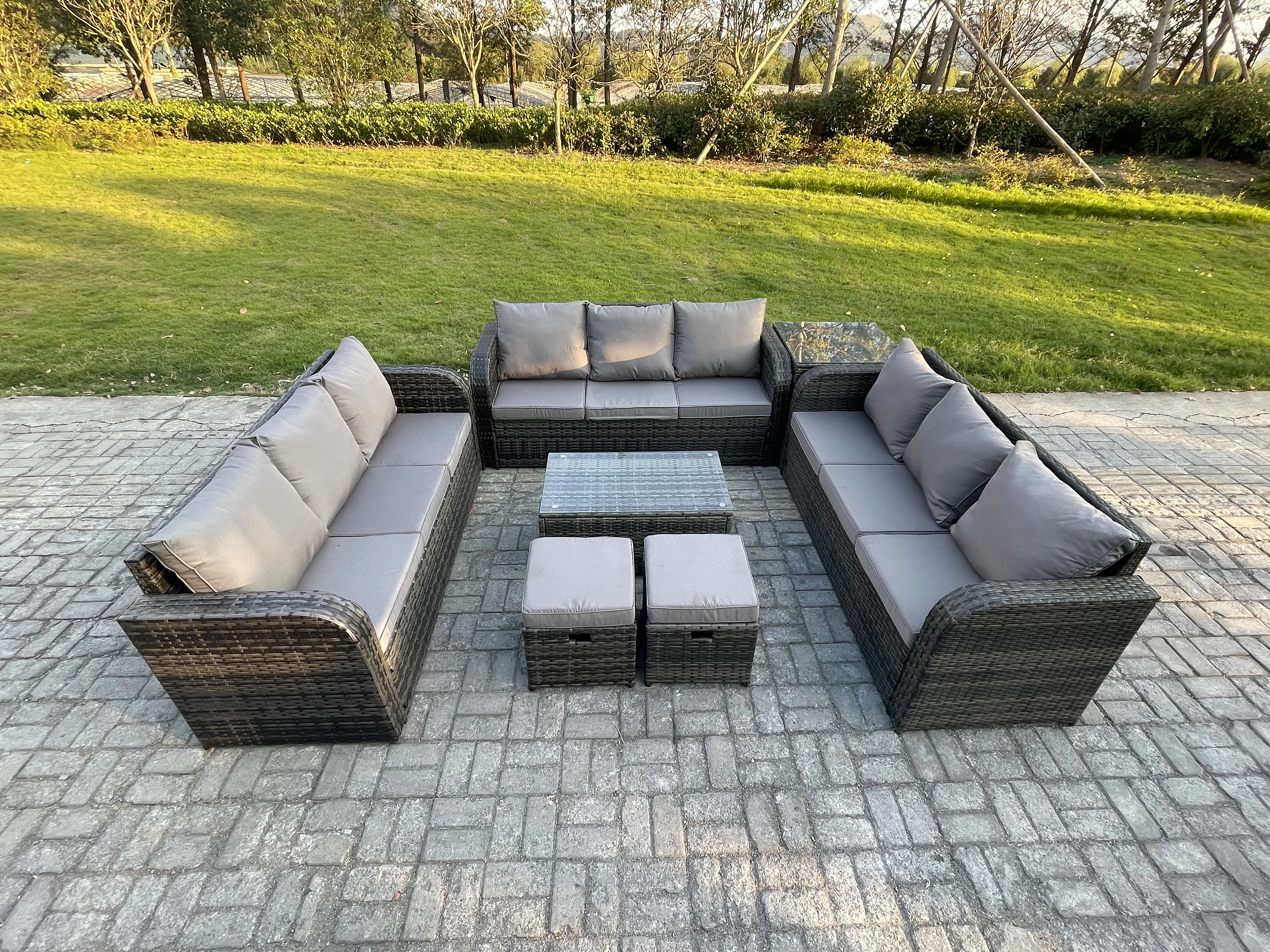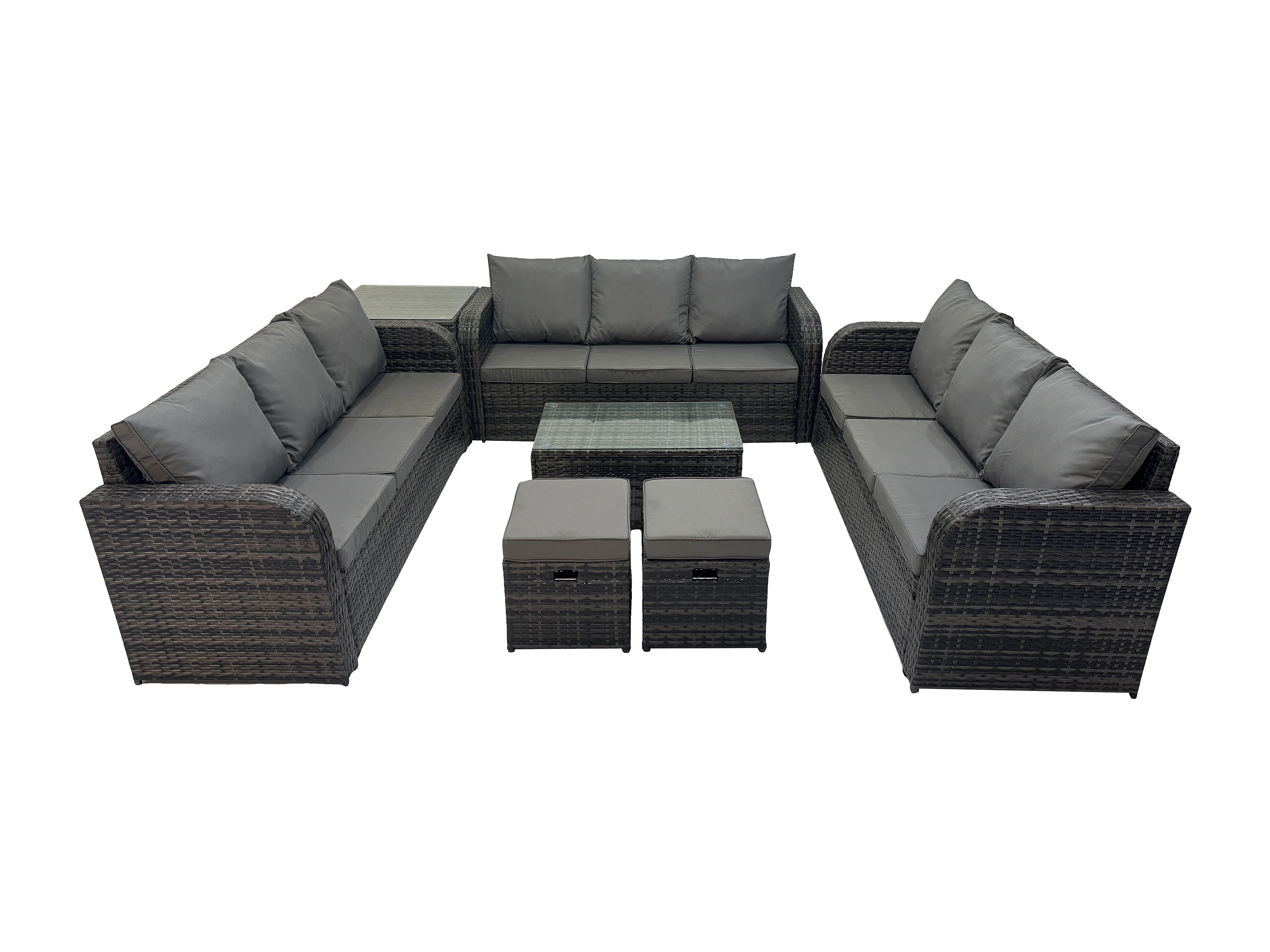 Rattan Lounge Sofa Set 11-Sitzer Gartenmöbel-Set mit Rechteckiger Couchtisch 3-Sitzer Sofa Beistelltisch 2 kleine Fußhockern Dunkelgrau Gemischt