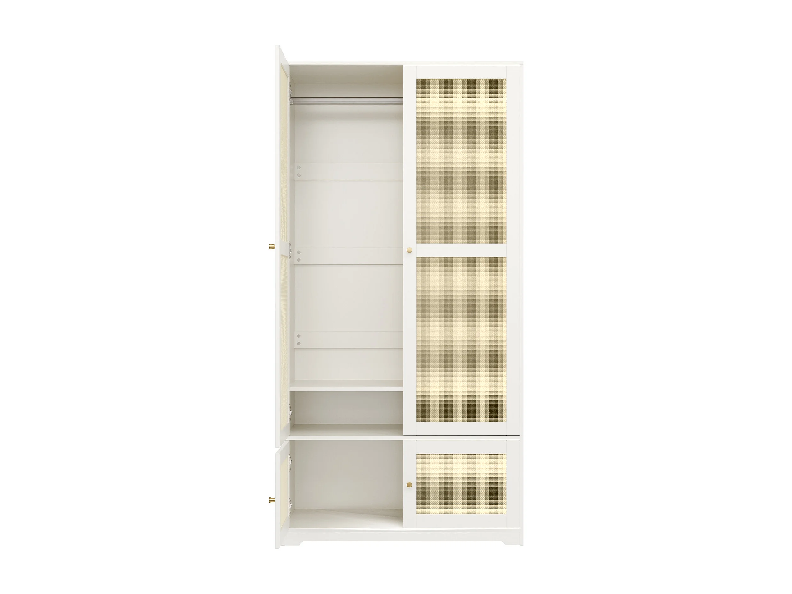 Rattan-Schrank 90 x 48 x 180 cm - Mit Kleiderstange und Regalen - 4 Rattantüren - MDF-Platten und lackiert - Weiß