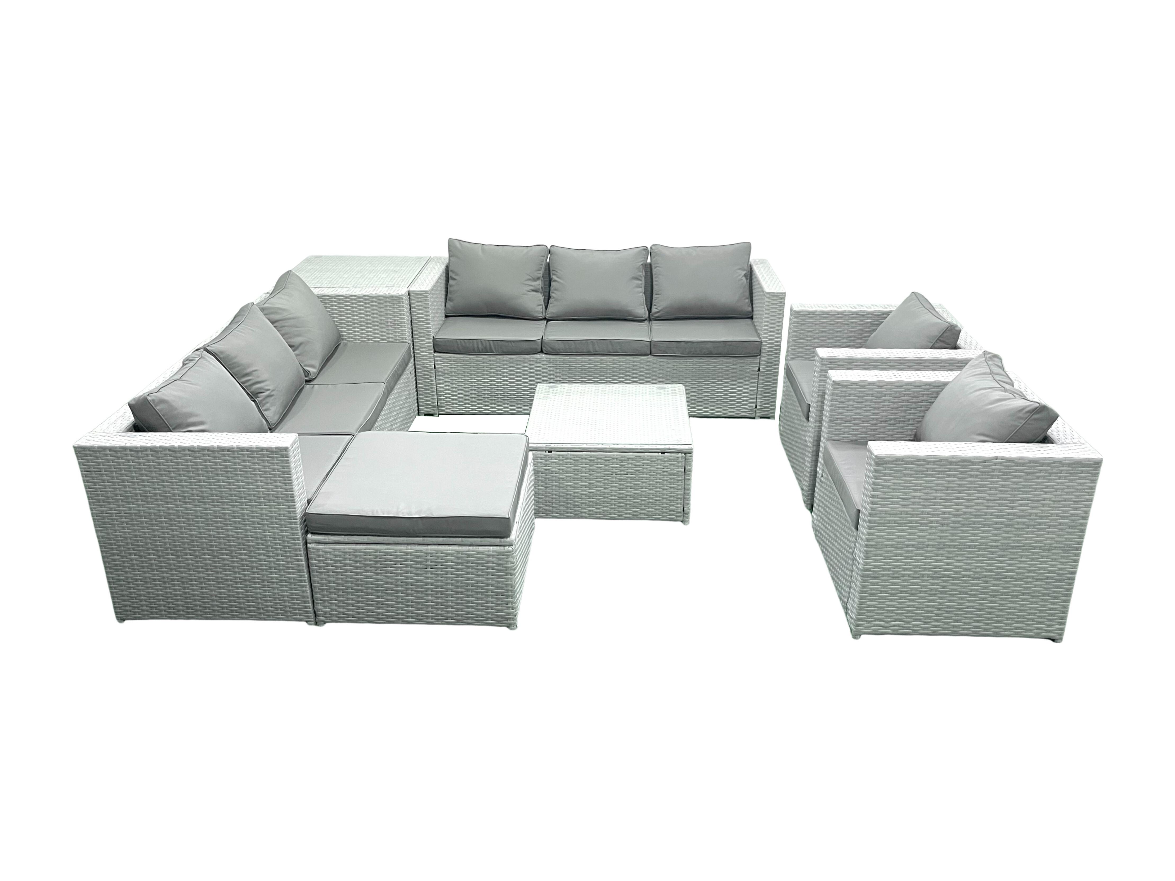 Rattan Sofa Gartenmöbel Set mit 2 Sesseln Quadratischer Couchtisch 2 Großer Hockern Beistelltisch Hellgrau gemischt