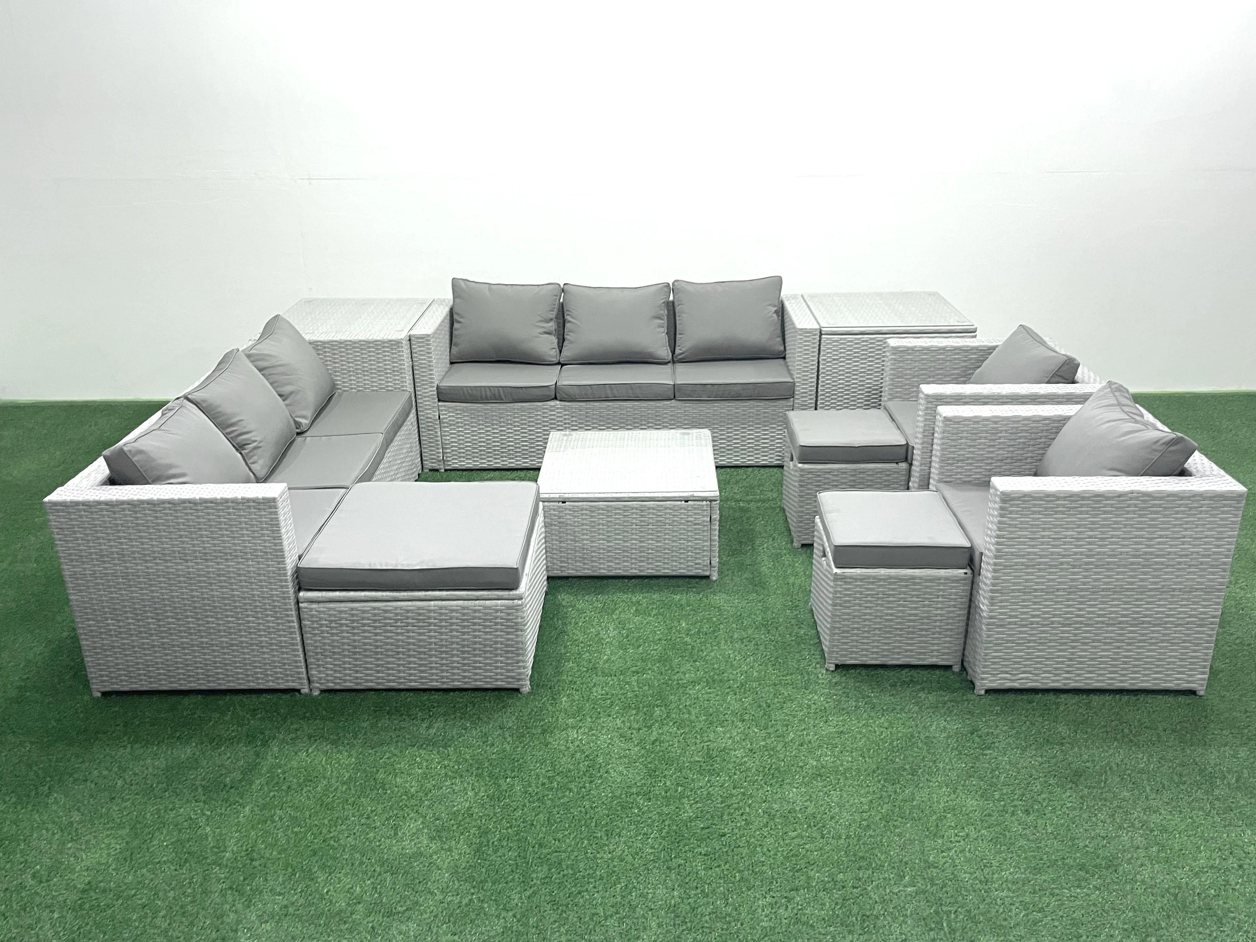 Rattan Sofa Gartenmöbel Set mit 2 Sesseln Quadratischer Couchtisch 3 Hockern 2 Beistelltischen Hellgrau gemischt
