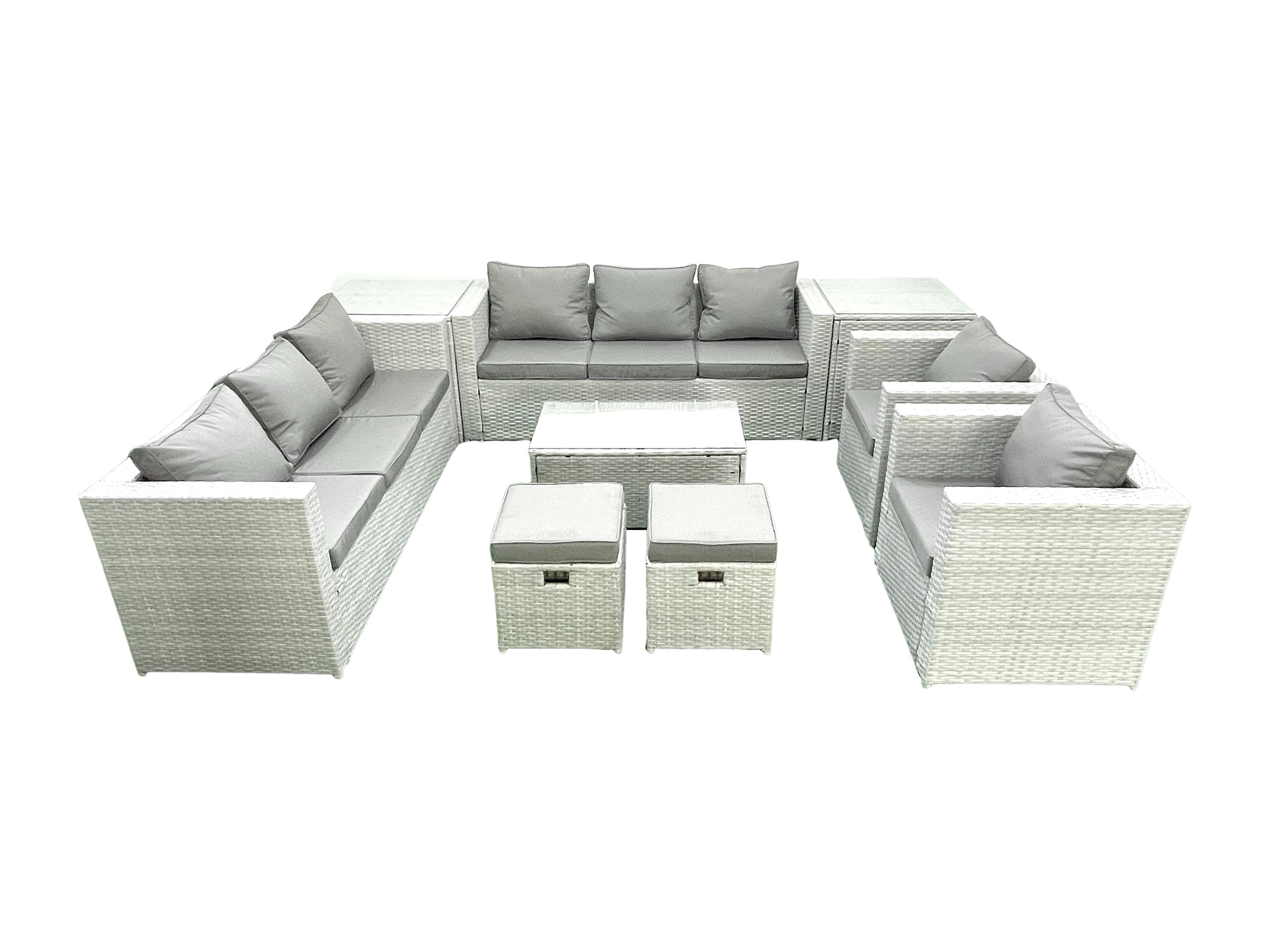 Rattan Sofa Gartenmöbel Set mit 2 Sesseln Rechteckiger Couchtisch 2 kleine Fußhockern 2 Beistelltischen Hellgrau gemischt