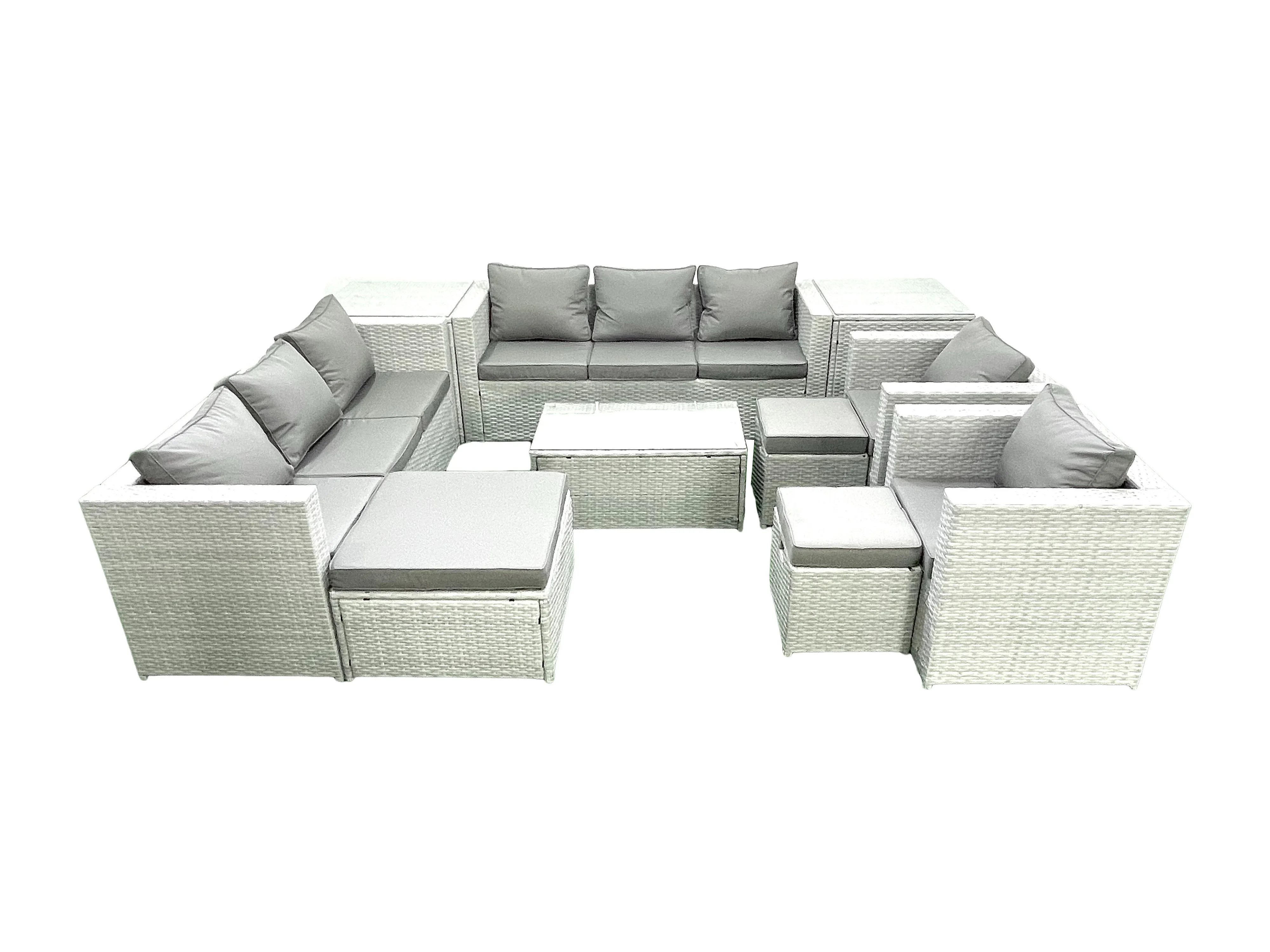 Rattan Sofa Gartenmöbel Set mit 2 Sesseln Rechteckiger Couchtisch 3 Hockern 2 Beistelltischen Hellgrau gemischt