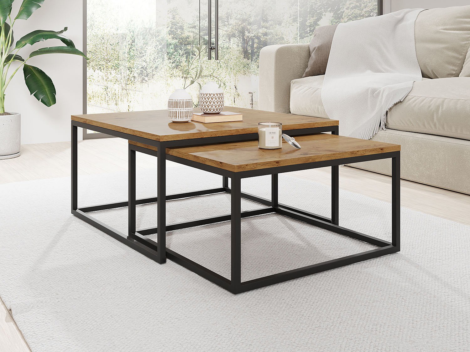 Rechteckige Quadratische Satztische Couchtische mit Schwarz Gestell - Loft Couchtische Metallbeine - 2in1 - Zwei Getrennte Tische für Wohnzimmer - Lancelot Eiche