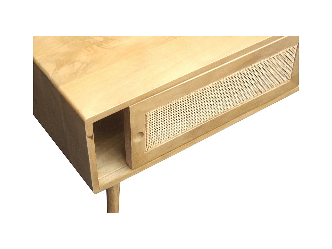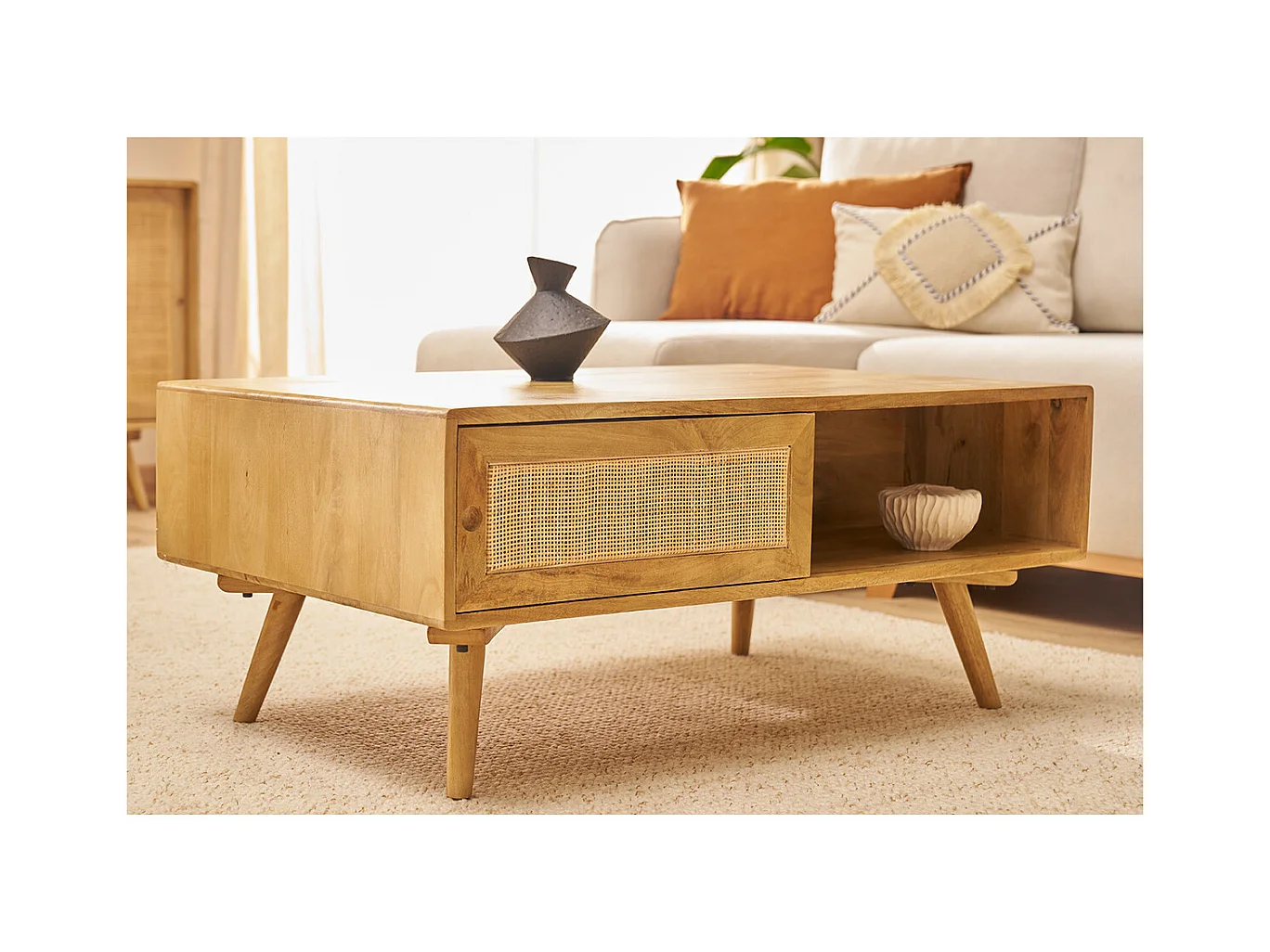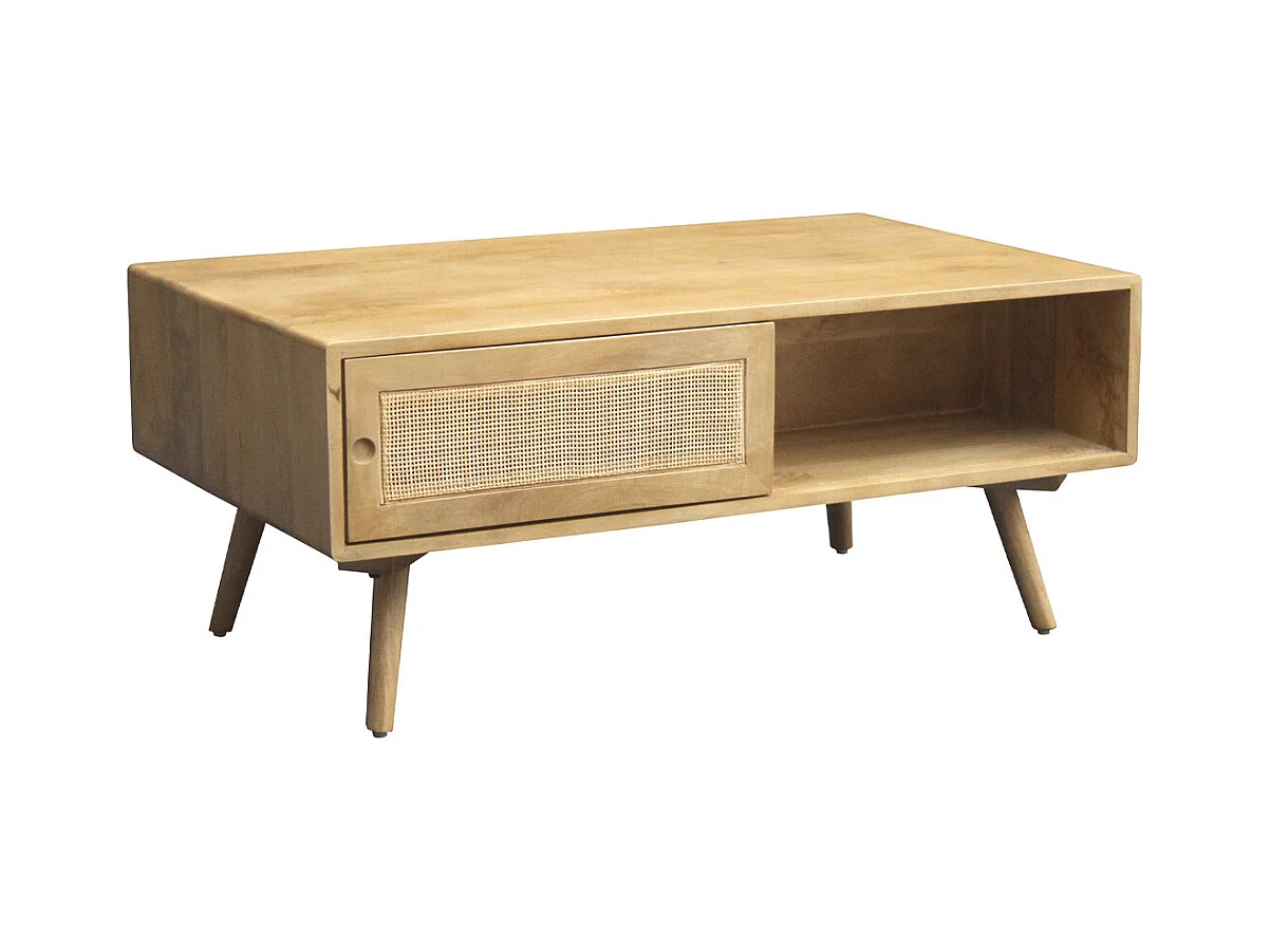 Rechteckiger Couchtisch mit Stauraum aus massivem Mangoholz und Rattangeflecht B100 cm ACANGE
