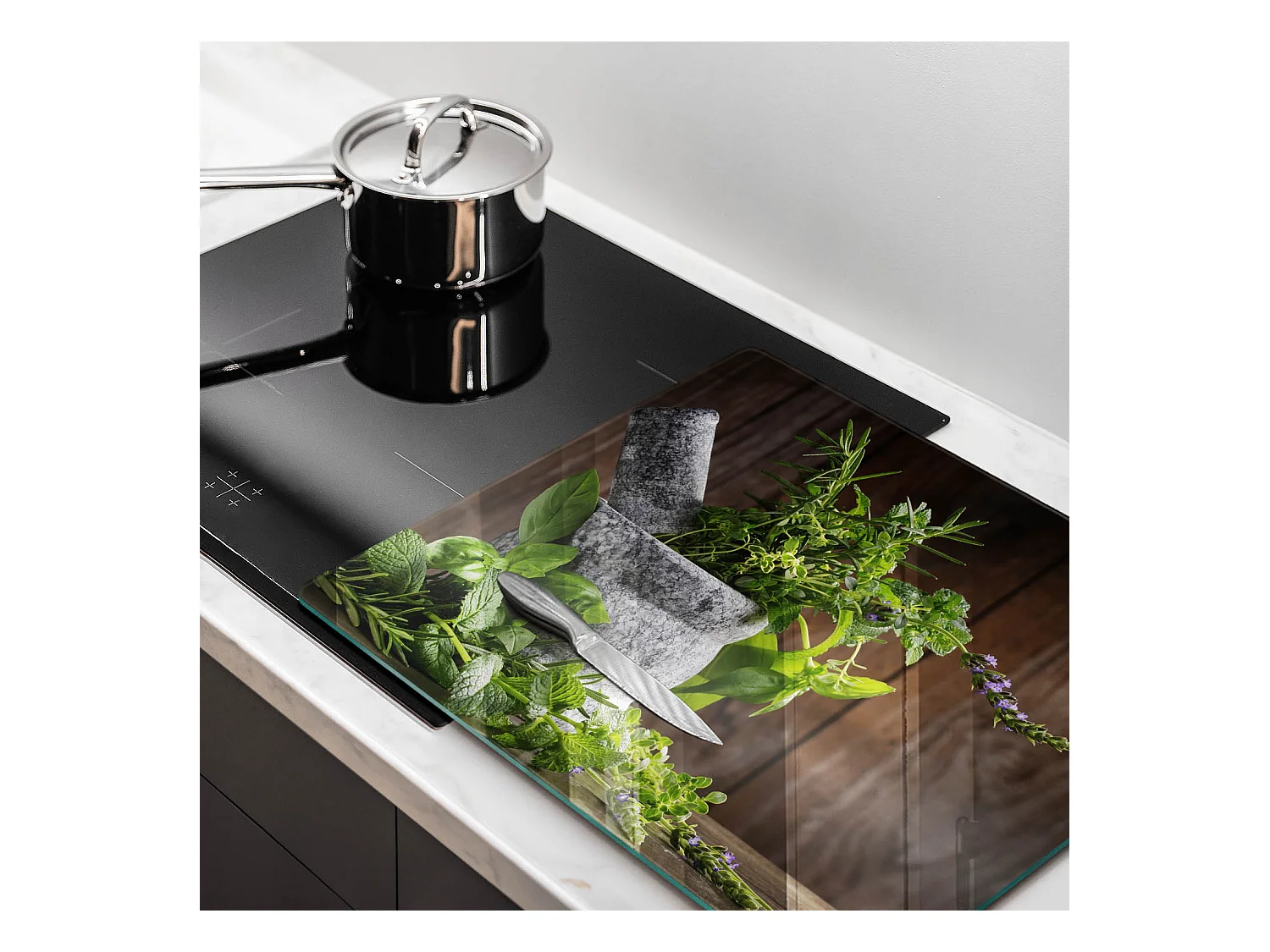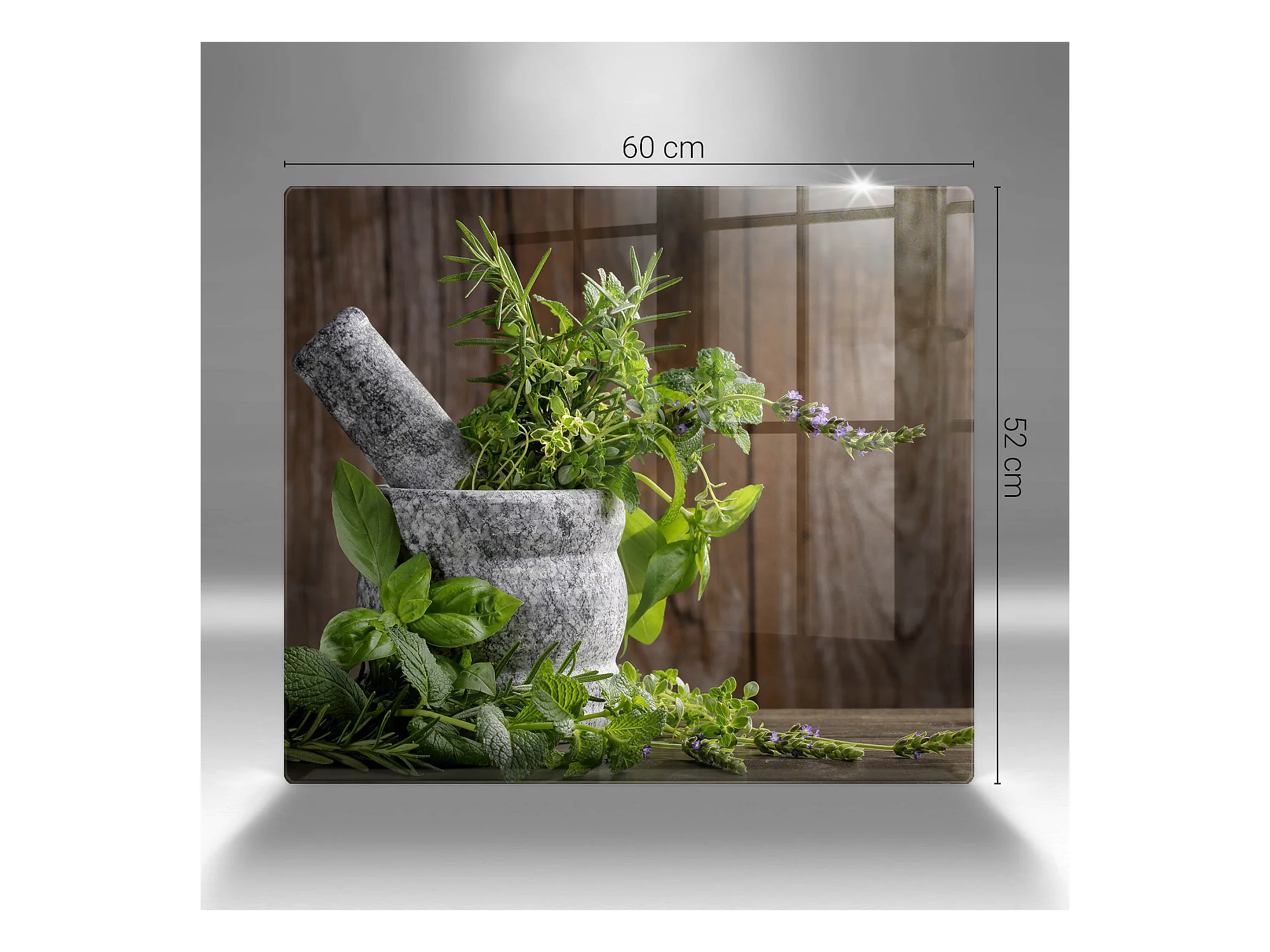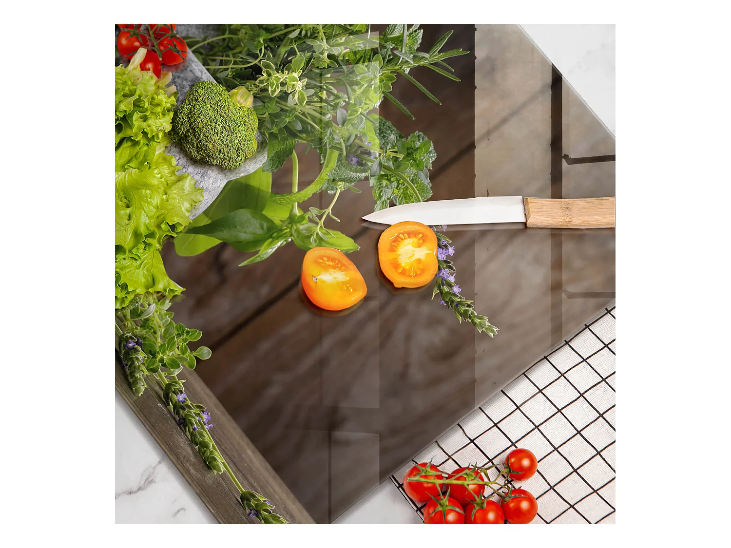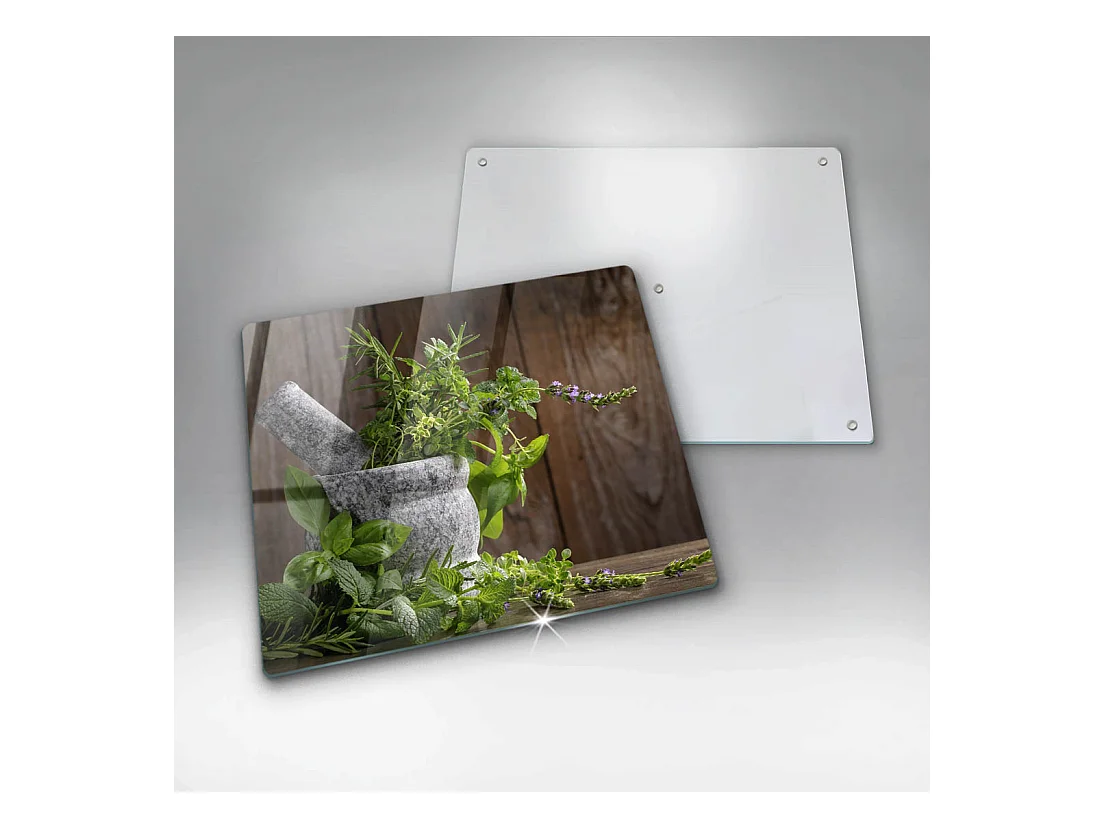 Rechteckiges Küchenbrett aus Glas, 60x52 cm Pflanzen, Kräuter und Holz