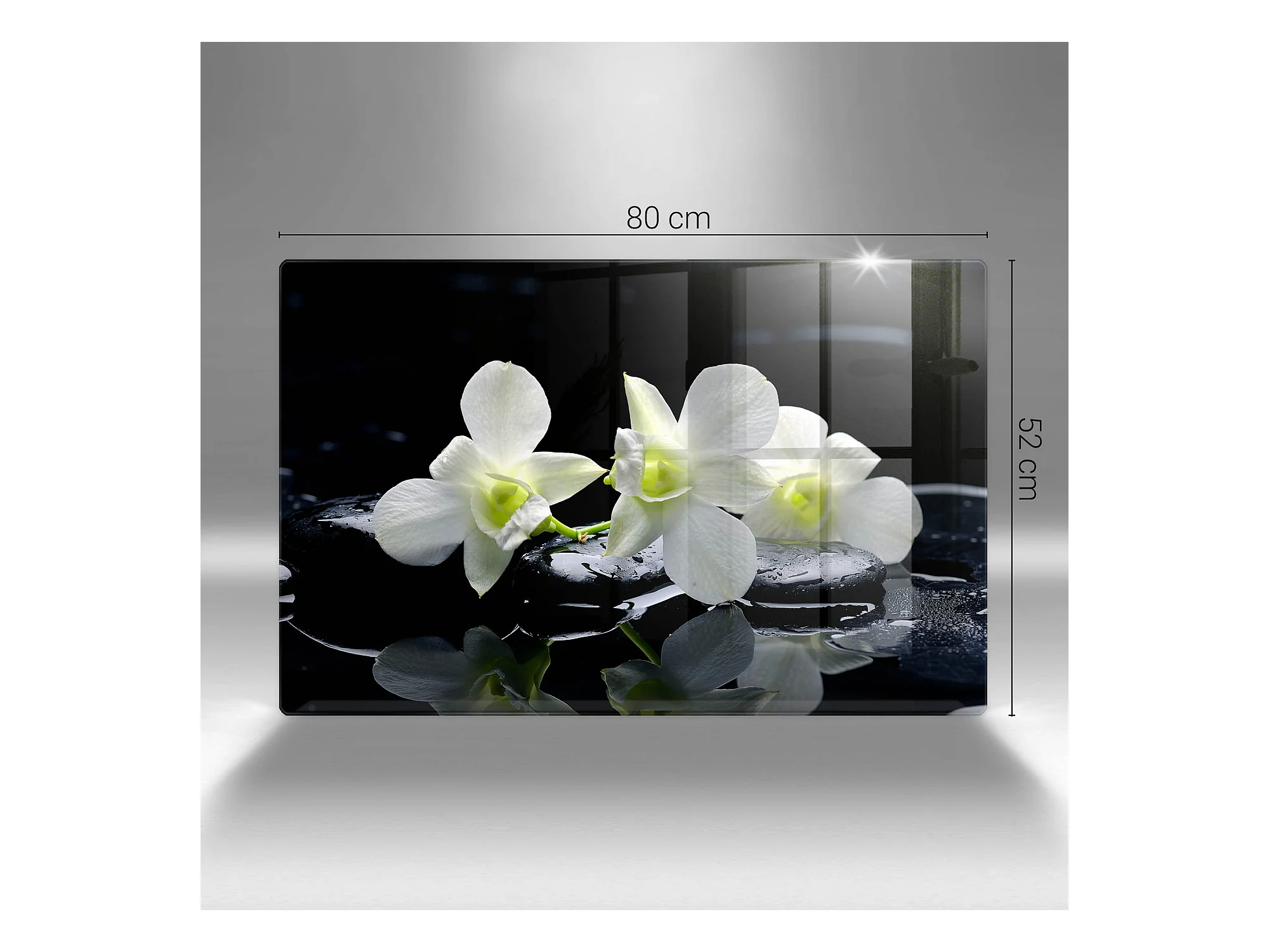Rechteckiges Küchenbrett aus Glas, 80 x 52 cm. Weiße Blumen im Zen-Wasser