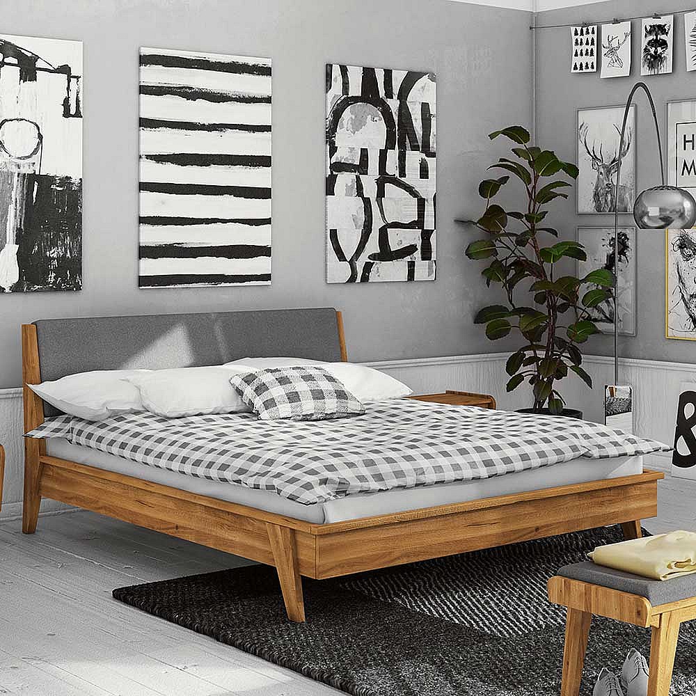 Retro Holzbett aus Wildeiche Massivholz gepolstertem Kopfteil