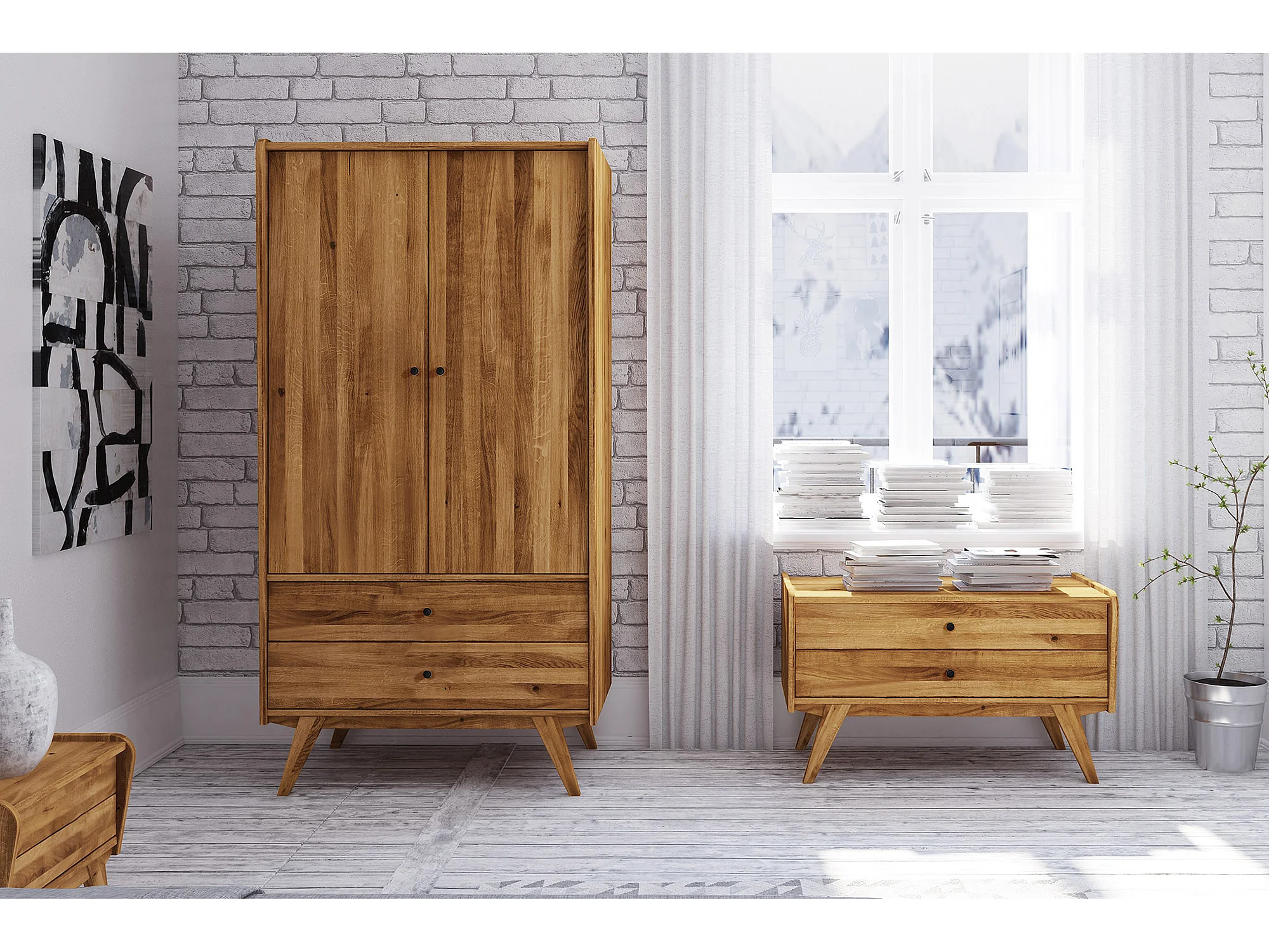 RETRO - Niedrige Kommode 100% aus massivem Holz aus Wideiche, naturgeölt