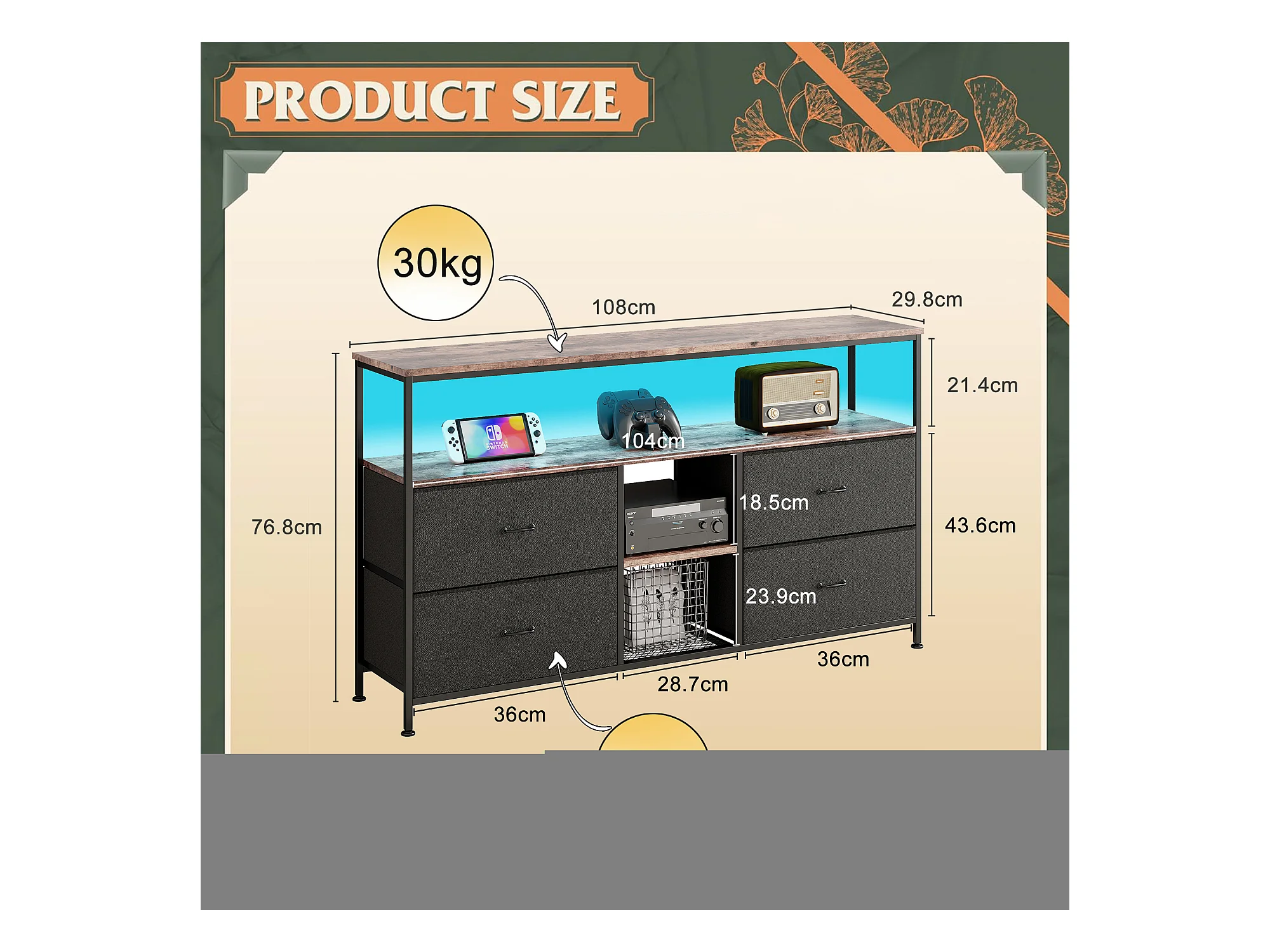 RGB-LED-TV-Ständer – 4 Vintage-Schubladen, Metallrahmen, verstellbares Regal, 108 x 30 x 57 cm