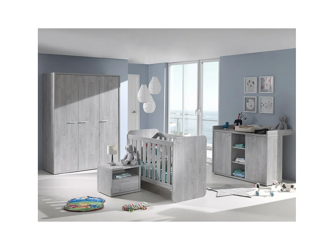 Robuste Babykommode mit integrierter Wickeltisch in Grau Holzoptik aus der Kollektion MATHEO