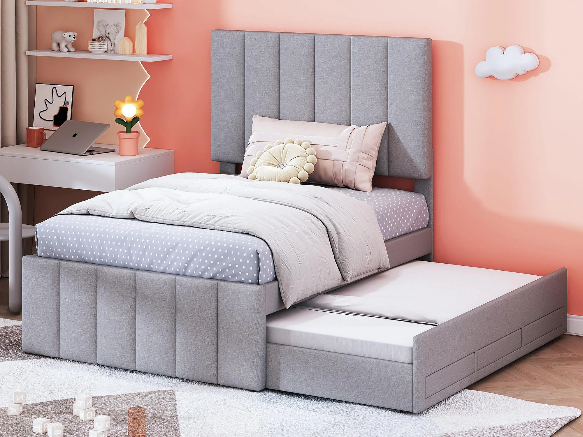 Rollbett 90 x 190/200 cm mit 3 Schubladen – Leinenstoff – Lattenrost – Grau