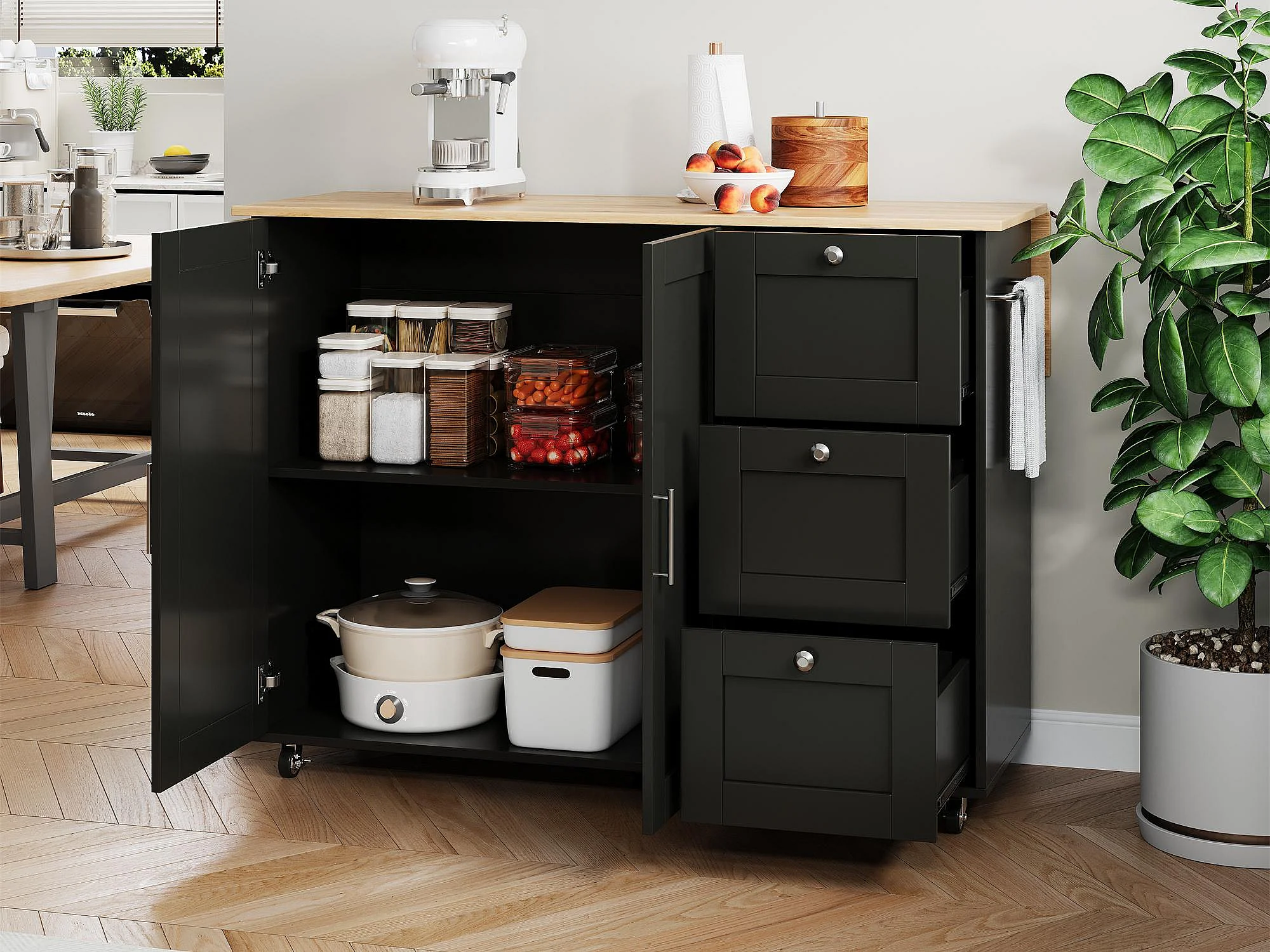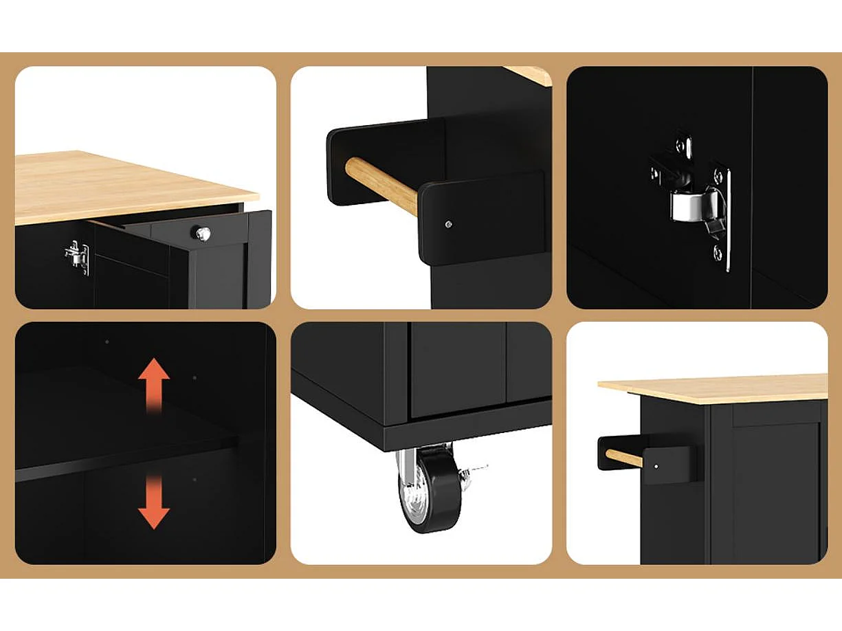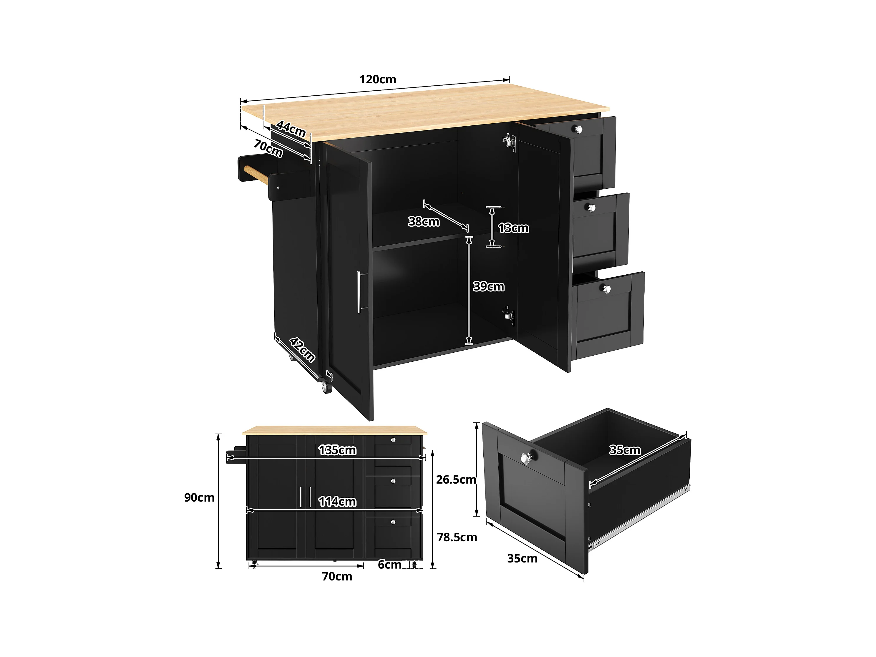 Zentrale Kücheninsel - mit klappbarem Tresen - 3 Schubladen und verstellbare Regale - Schwarz