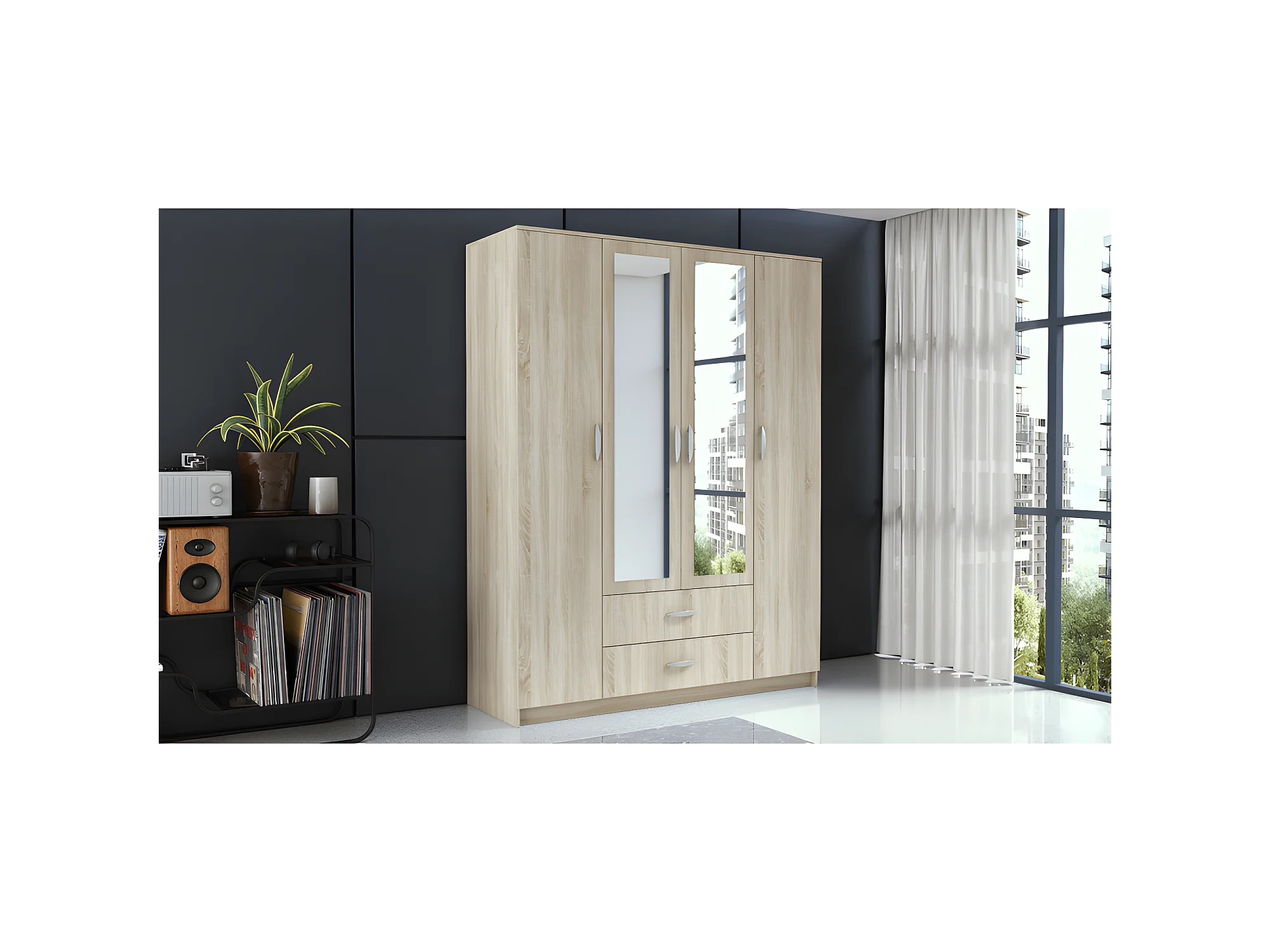 ROMA | Großer Schrank Zimmer Büro 205x160x52 cm | Kleiderschrank | 2 Türen | 2 Spiegel | 2 Schubladen | Aufbewahrungsmöbel