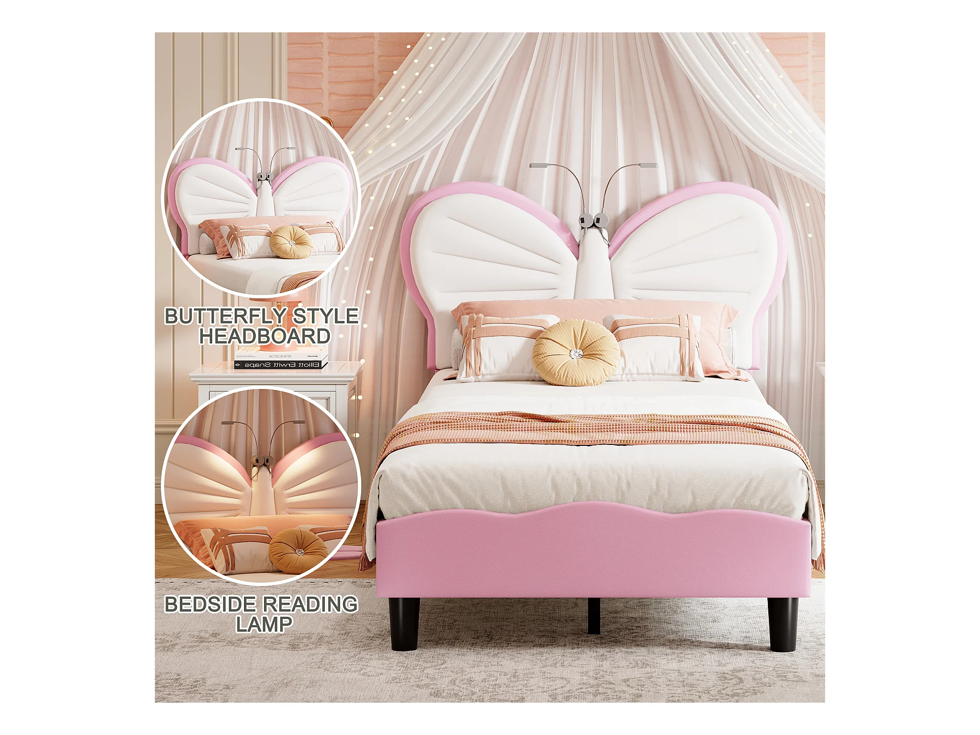 Rosa-weißes Kinderbett 90x200 cm mit Schmetterlingskopfteil, LED-Leselampe und verstellbarer Höhe