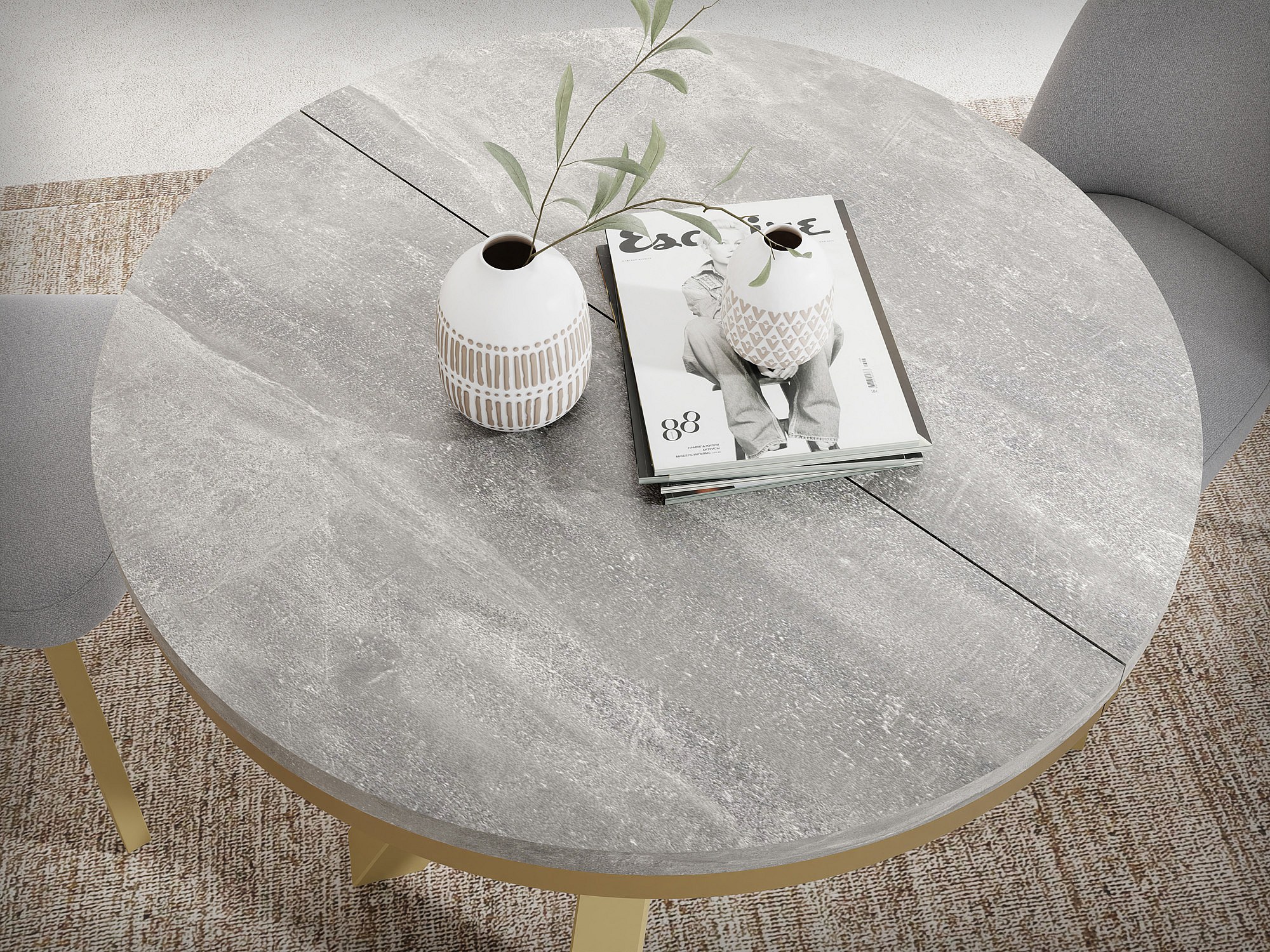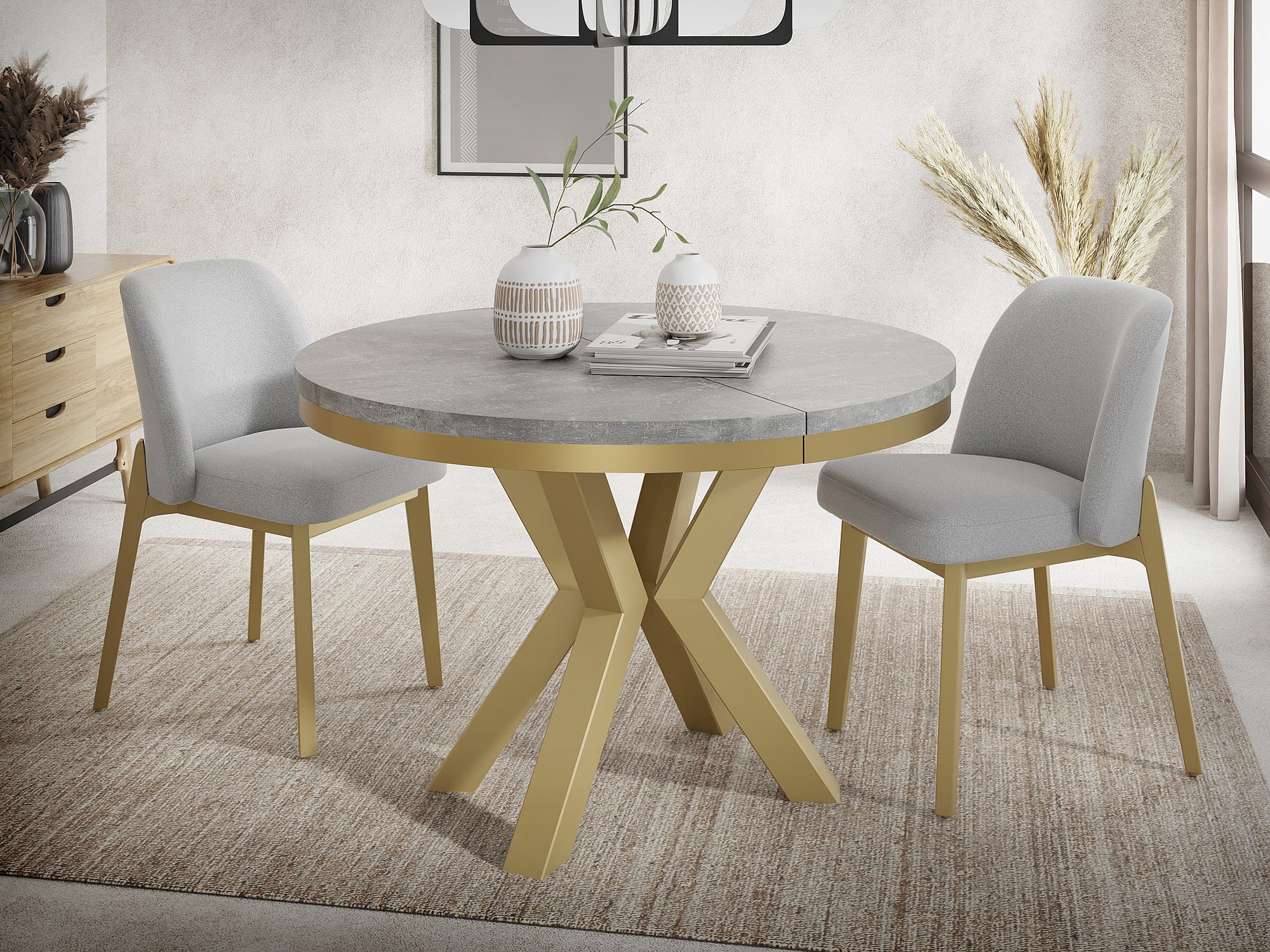 Runder Ausziehbarer Esstisch im Loft-Stil - Industrieller Tisch mit Goldenen Metallbeinen - Platzsparender Tisch für Wohnzimmer - Grauer Beton - 120 bis 200 cm