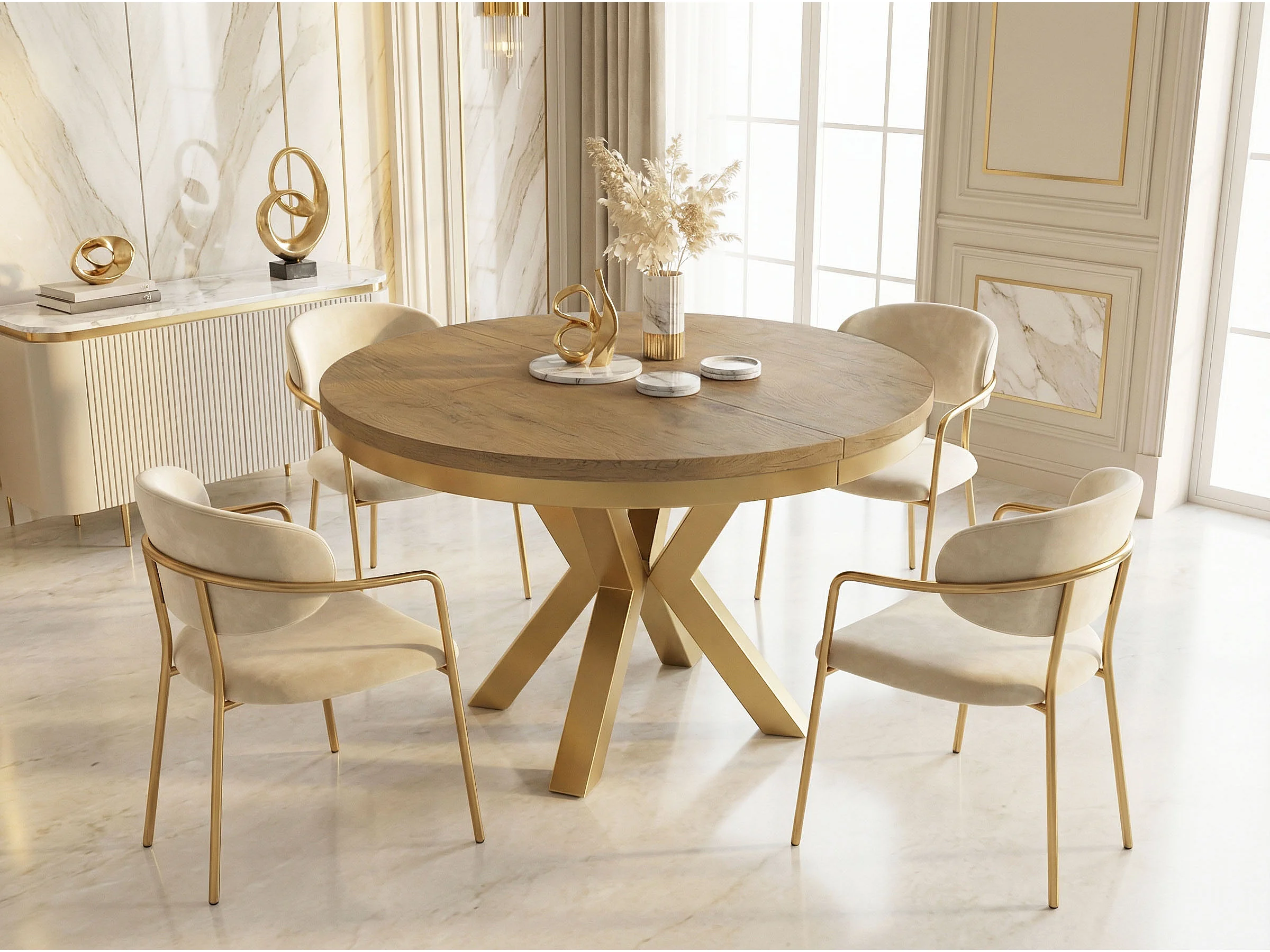Runder Ausziehbarer Esstisch im Loft-Stil - Industrieller Tisch mit Goldenen Metallbeinen - Platzsparender Tisch für Wohnzimmer - Lancelot Eiche - 100 bis 180 cm