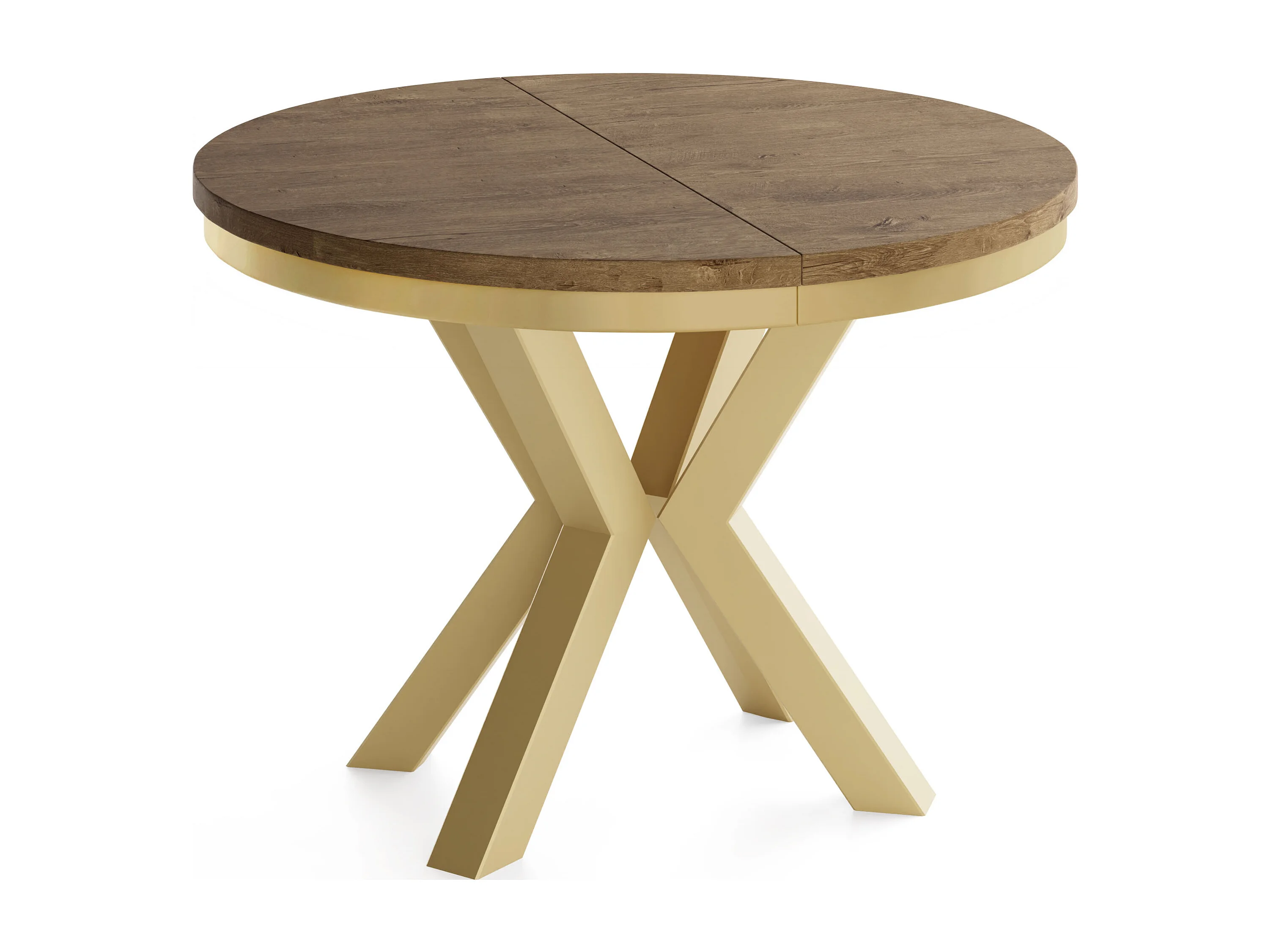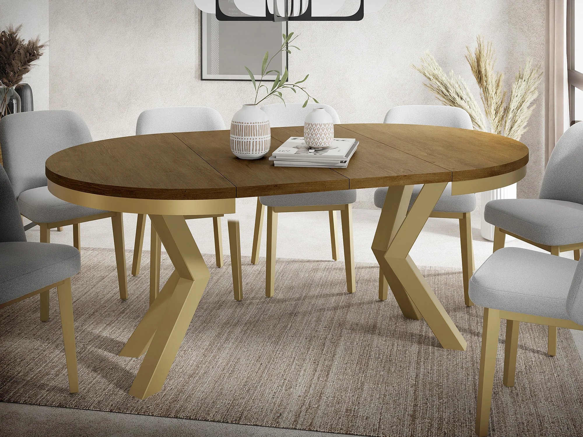 Runder Ausziehbarer Esstisch im Loft-Stil - Industrieller Tisch mit Goldenen Metallbeinen - Platzsparender Tisch für Wohnzimmer - Lefkas Eiche - 100 bis 180 cm