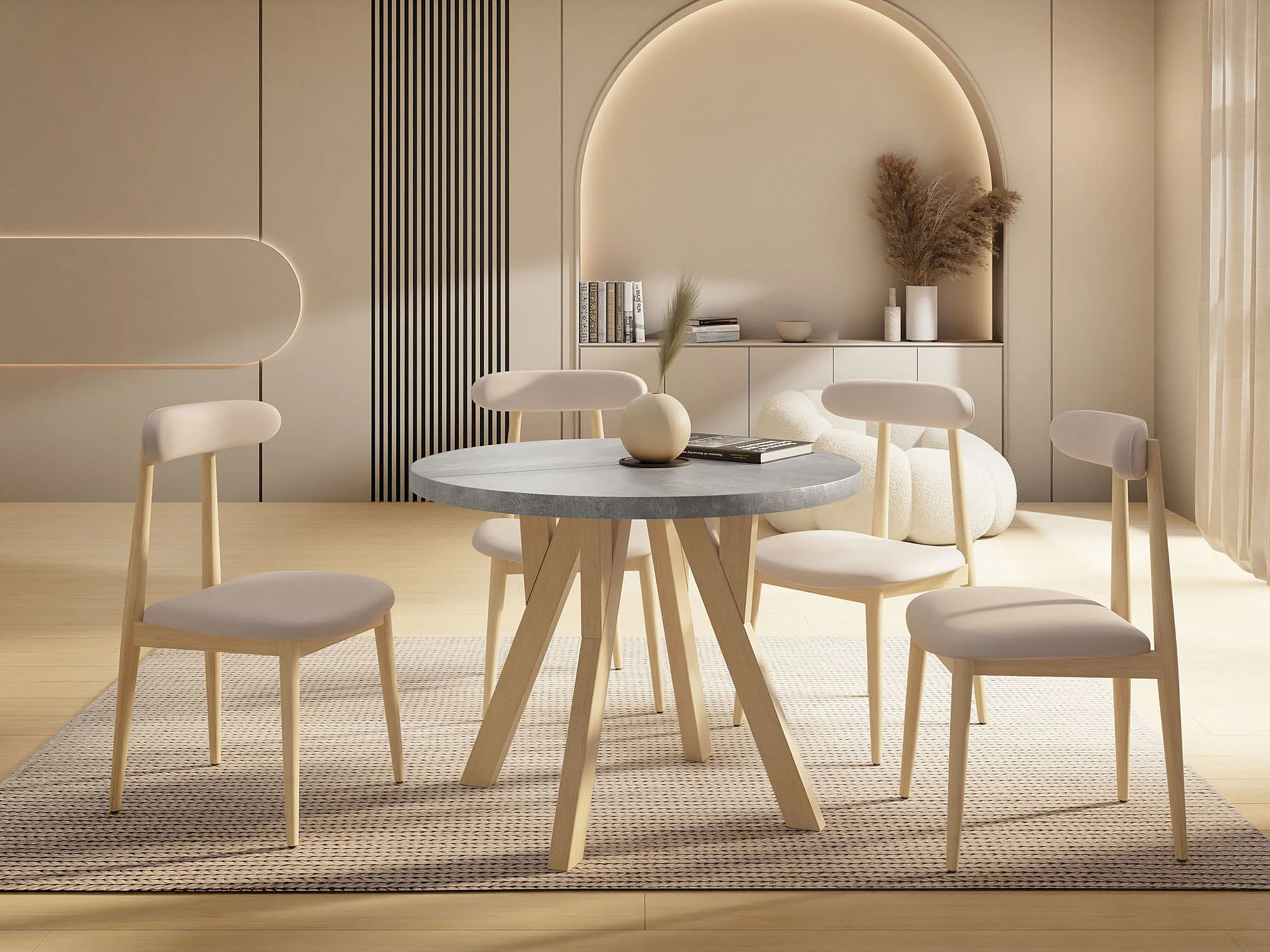 Runder Ausziehbarer Esstisch im Loft-Stil – Industrieller Tisch mit Holzbeinen – Platzsparender Tisch für Wohnzimmer – Beton Grau – 90 bis 190 cm