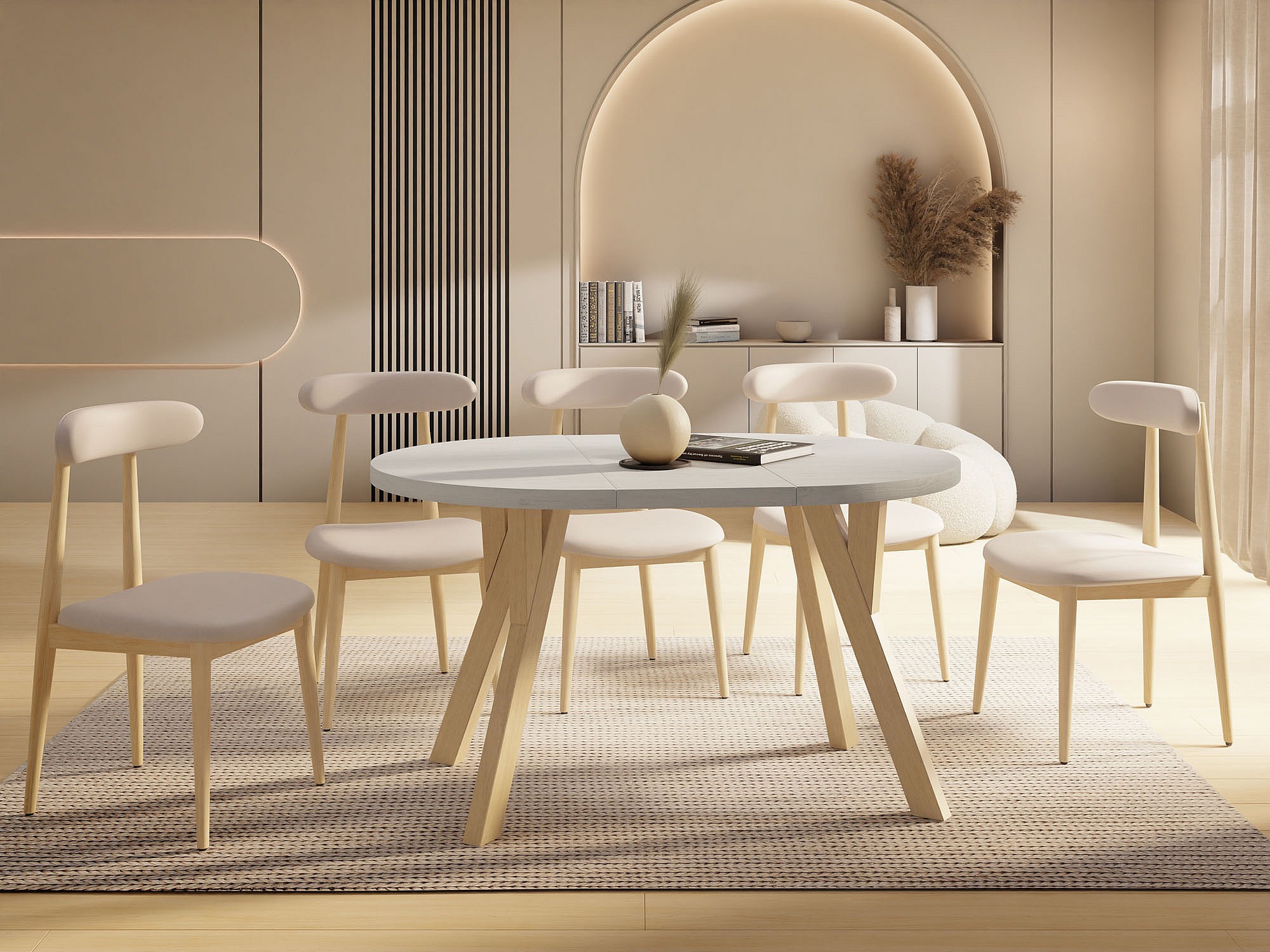 Runder Ausziehbarer Esstisch im Loft-Stil – Industrieller Tisch mit Holzbeinen – Platzsparender Tisch für Wohnzimmer – Kiefer Weiß – 100 bis 140 cm