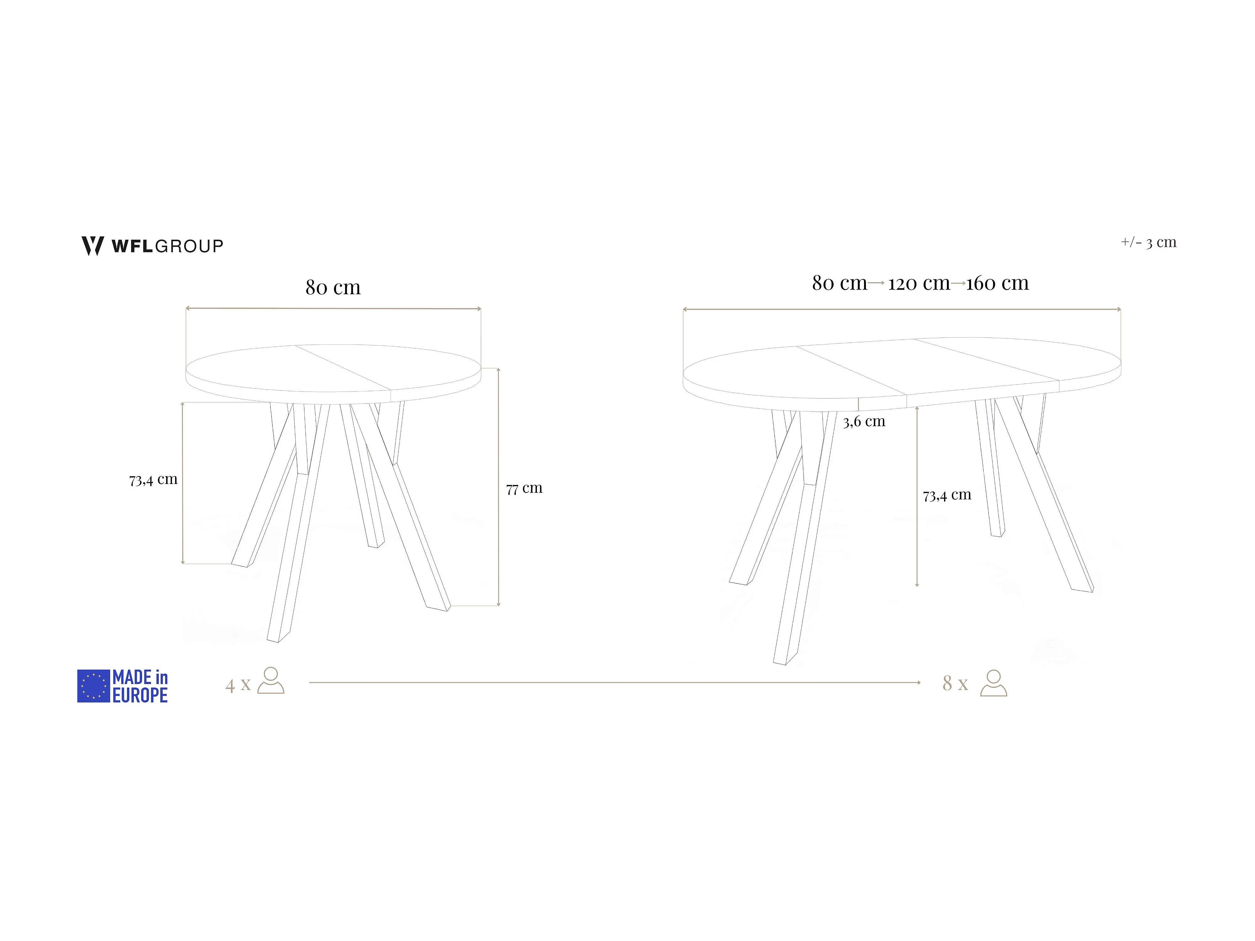 Runder Ausziehbarer Esstisch im Loft-Stil – Industrieller Tisch mit Holzbeinen – Platzsparender Tisch für Wohnzimmer – Kiefer Weiß – 80 bis 160 cm