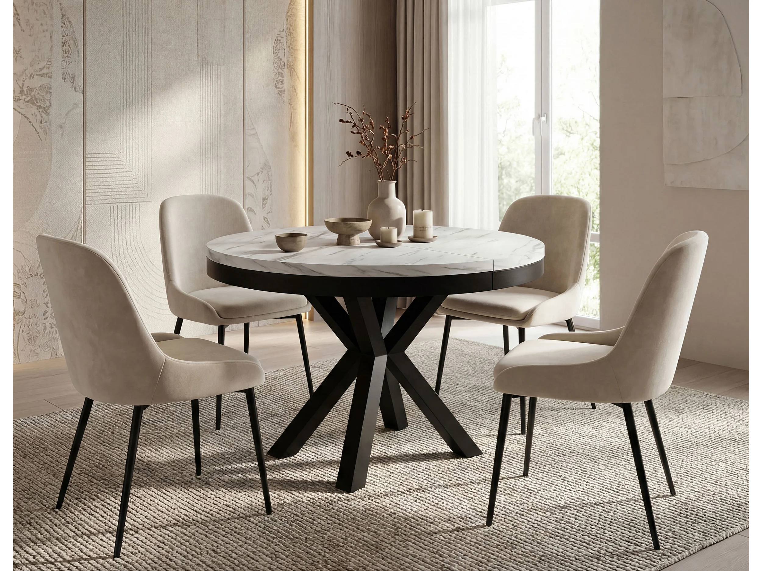 Runder Ausziehbarer Esstisch im Loft-Stil - Industrieller Tisch mit Schwarzen Metallbeinen - Platzsparender Tisch für Wohnzimmer - Marmor Weiß - 120 bis 200 cm