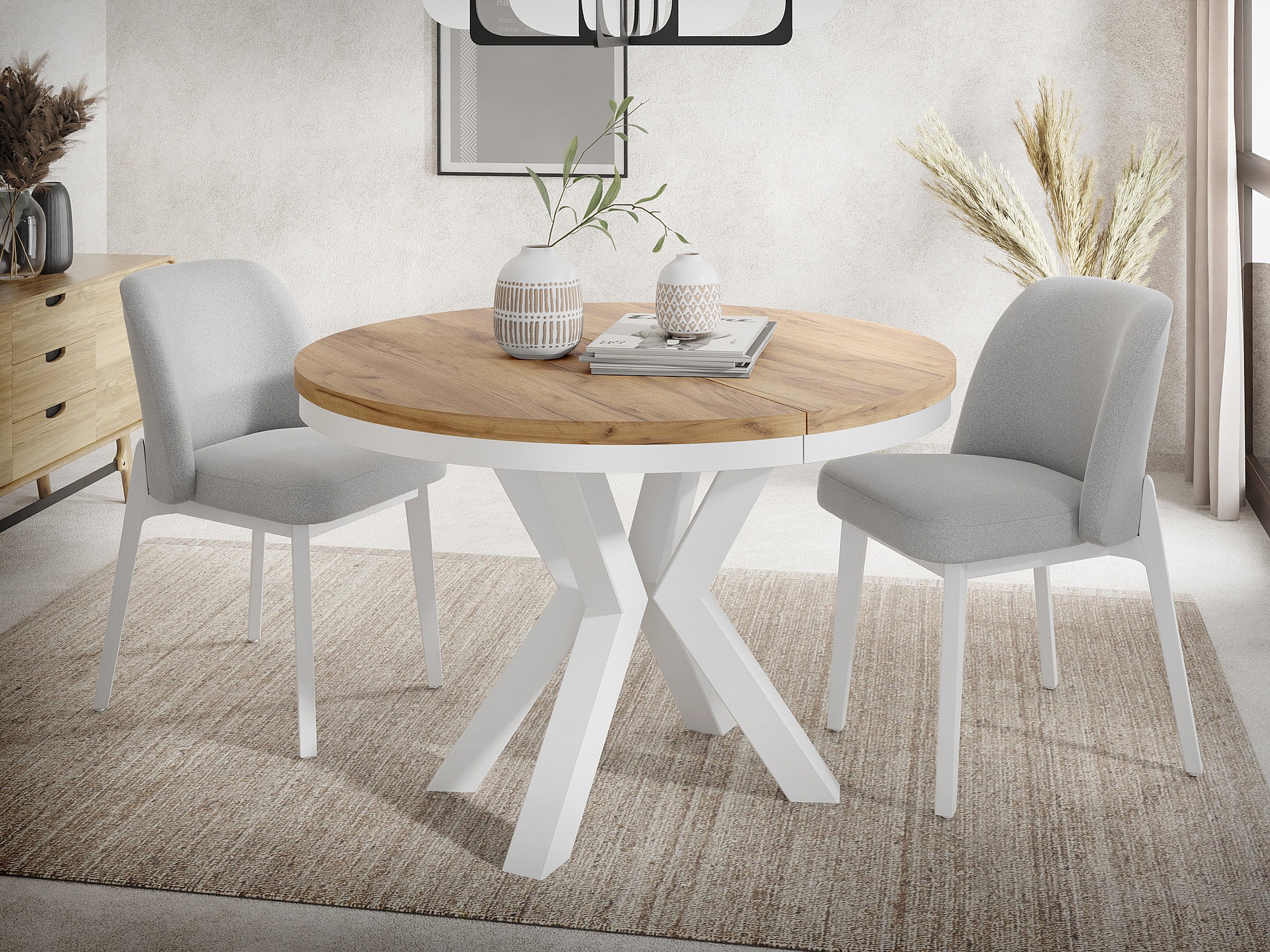 Runder Ausziehbarer Esstisch im Loft-Stil - Industrieller Tisch mit Weißen Metallbeinen - Platzsparender Tisch für Wohnzimmer - Craft Eiche - 120 bis 200 cm
