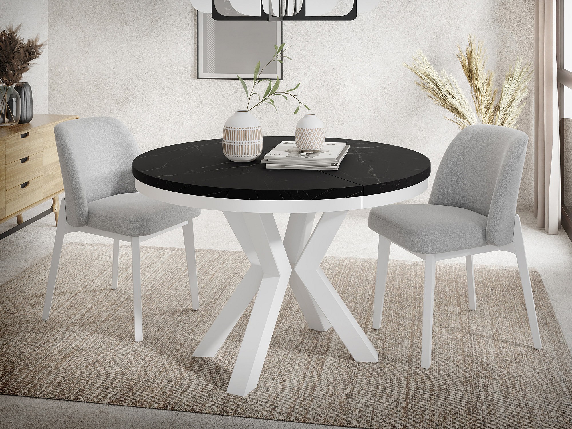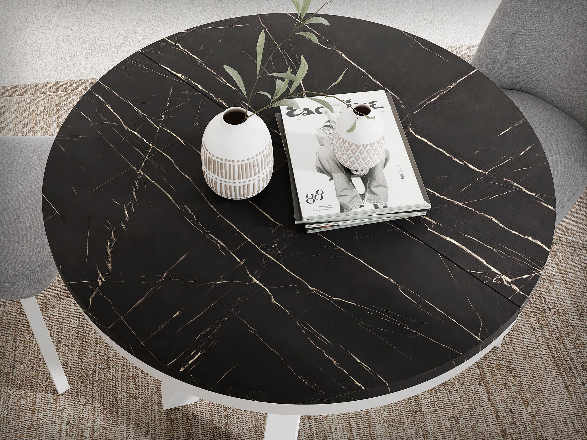 Runder Ausziehbarer Esstisch im Loft-Stil - Industrieller Tisch mit Weißen Metallbeinen - Platzsparender Tisch für Wohnzimmer - Marmor Schwarz - 120 bis 200 cm