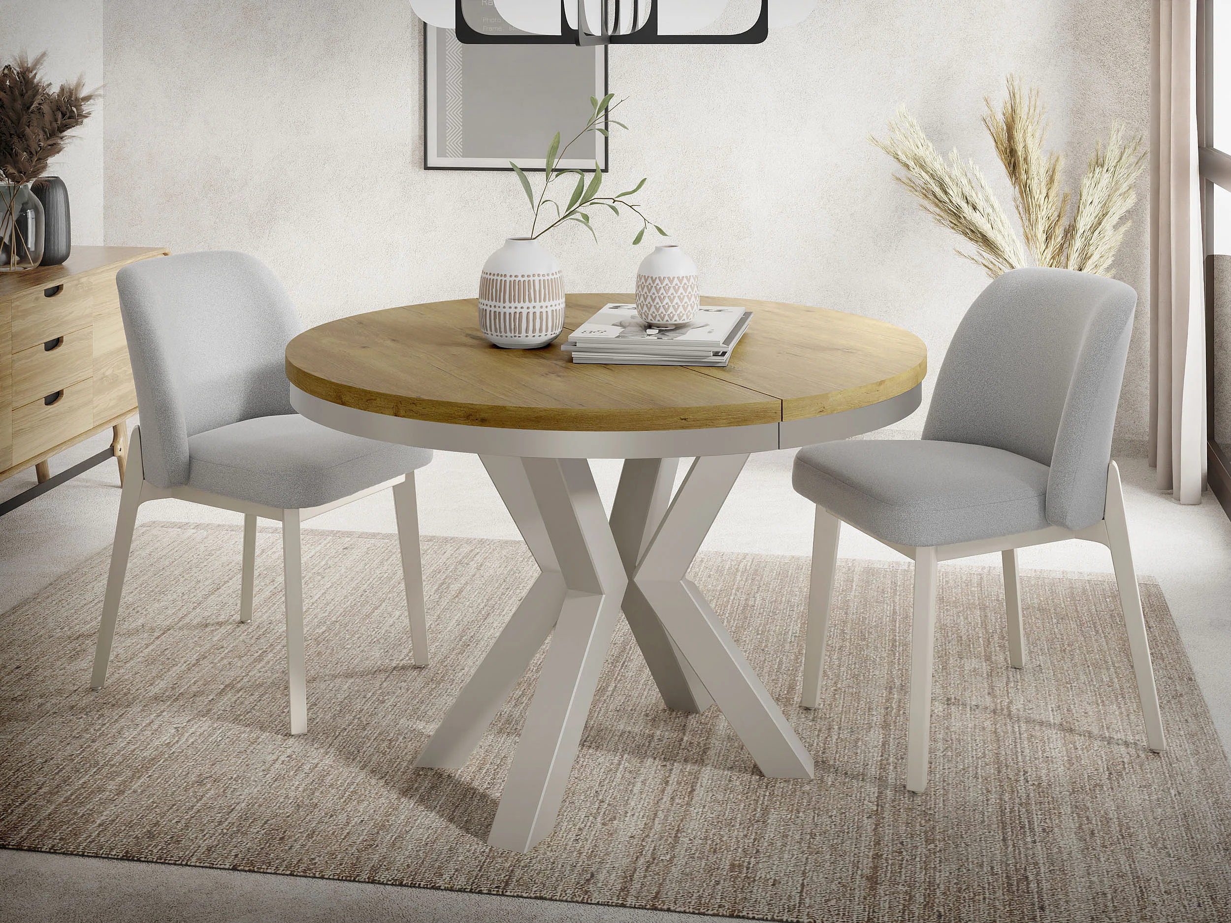 Runder Ausziehbarer Esstisch im Loft-Stil - Tisch mit grau-beige Metallbeinen - Platzsparender Tisch für Wohnzimmer - Lancelot Eiche - 120 bis 200 cm