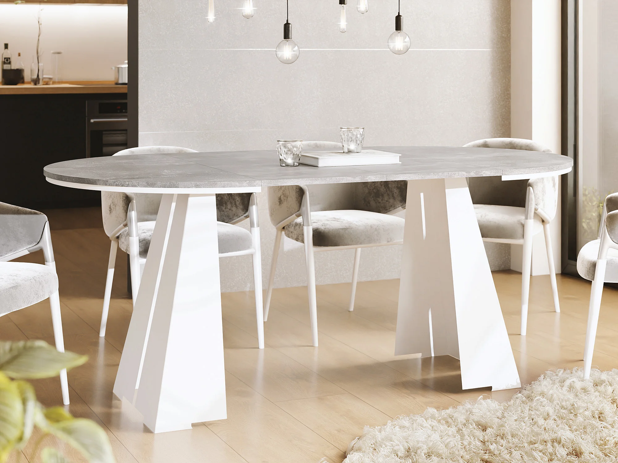Runder ausziehbarer Esstisch mit weißem Metallgestell - moderner industrieller Tisch für Esszimmer oder Küche - 120 cm bis 200 cm - Made in EU - Grauer Beton
