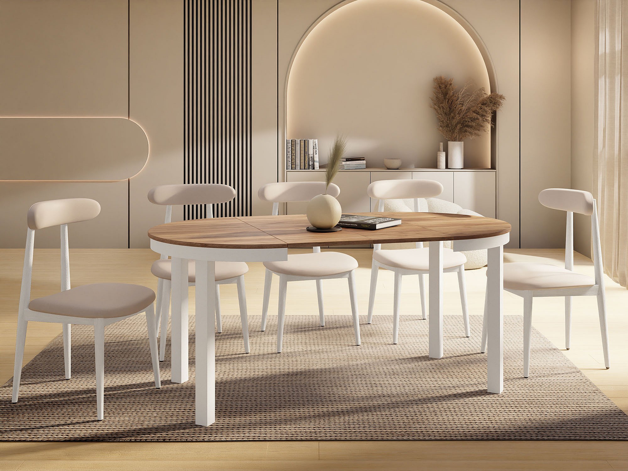 Runder Ausziehbarer Esstisch mit Weißem Metallgestell – Platzsparender Tisch im Loft-Stil für Wohnzimmer – Craft Eiche mit Weißen Metallbeinen – 100 bis 180 cm