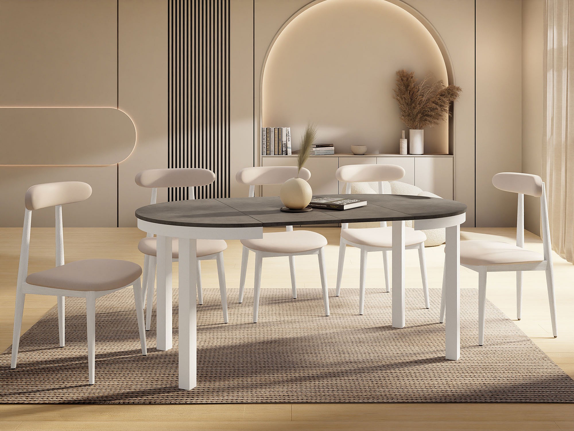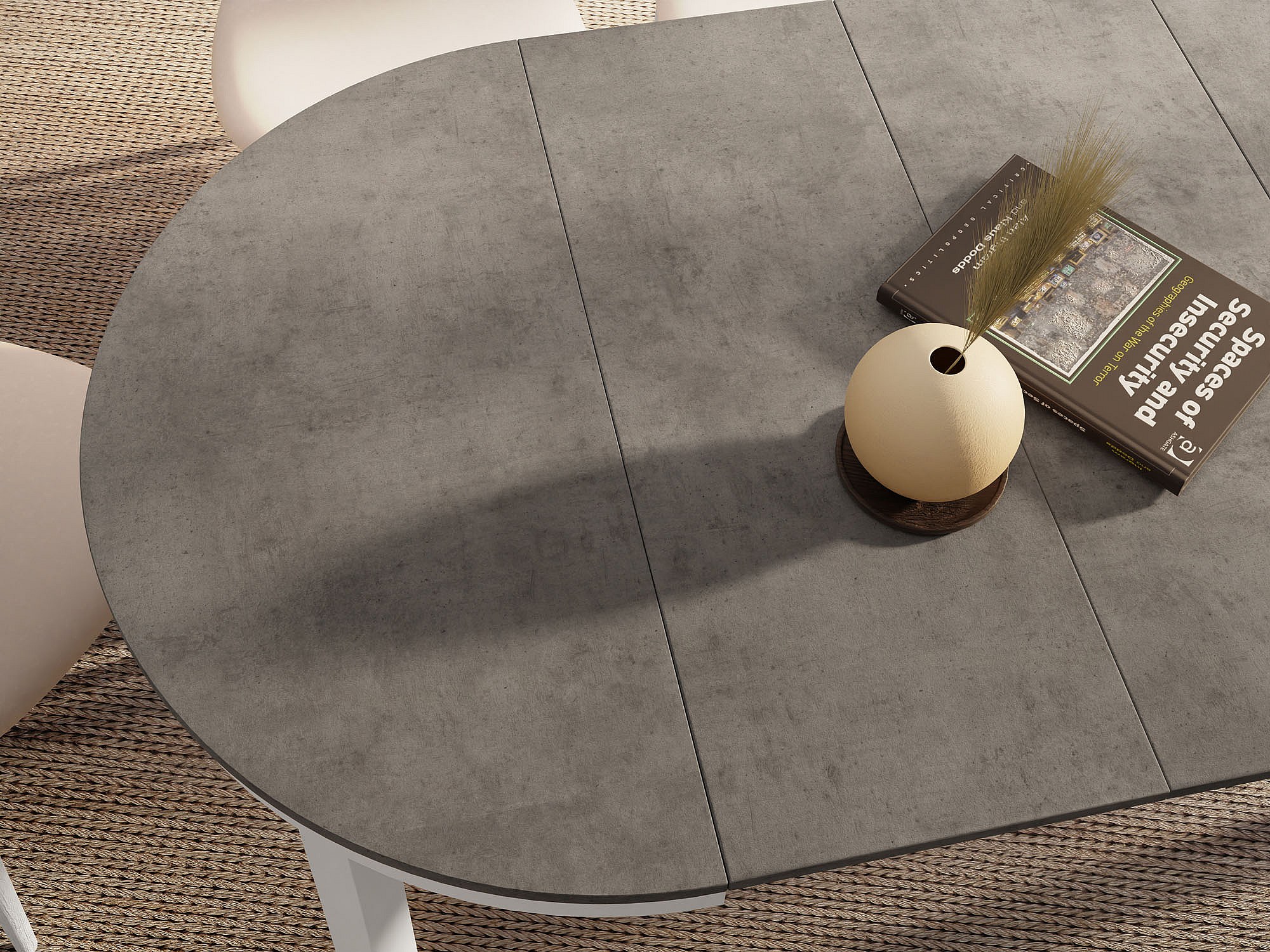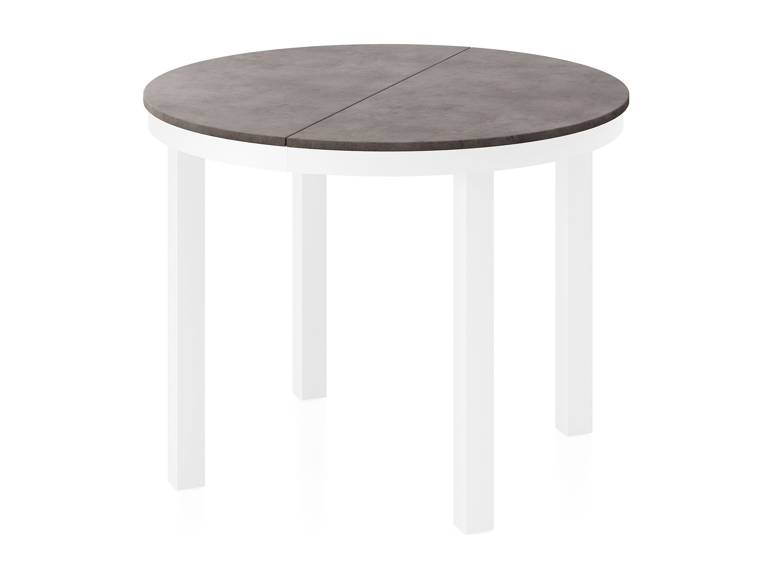 Runder Ausziehbarer Esstisch mit Weißem Metallgestell – Platzsparender Tisch im Loft-Stil für Wohnzimmer – Dunkelgrauer Beton mit Weißen Metallbeinen – 100 bis 180