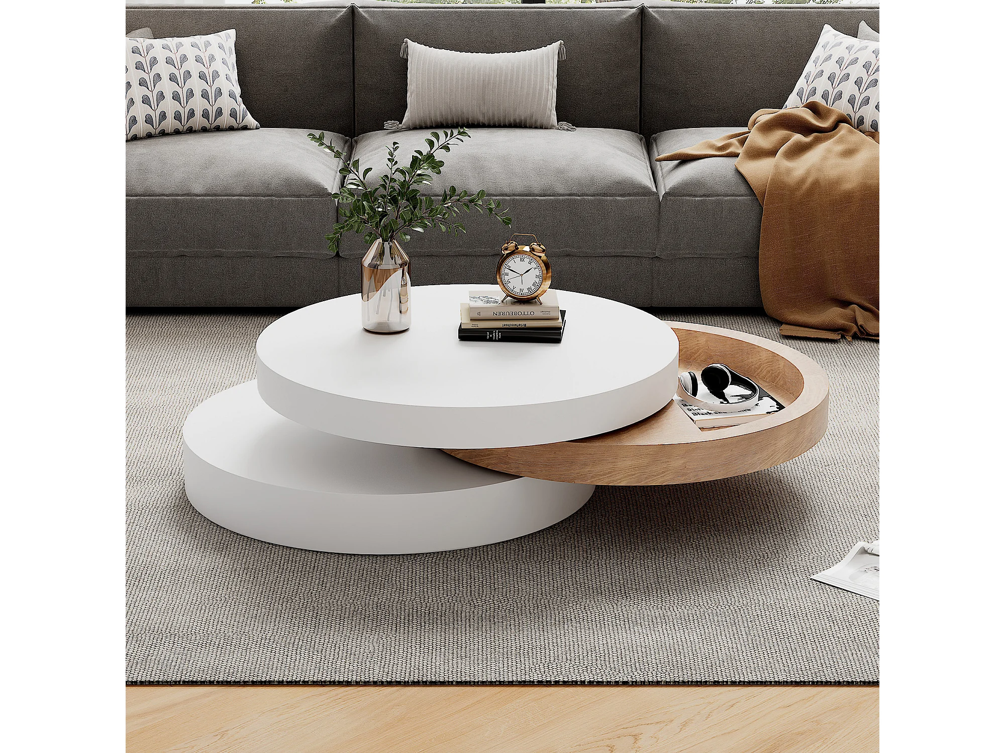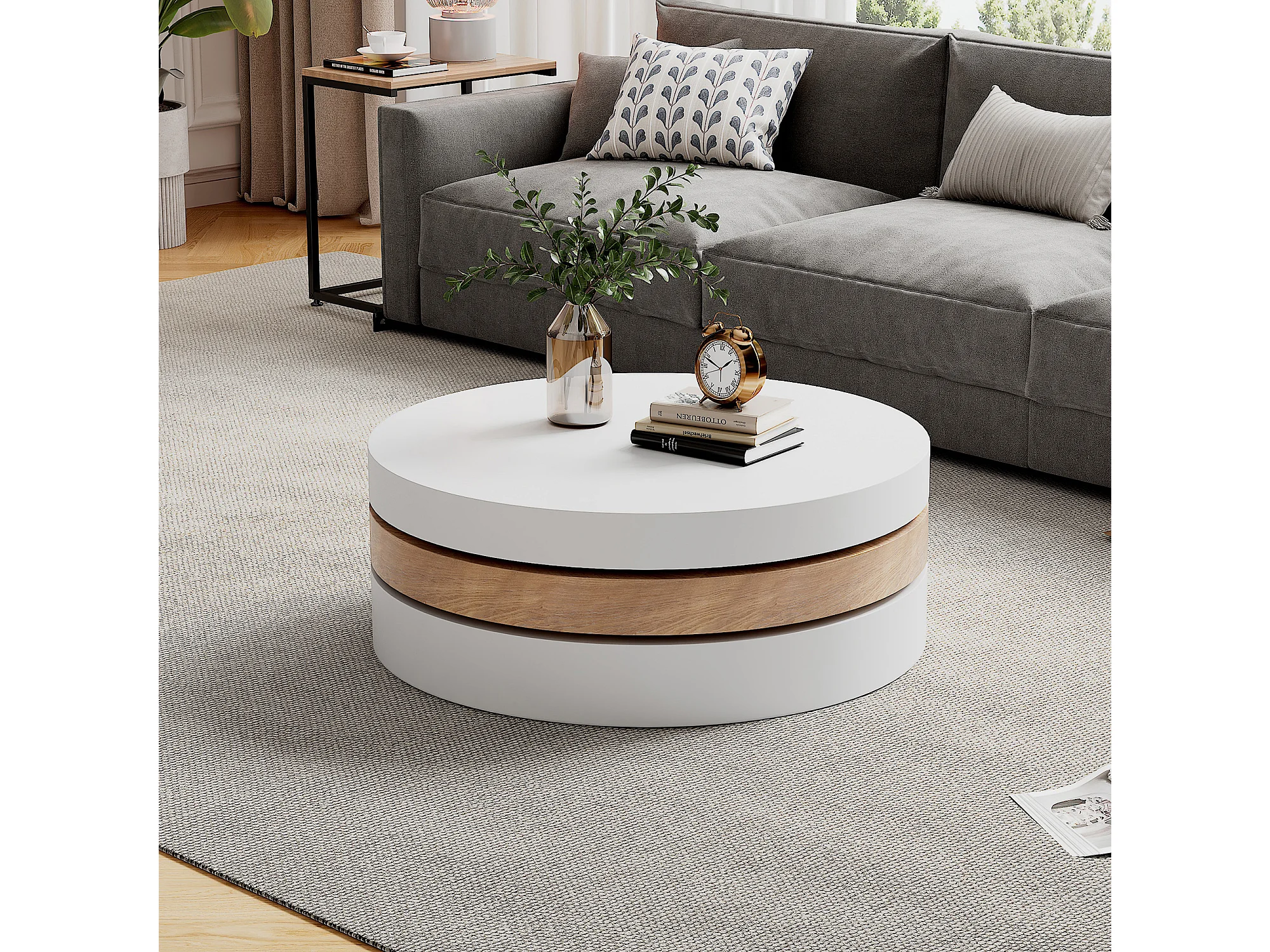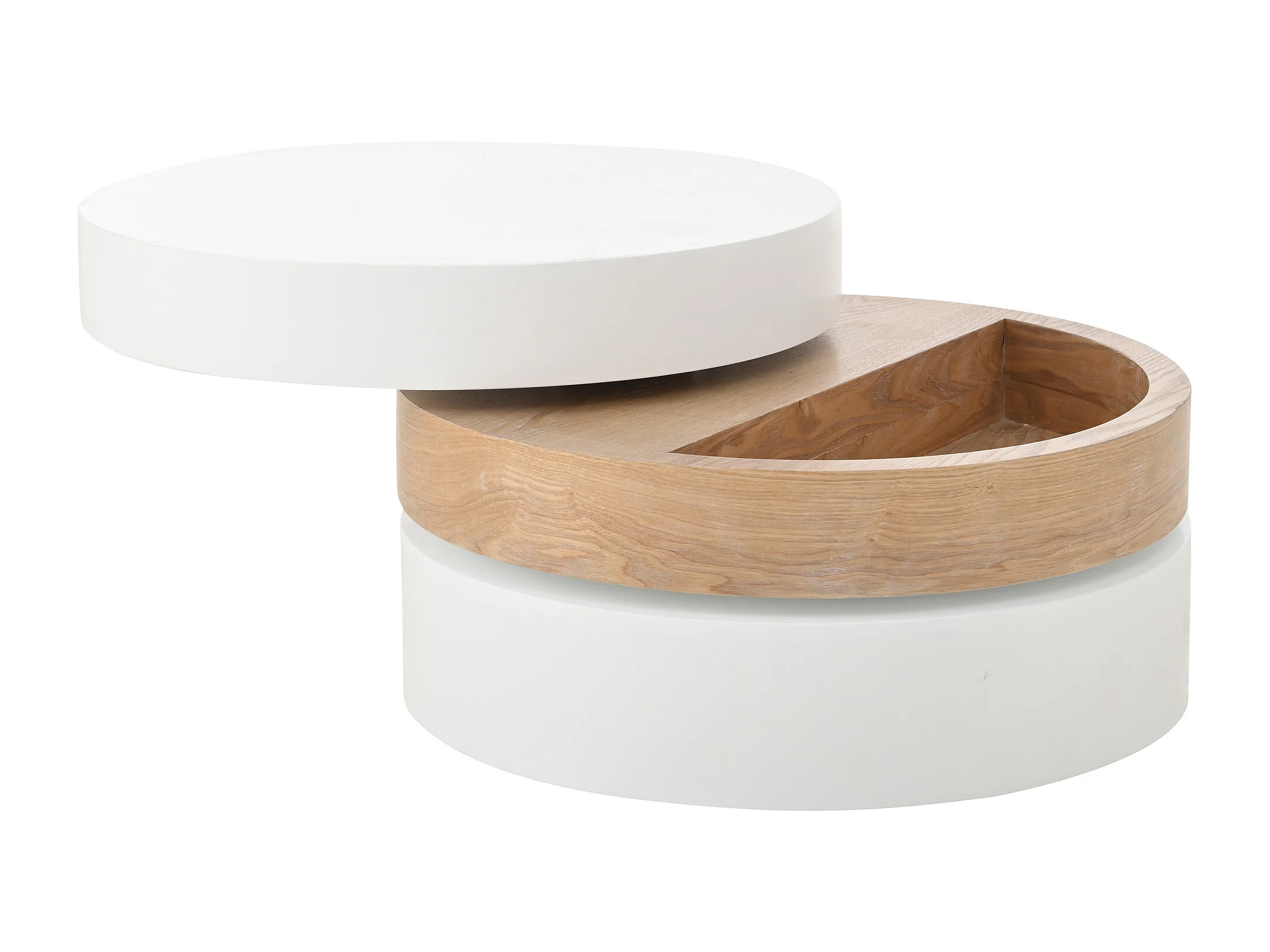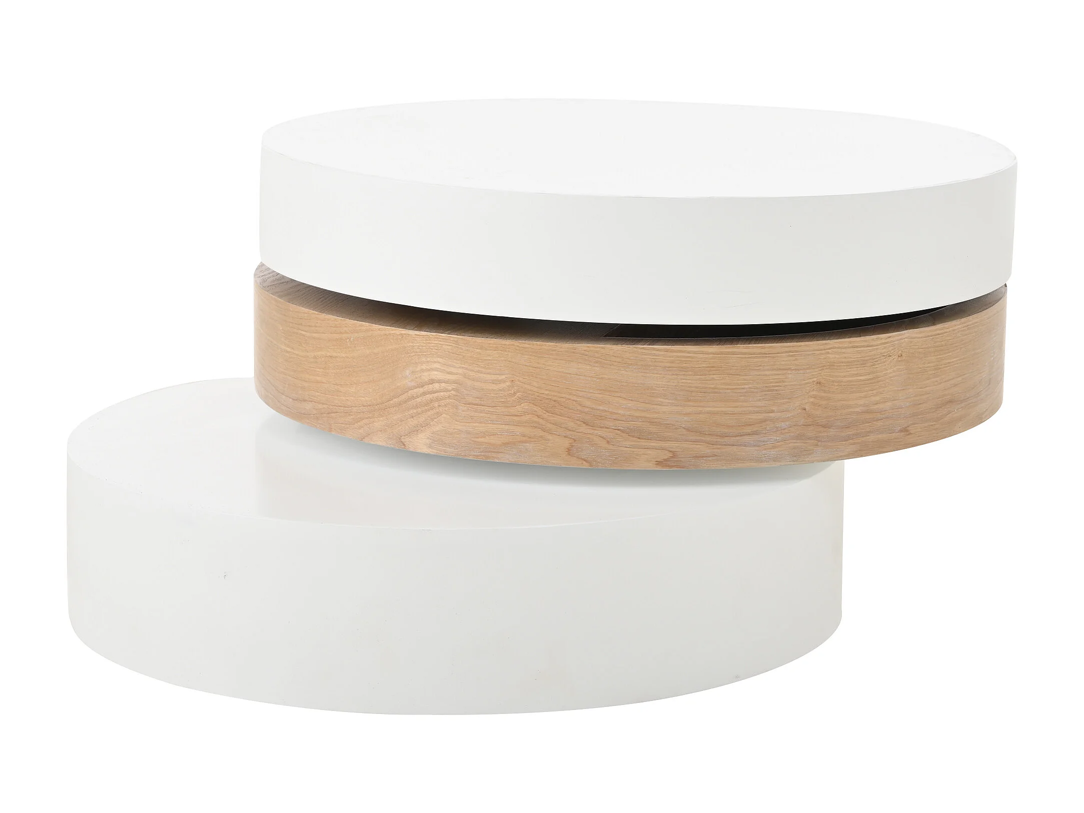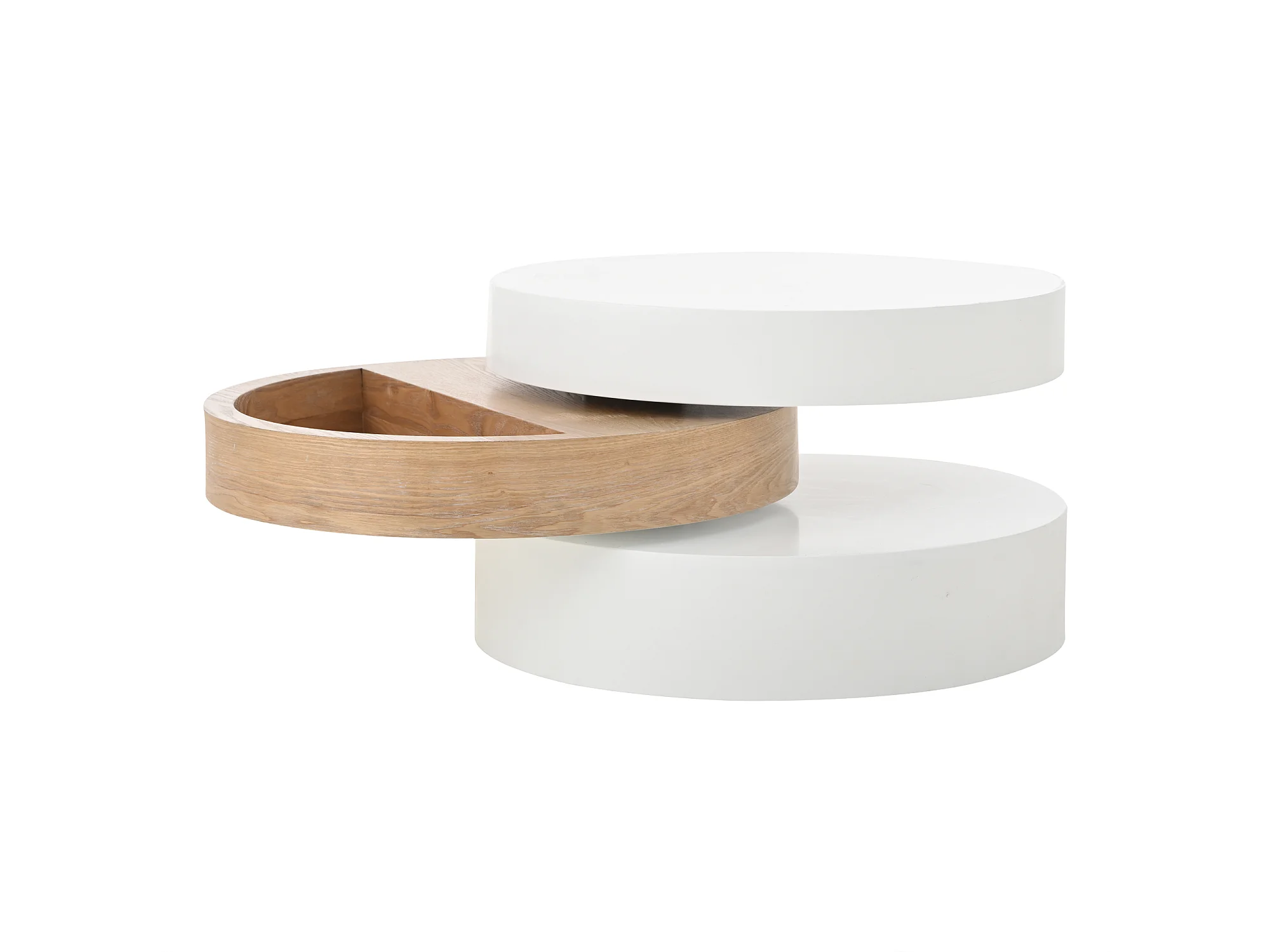 Runder Couchtisch – Dreistufiger Couchtisch mit Drehplatte – Weißes MDF – für das Wohnzimmer