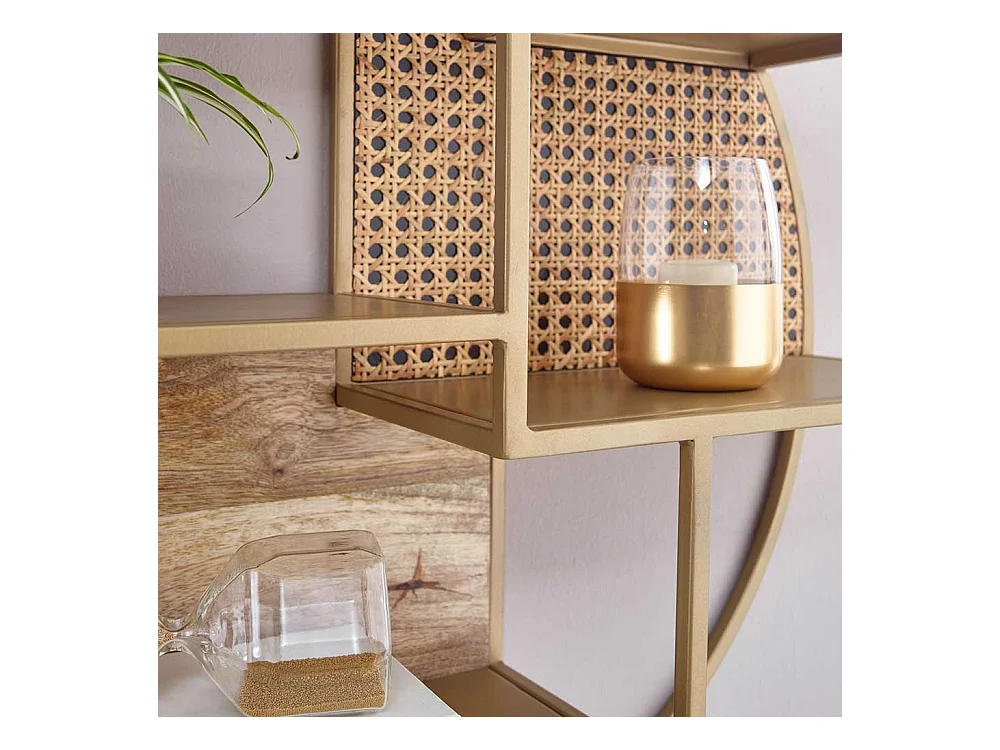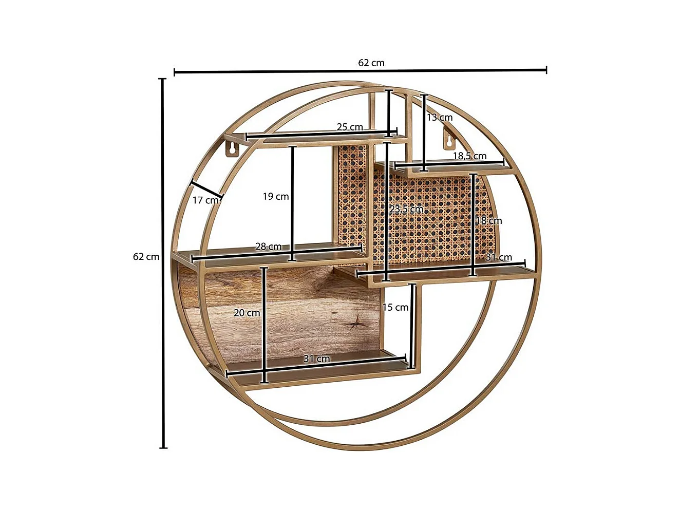 Rundes Wand Regal in Messingfarben Rattan und Metall