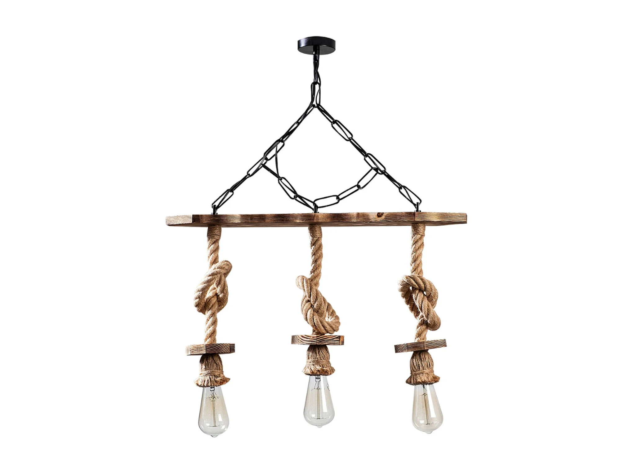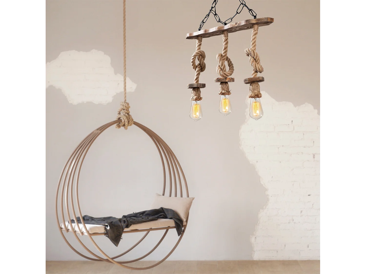 Rustikale Draht-Hängeleuchte mit 3 Lampen aus Seilen und Holz ZYA - Rustikaler, eleganter und zeitloser Stil