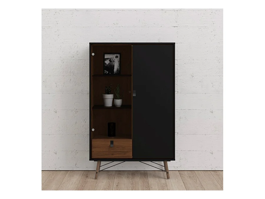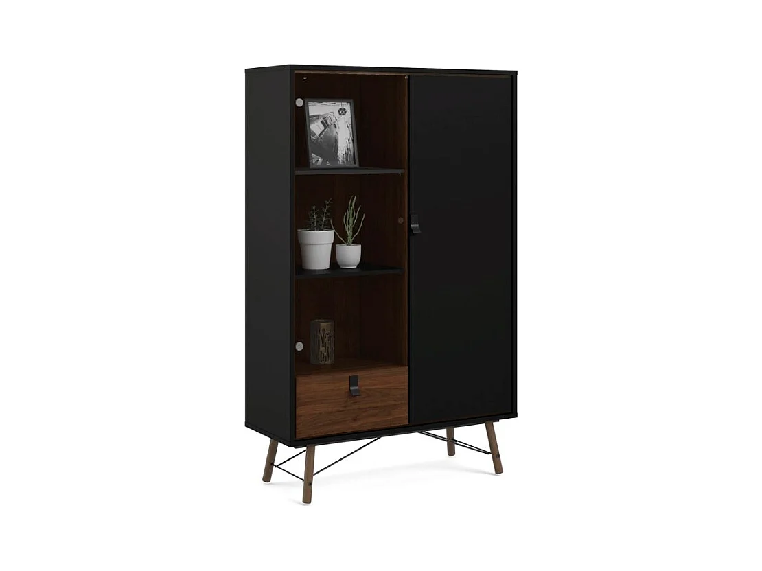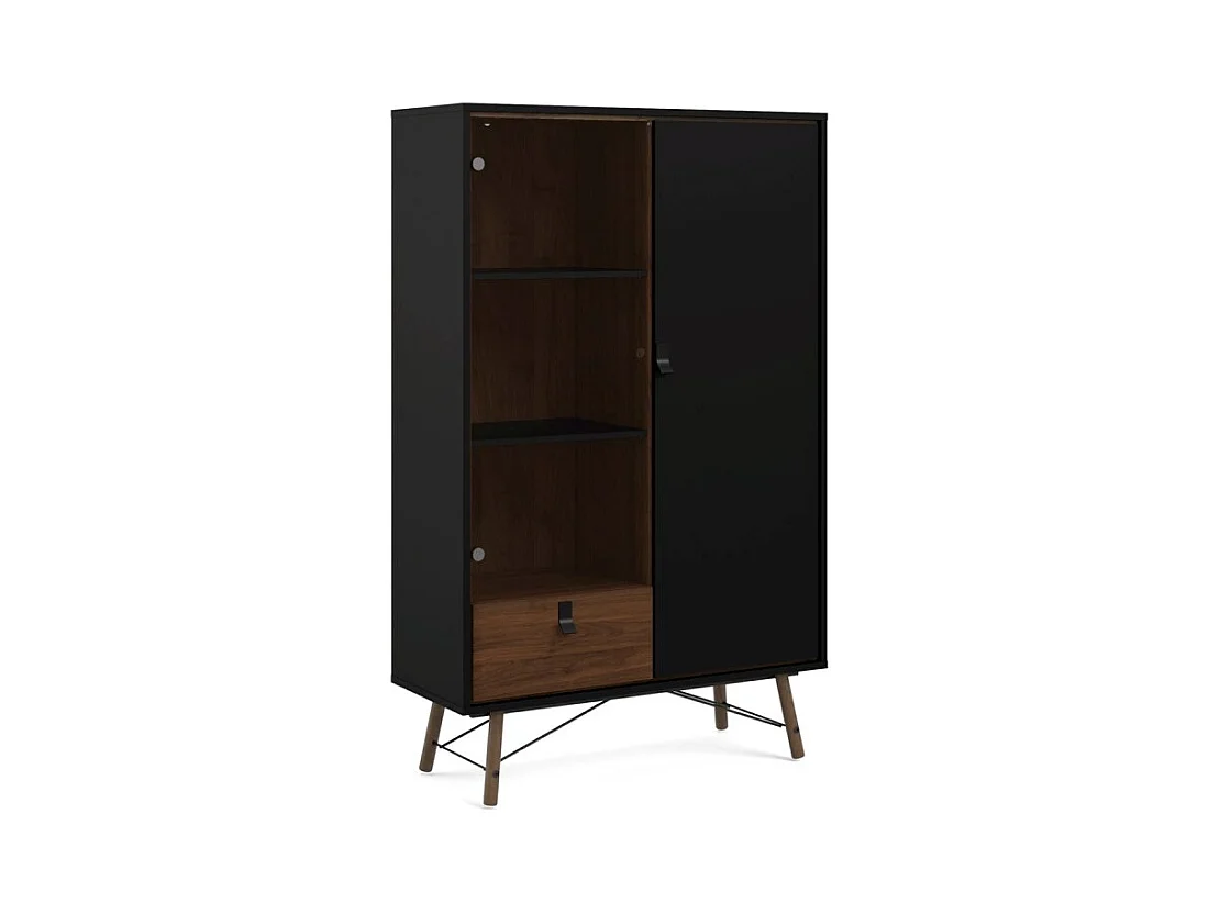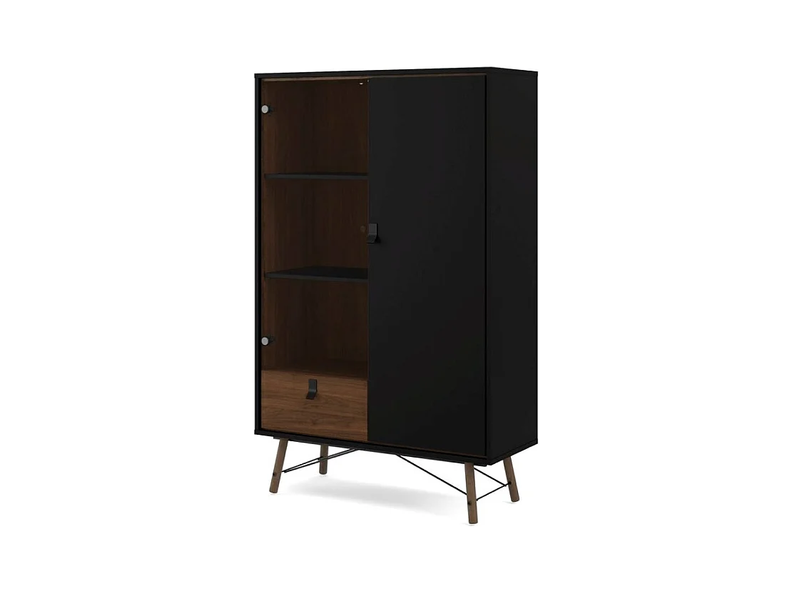 Rye Vitrinenschrank 1 Glastür, 1 Tür, 1 Schublade mattschwarz, wallnuss Dekor.