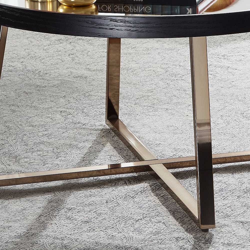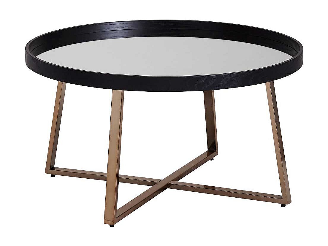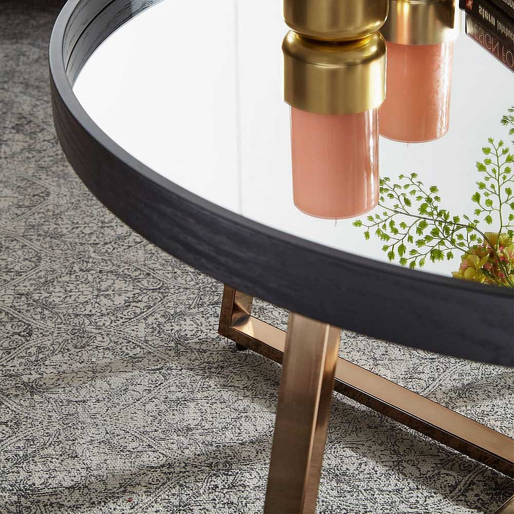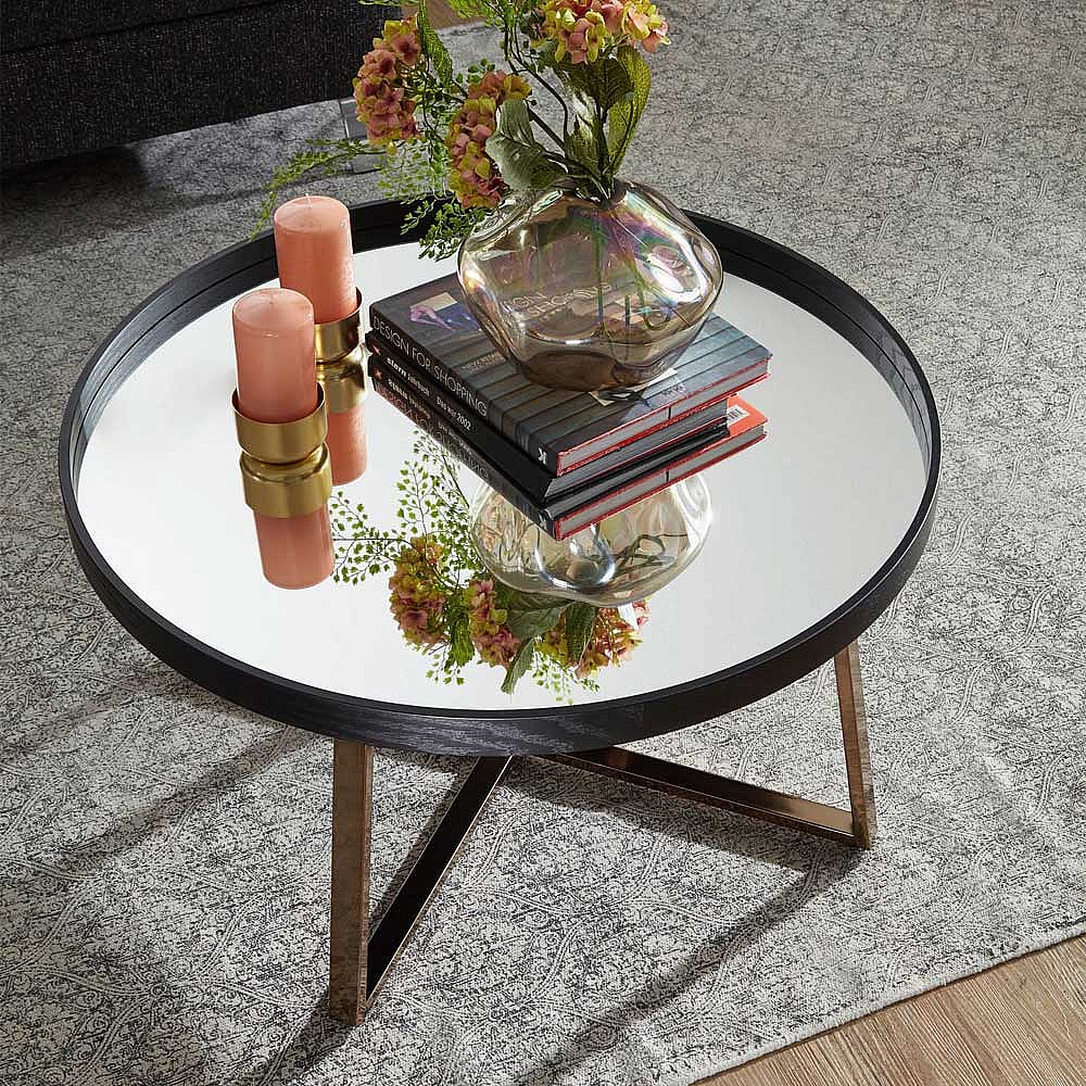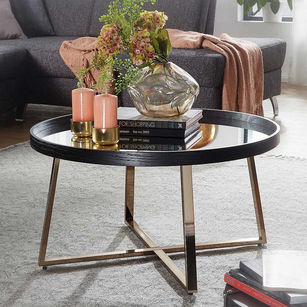 Salontisch in Schwarz und Altgoldfarben runder Spiegelglas Platte