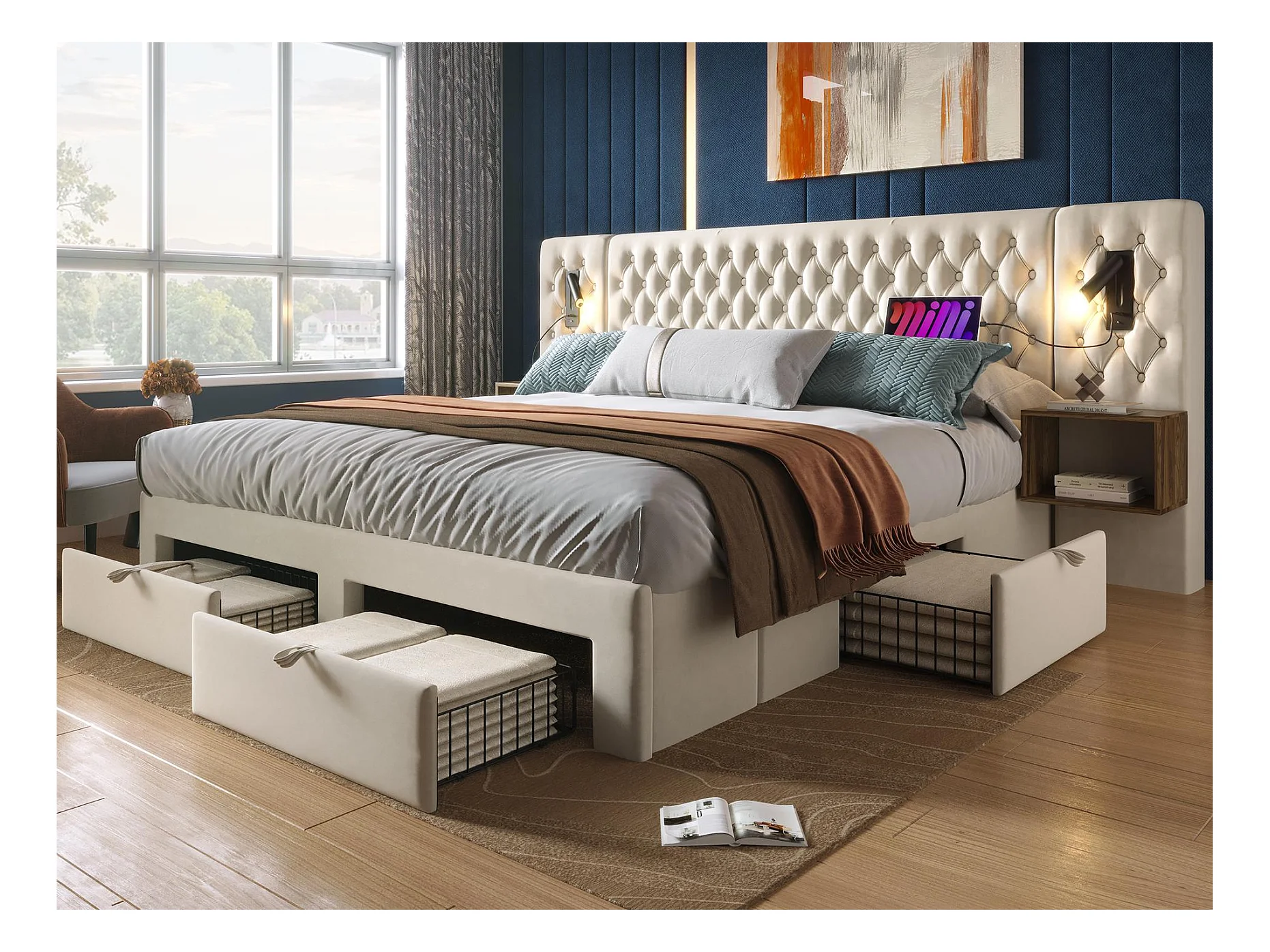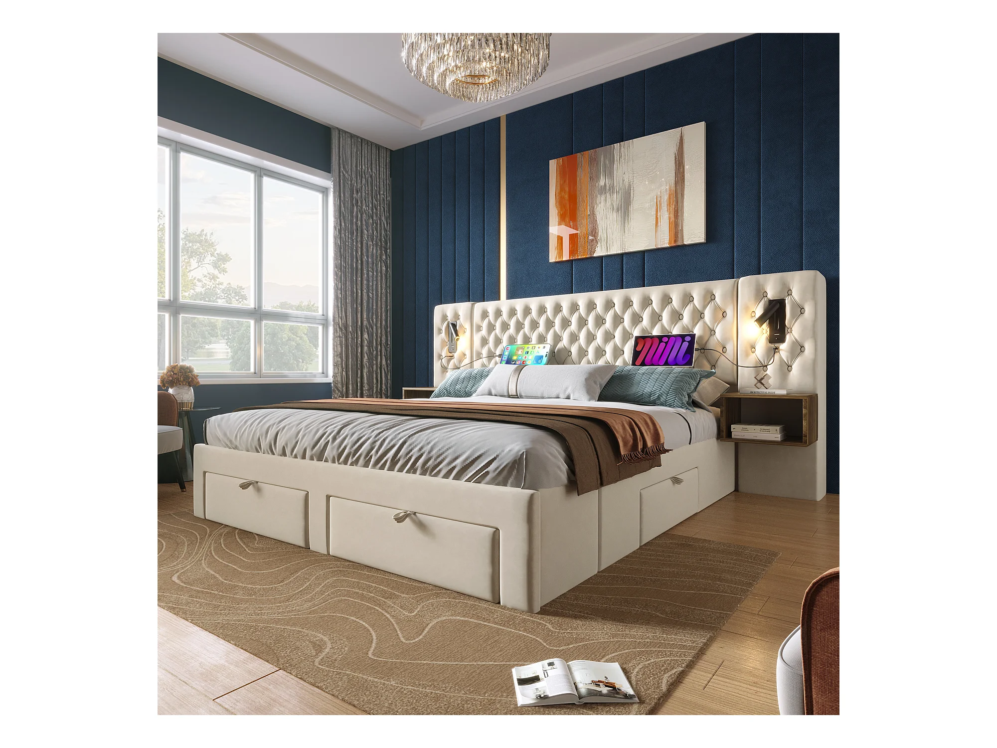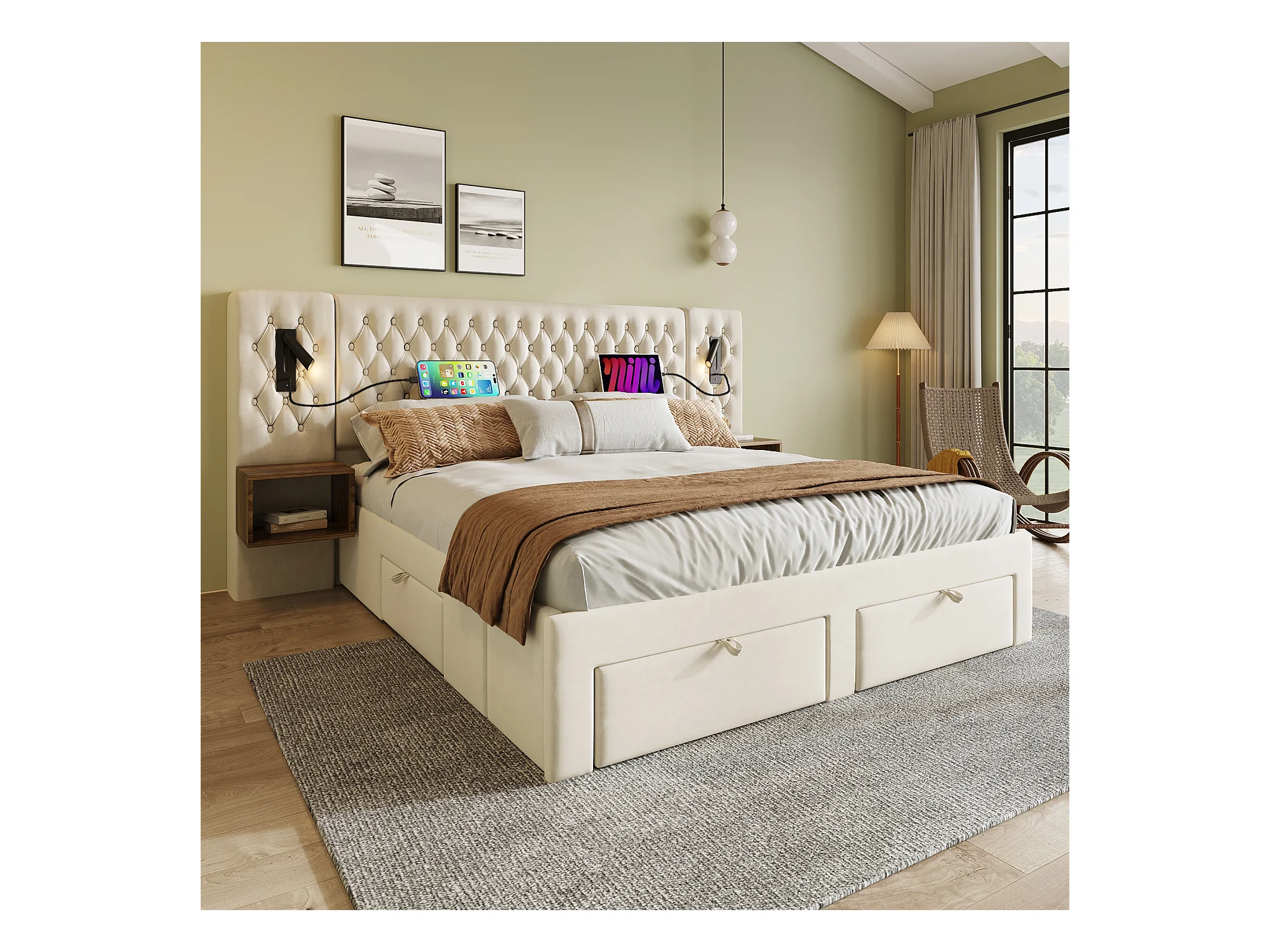 Samtbett für Erwachsene 160x200 cm – mit 2 Nachttischen und 4 Schubladen – 2 Leselampen mit USB-Anschluss – Beige (Matratze nicht im Lieferumfang enthalten)