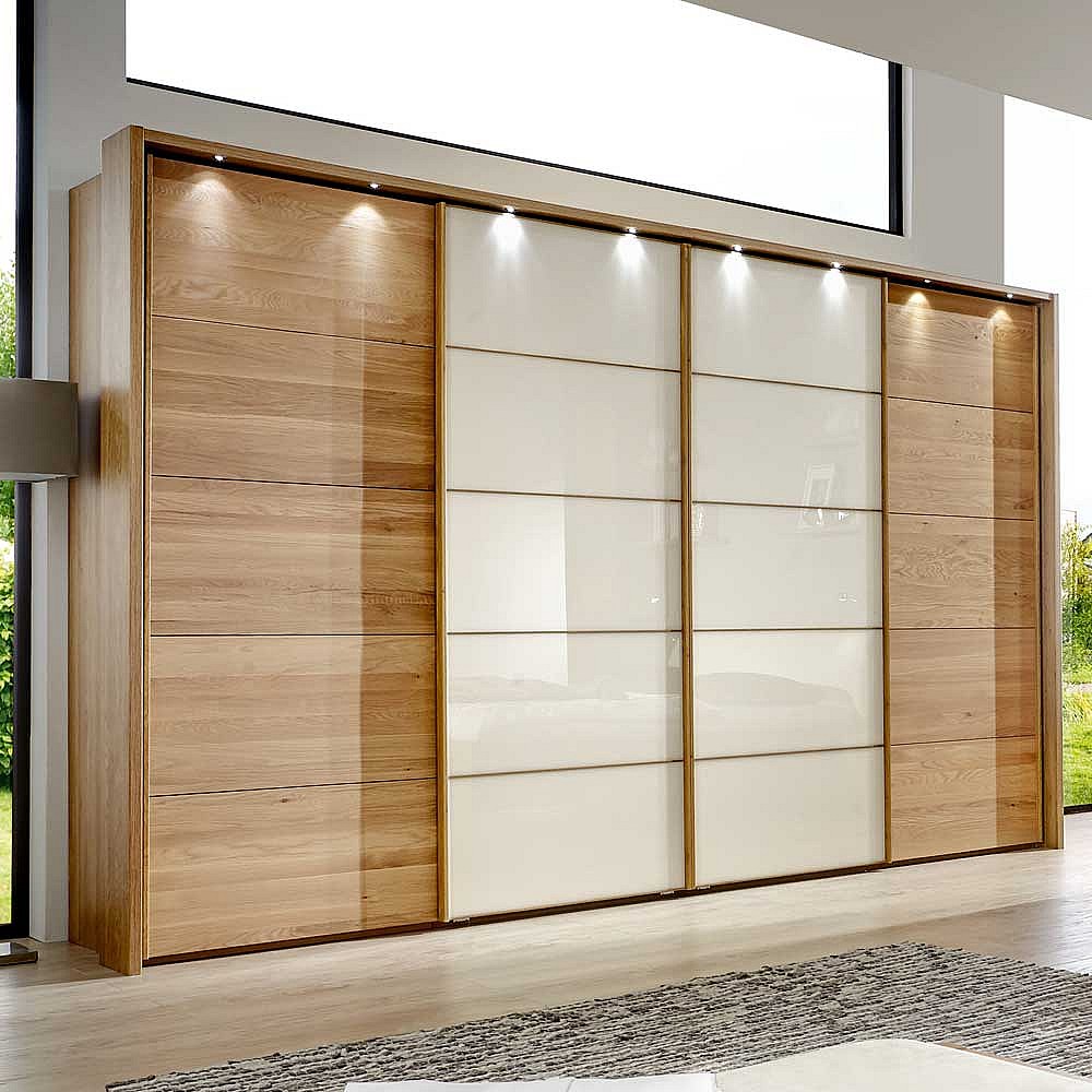 Schiebetürenschrank in Creme mit Eiche Massivholz